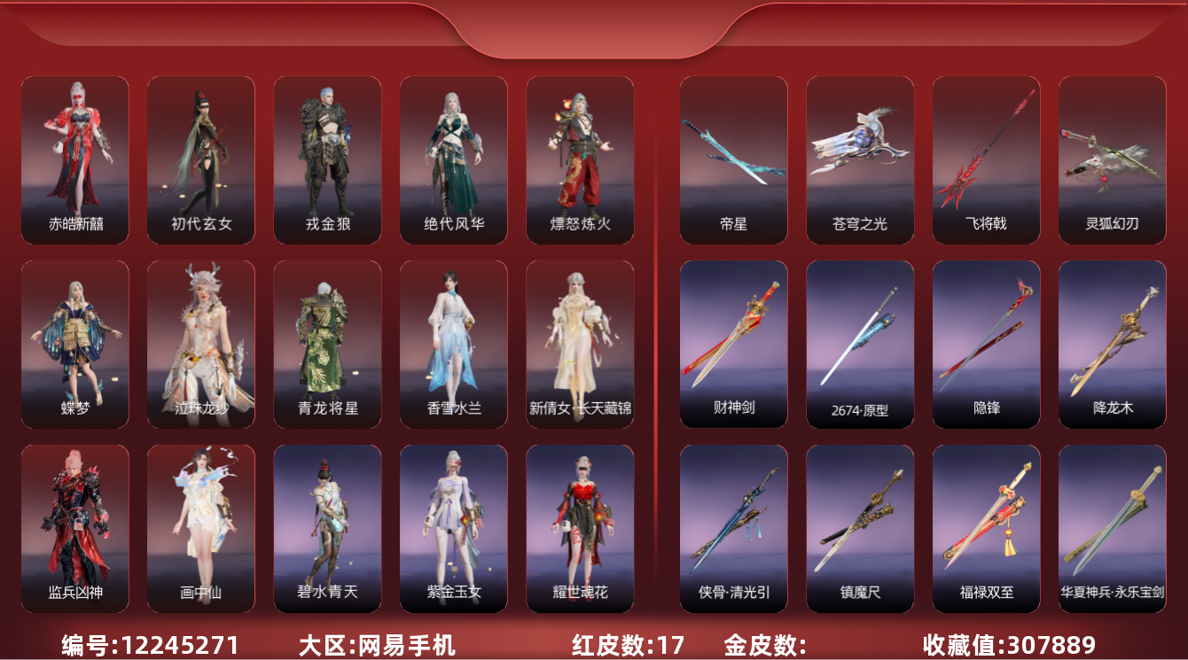 【云游堂】 R43584 网易【手机】【21红】【初代玄女+星辉魔纱+化生明王+戎金狼+熛怒炼火+蝶梦+泣珠龙纱+香雪水兰+沙漠香风+监兵凶神】【赤帝炎轮+少阳剑+帝星+龙雀+狼主+飞将戟+涯角+如意金箍棒+狂龙+毕方】【墨离】【千秋匠心凶虎】【秋藏桂+观山海腓腓+沐昭+星空投影+凛冬+赤阳天狐+妲己+日影花阴+念奴娇+日月明+如梦令】【2674原型+破劫千刃+腾云歌+千堆雪+诡月链魂+青花】【古币323512】【幻丝280993】详情请看图片【卖号买号首选亿梦】【11月16号可换绑】