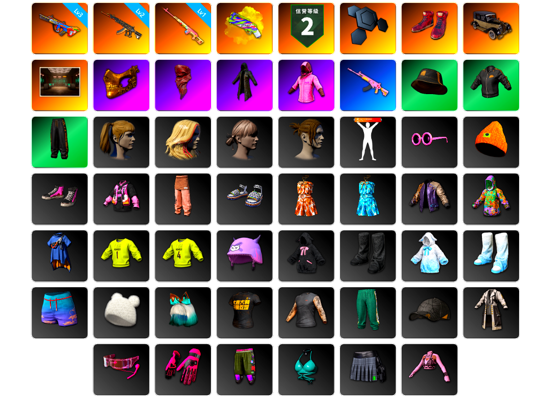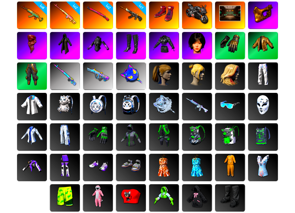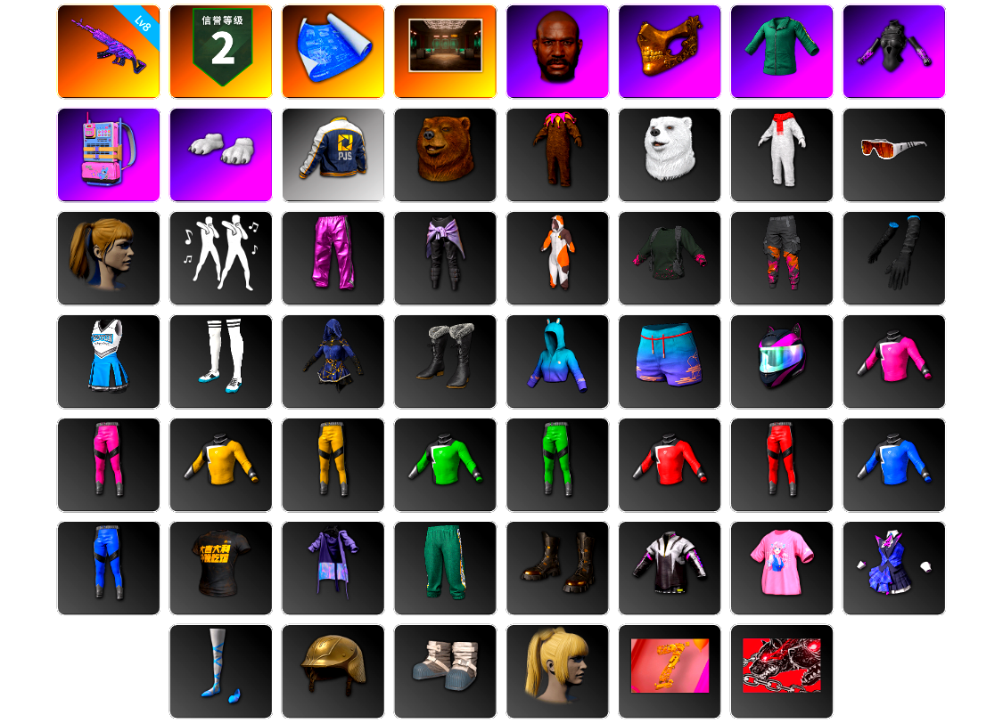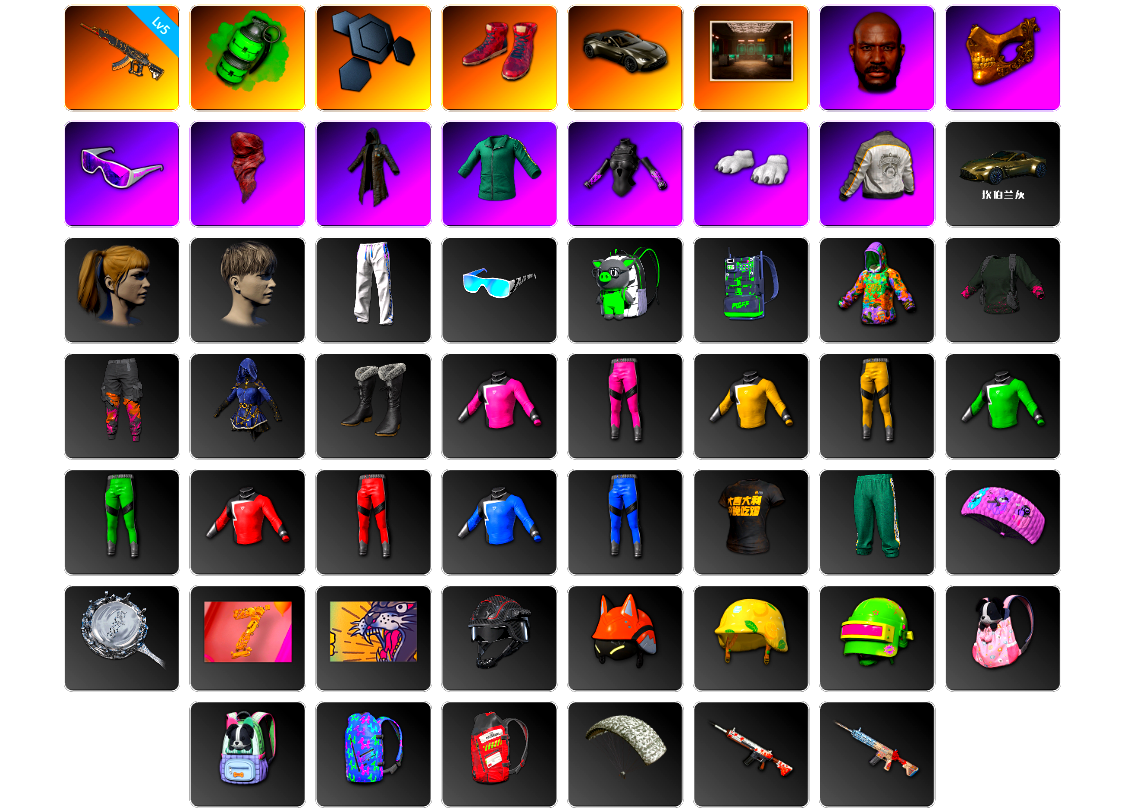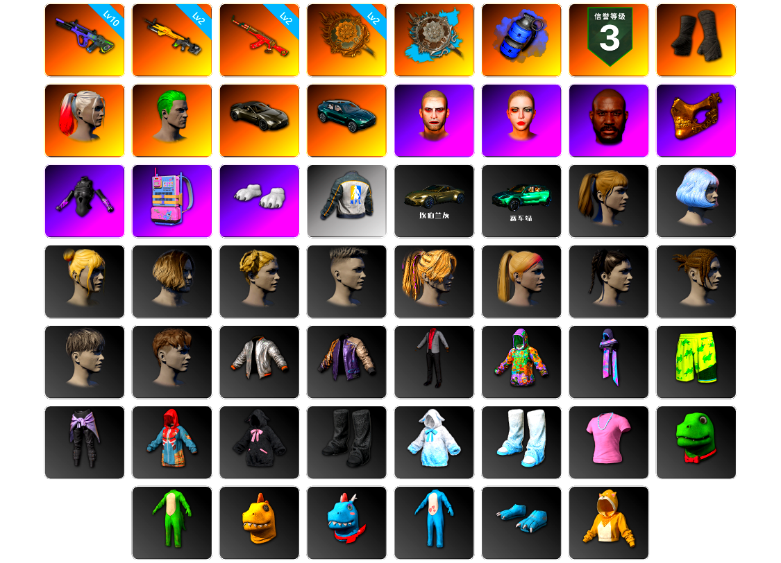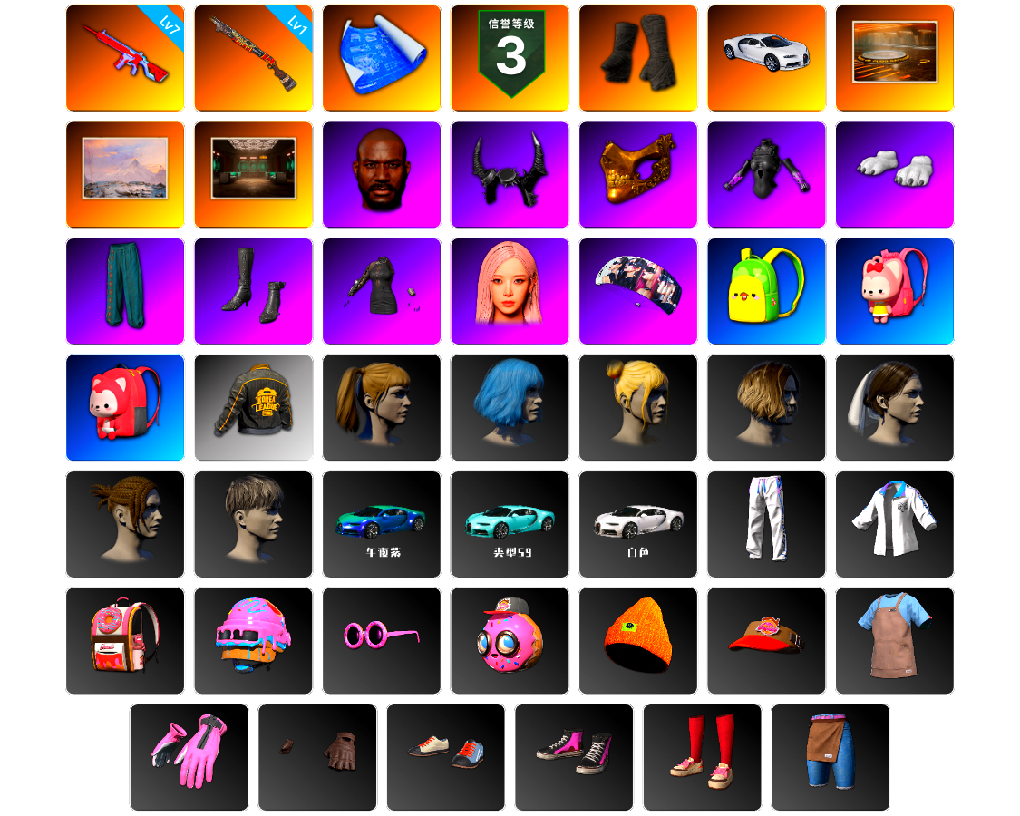 【云游堂】 [pz1358]10级霓虹aug 2级小兔mk12 2级圣诞ak 2级唐三藏平底锅 唐三藏(异色) 蓝色盐雾蛋 黑绷带 小丑女 小丑男 马丁跑车 马丁suv 丑男妆容 黑鬼 金面 发光手臂 电磁背包 白熊鞋 小马尾 丸子头 西游记 脏辫 小兔学院 悲喜 绷带ak pgc 2021套装 胜利之舞39