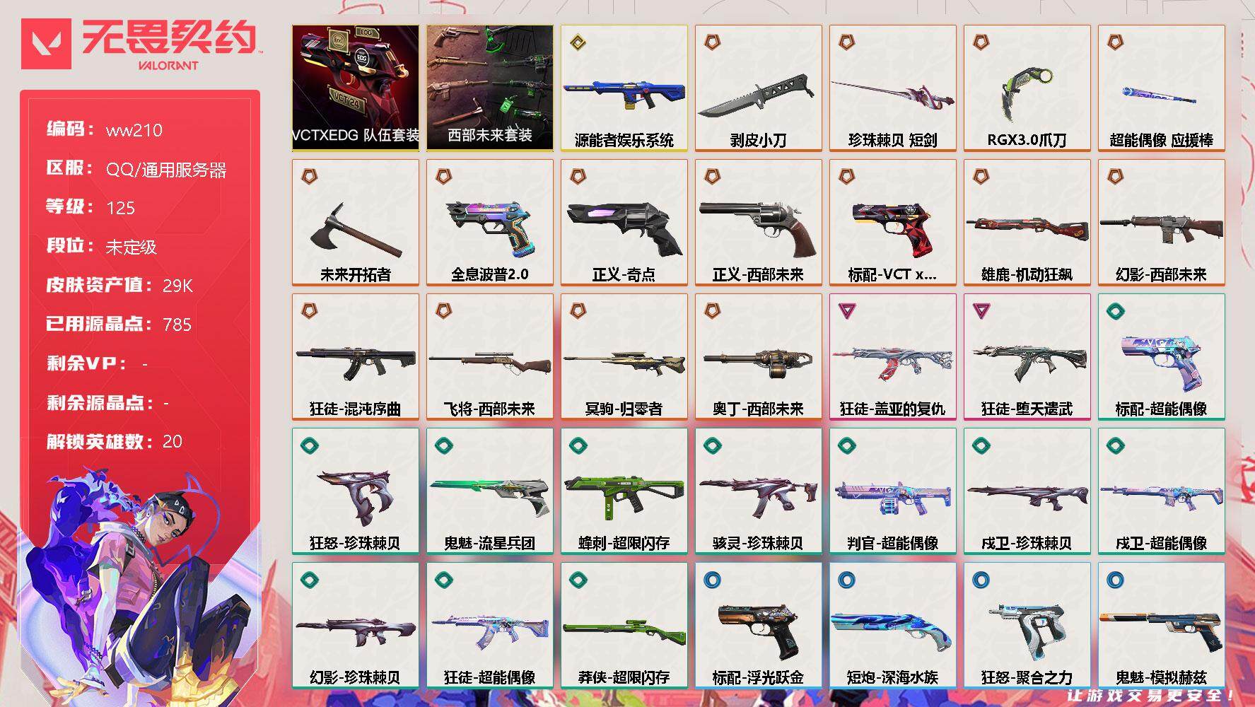 【云游堂】 【可二次实名】【ww210】【套装】:西部未来套装,VCTxEDG 队伍套装 【英雄】:幻棱,炼狱,维斯,暮蝶,钛狐,壹决,铁臂,捷风,幽影,不死鸟,贤者,猎枭,蝰蛇,零,芮娜,尚勃勒,星礈,K/O,盖可,黑梦 【近战 武器】:近战武器-剥皮小刀,近战武器-RGX 11z Pro//3.0 爪刀,近战武器-未来开拓者,近战武器-珍珠棘贝 短剑,近战武器-超能偶像 应援棒 【狂徒】:狂徒-混沌序曲,狂徒-堕天遗武,狂徒-盖亚的复仇,狂徒-超能偶像 【幻影】:幻影-源能者娱乐系统,幻影-西部未来,幻影-珍珠棘贝,幻影-聚合之力,幻影-西部未来 【戍卫】:戍卫-超能偶像,戍卫-珍珠棘贝,戍卫-浮光跃金 【獠犬】:獠犬-采蜜小蜂队,獠犬-复古浪潮 【冥驹】:冥驹-归零者,冥驹-复古浪潮,冥驹-模拟赫兹 【飞将】:飞将-西部未来,飞将-聚合之力 【莽侠】:莽侠-超限闪存,莽侠-深海水族 【战神】:战神-采蜜小蜂队,战神-浮光跃金,战神-深海水族 【奥丁】:奥丁-西部未来 【判官】:判官-超能偶像,判官-采蜜小蜂队 【雄鹿】:雄鹿-机动狂飙,雄鹿-复古浪潮,雄鹿-模拟赫兹 【骇灵】:骇灵-珍珠棘贝,骇灵-浮光跃金 【蜂刺】:蜂刺-超限闪存,蜂刺-聚合之力,蜂刺-深海水族 【标配】:标配-全息波普//2.0,标配-超能偶像,标配-浮光跃金 【VCT手枪】:标配-VCT x EDG 【正义】:正义-奇点,正义-西部未来,正义-复古浪潮,正义-纳米打击 【鬼魅】:鬼魅-流星兵团,鬼魅-采蜜小蜂队,鬼魅-模拟赫兹 【狂怒】:狂怒-珍珠棘贝,狂怒-聚合之力 【短炮】:短炮-深海水族 【卡面】:进入射程 卡面,《双城之战》拥抱 卡面,精灵大战 卡面,欢迎来到底城 卡面,南瓜盛典 卡面,VCT CN首冠 卡面,排除故障 卡面,战术桌游 卡面,悠享食光 卡面,修车达人 卡面,热舞环节 卡面,模拟赫兹 卡面,浮光跃金 卡面,超限闪存 卡面,维斯工牌 卡面,正义的化身 卡面,终章:生意人麦宝 卡面,铁之华 卡面,失而复得 卡面,时间到 卡面,最高舞台 卡面,复活专家 卡面,归乡 // 蝰蛇 卡面,RGX 11z Pro//3.0 卡面,超能偶像 卡面,生意人麦宝 卡面,音熊登场 卡面,树懒大作战 卡面,声感陷阱设计图 卡面,红鳞松叶 卡面,钢锁工牌 卡面,战术小伙伴的夏日 卡面,采蜜小蜂队 卡面,聚合之力 卡面,梦幻奶茶 卡面,终章:打造专属狂徒 卡面,趁热吃 卡面,西装暴徒 卡面,艺无止境//全球冠军赛 卡面,源能反应 卡面,零点嗅探设计图 卡面,终章:瓦娃脸雪糕 卡面,无畏契约:蝰蛇 卡面,表象之下 卡面,虹吸式咖啡壶 卡面,源能者美容 卡面,脚踝终结者 卡面 ,夜班 卡面,瓦娃脸雪糕 卡面 ,沙雕爆能器 卡面,无畏契约GO!第一卷:芮娜 卡面,深海水族 卡面,珍珠棘贝 卡面,复古浪潮 卡面,盖可工牌 卡面,清除名单 卡面,无畏契约GO!第一卷:零 卡面,无垠星环 卡面,《双城之战》金克丝 卡面,钢锁vs盖可 卡面,势不可挡//K/O 卡面,代号红色 卡面,新兵报到 卡面,V契约 卡面,无畏契约 卡面 【喷漆】:嗨宝南瓜灯 喷漆,嘭! 喷漆,都算到了 喷漆,控场勿近 喷漆,模拟赫兹 喷漆,高丽风情小熊 喷漆,蹲到一个 喷漆,全力集中 喷漆,超限闪存 喷漆,RUA一下 喷漆,熊抱 喷漆,蛋糕还是爆能器? 喷漆,高丽风情小虎 喷漆,记在小本本 喷漆,防弹企鹅 喷漆,高丽风情小蛙 喷漆,又被闪了 喷漆,终极羞辱 喷漆,超级粉丝 喷漆,黯兽卖萌 喷漆,捷风差距 喷漆,惊声尖叫 喷漆,水晶球 喷漆,2021冠军巡回赛花火 喷漆,五人成星 喷漆,超能偶像 喷漆,放我出去 喷漆,战术熊的巴拉莱卡琴 喷漆,审判之爪 喷漆,掩护我 喷漆,大佬发枪 喷漆,边缘试探 喷漆,拼一枪 喷漆,聚合之力 喷漆,采蜜小蜂队 喷漆,梦幻小队 喷漆,五个全都齐了 喷漆,我觉得不行 喷漆,我的刀呢? 喷漆,喜欢哪种毒? 喷漆,霓光四射 喷漆,情绪控制 喷漆,哨卫滑步 喷漆,倒吸一口凉气 喷漆,UWU 喷漆,逮到一个 喷漆,一个人的孤岛 喷漆,双人比心 喷漆,不予置评 喷漆,三熊合一 喷漆,要喝完噢! 喷漆,双击点赞 喷漆,珍珠棘贝 喷漆,深海水族 喷漆,禁止标配 喷漆 ,铁臂尴尬 喷漆,买装还是存钱 喷漆,关门放狗 喷漆,胜利属于无畏契约 喷漆,GLHF 喷漆,无畏契约 喷漆 【挂饰】:终章:猫猫木乃伊 挂饰,悠闲鸡块 挂饰,伞绳 挂饰,《双城之战》小蛋糕 挂饰,第九季//第三幕 纪念币 挂饰,暗藏猫腻 挂饰,高丽风情 挂饰,鱼骨头 挂饰,熔岩灯 挂饰,超限闪存 挂饰,瞬云履 挂饰,迷你K/O 挂饰,模拟赫兹 挂饰,第九季//第二幕 纪念币 挂饰,薰衣草之心 挂饰,终章:这瓜保熟 挂饰,炼狱雪糕 挂饰