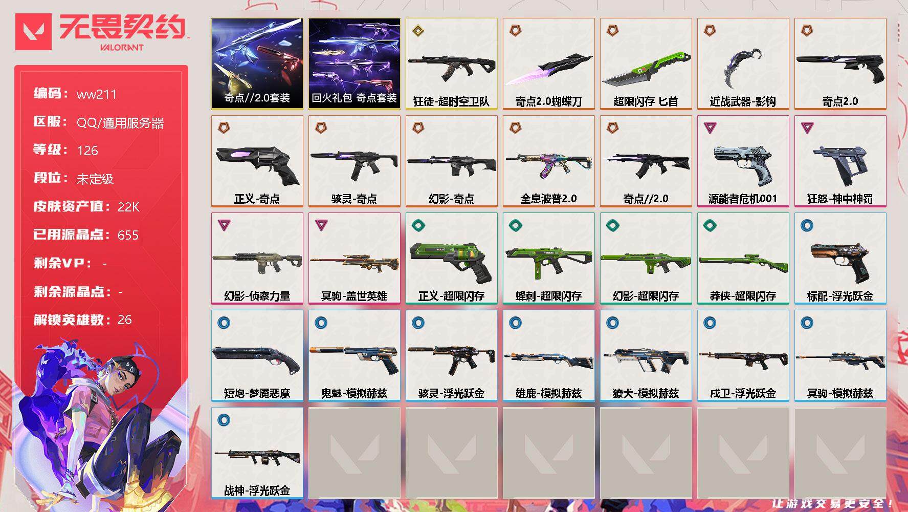 【云游堂】 【可二次实名】【ww220】【英雄】:幻棱,炼狱,维斯,暮蝶,钛狐,壹决,铁臂,捷风,雷兹,幽影,不死鸟,贤者,猎枭,零,芮娜,奇乐,尚勃勒,霓虹,斯凯,夜露,星礈,K/O,盖可,黑梦,钢锁 【近战 武器】:近战武器-RGX 11z Pro//2.0 蝴蝶刀,近战武器-威龙之刃,近战武器-荒土机兵 热能刀,近战武器-神圣领域 战刀 【狂徒】:狂徒-艾沃莉的梦之翼,狂徒-混沌序曲,狂徒-塑水宗,狂徒-盖亚的复仇,狂徒-紫阙金琅,狂徒-离子武器//2.0,狂徒-荒土机兵 【幻影】:幻影-神圣领域,幻影-纳米打击 【戍卫】:戍卫-逆冲蛮牛,戍卫-月球哨兵 【獠犬】:獠犬-神圣领域,獠犬-逆冲蛮牛 【冥驹】:冥驹-源能者娱乐系统,冥驹-荒土机兵,冥驹-星云暗涌 【莽侠】:莽侠-月球哨兵 【战神】:战神-神圣领域 【奥丁】:奥丁-纳米打击 【判官】:判官-纳米打击x 【雄鹿】:雄鹿-逆冲蛮牛,雄鹿-月球哨兵 【骇灵】:骇灵-荒土机兵,骇灵-星云暗涌 【蜂刺】:蜂刺-星云暗涌 【标配】:标配-荒土机兵 【正义】:正义-西部未来,正义-掠影,正义-纳米打击,正义-月球哨兵 【鬼魅】:鬼魅-盖亚的复仇,鬼魅-星云暗涌 【狂怒】:狂怒-神圣领域,狂怒-逆冲蛮牛 【卡面】:终章:激斗汉堡 卡面,进入射程 卡面,分崩离析 卡面,纳米打击 卡面,抑制技术 卡面,激斗汉堡 卡面,瓦娃脸雪糕 P2 卡面,从黄昏到黎明 卡面,荒土机兵 卡面,银弹猎手 卡面,逆冲蛮牛 卡面,《双城之战》拥抱 卡面,精灵大战 卡面,欢迎来到底城 卡面,南瓜盛典 卡面,修车达人 卡面,正义的化身 卡面,声感陷阱设计图 卡面,梦幻奶茶 卡面,零点嗅探设计图 卡面,无畏契约GO!第一卷:芮娜 卡面,清除名单 卡面,无畏契约GO!第一卷:零 卡面,暗枪 卡面,铁臂设计图 卡面,代号红色 卡面,冰淇淋店 卡面,新兵报到 卡面,V契约 卡面,无畏契约 卡面 【喷漆】:小小心意 喷漆,战“素”兔 喷漆,宇宙的指引 喷漆,请求重启 喷漆,逆冲蛮牛 喷漆,纳米打击 喷漆,鼻尖上的蝴蝶 喷漆,简笔画黯兽 喷漆,独守蝰腹 喷漆,他们将落荒而逃 喷漆,通缉:战术企鹅 喷漆,荒土机兵 喷漆,别挡我吃球! 喷漆,嗨宝南瓜灯 喷漆,嘭! 喷漆,都算到了 喷漆,控场勿近 喷漆,熊抱 喷漆,超级粉丝 喷漆,捷风差距 喷漆,拼一枪 喷漆,新潮流 喷漆,买装还是存钱 喷漆,胜利属于无畏契约 喷漆,GLHF 喷漆,无畏契约 喷漆 【挂饰】:终章:猫猫木乃伊 挂饰,荒土机兵 挂饰,悠闲鸡块 挂饰,猫猫木乃伊 挂饰,水壶 挂饰,纳米打击 挂饰,逆冲蛮牛 挂饰,可爱糖糖 挂饰,伞绳 挂饰,《双城之战》小蛋糕 挂饰,第九季//第三幕 纪念币 挂饰,无畏契约GO!第一卷 芮娜 挂饰,无畏契约GO!第一卷 零 挂饰,熔岩灯 挂饰,瞬云履 挂饰,第九季//第二幕 纪念币 挂饰,袖珍捷风 挂饰,第九季//第一幕 纪念币 挂饰,天外飞客 挂饰,第八季//第一幕 纪念币 挂饰,无畏契约 纪念币 挂饰
