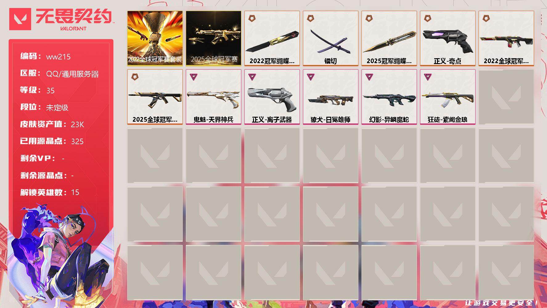 【云游堂】 【可二次实名】【ww215】【套装】:2025全球冠军赛套装,2022全球冠军赛套装 【英雄】:炼狱,维斯,暮蝶,壹决,铁臂,捷风,幽影,不死鸟,贤者,猎枭,零,芮娜,夜露,黑梦,钢锁 【近战 武器】:近战武器-2025全球冠军赛 蝴蝶刀,近战武器-2022全球冠军赛 蝴蝶刀,近战武器-镭切 【狂徒】:狂徒-2025全球冠军赛,狂徒-紫阙金琅 【幻影】:幻影-2022全球冠军赛,幻影-异鳞魔蛇 【獠犬】:獠犬-日冕雄师 【正义】:正义-奇点,正义-离子武器 【鬼魅】:鬼魅-天界神兵 【卡面】:树懒大作战 卡面,红鳞松叶 卡面,《双城之战》金克丝 卡面,无畏契约GO!第一卷:贤者 卡面,代号红色 卡面,新兵报到 卡面,V契约 卡面,无畏契约 卡面 【喷漆】:买装还是存钱 喷漆,胜利属于无畏契约 喷漆,GLHF 喷漆,无畏契约 喷漆 【挂饰】:无畏契约GO!第一卷 零 挂饰,无畏契约 纪念币 挂饰