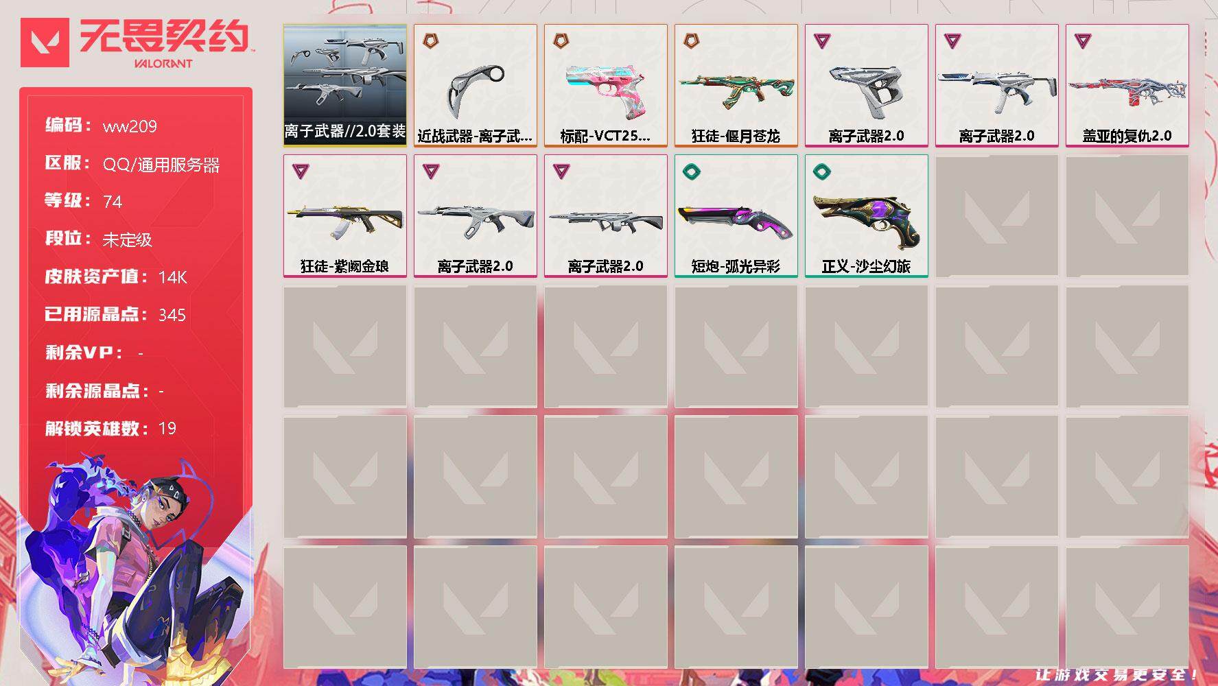 【云游堂】 【可二次实名】【ww209】【套装】:离子武器//2.0套装 【英雄】:幻棱,炼狱,维斯,壹决,捷风,雷兹,幽影,不死鸟,贤者,猎枭,蝰蛇,零,芮娜,奇乐,尚勃勒,斯凯,夜露,K/O,钢锁 【近战 武器】:近战武器-离子武器//2.0 爪刀 【狂徒】:狂徒-偃月苍龙,狂徒-紫阙金琅,狂徒-离子武器//2.0 【幻影】:幻影-盖亚的复仇//2.0 【战神】:战神-离子武器//2.0 【骇灵】:骇灵-离子武器//2.0 【VCT手枪】:标配-VCT25 x BLG 【正义】:正义-沙尘幻旅 【狂怒】:狂怒-离子武器//2.0 【短炮】:短炮-弧光异彩 【卡面】:南瓜盛典 卡面,声感陷阱设计图 卡面,梦幻奶茶 卡面,零点嗅探设计图 卡面,清除名单 卡面,龍记 卡面,无垠星环 卡面,完美调谐 卡面 ,暗枪 卡面,终章:黑影先生的咖啡! 卡面,铁臂vs雷兹 卡面,夯实根基 卡面,"Luie" 卡面,热烈欢迎 卡面,铁臂设计图 卡面,代号红色 卡面,冰淇淋店 卡面,新兵报到 卡面,友军火力 卡面,V契约 卡面,无畏契约 卡面 【喷漆】:拼一枪 喷漆,醒狮贺春 喷漆,关门放狗 喷漆,蕊形灯 喷漆,凌空惊吓 喷漆,老铁困了 喷漆,口袋贤者 喷漆,胜利属于无畏契约 喷漆,GLHF 喷漆,无畏契约 喷漆 【挂饰】:迷你浓缩 挂饰,第九季//第一幕 纪念币 挂饰,第八季//第三幕 纪念币 挂饰,好运福爪 挂饰,红鳞松叶 挂饰,瞄这里 挂饰,第八季//第一幕 纪念币 挂饰,终章:高音谱号 挂饰,彩糖面包 挂饰,冬日絮语 挂饰,海豹的认可 挂饰,第七季//第三幕 纪念币 挂饰,幸运中国结 挂饰,第七季//第二幕 纪念币 挂饰,无畏契约 纪念币 挂饰