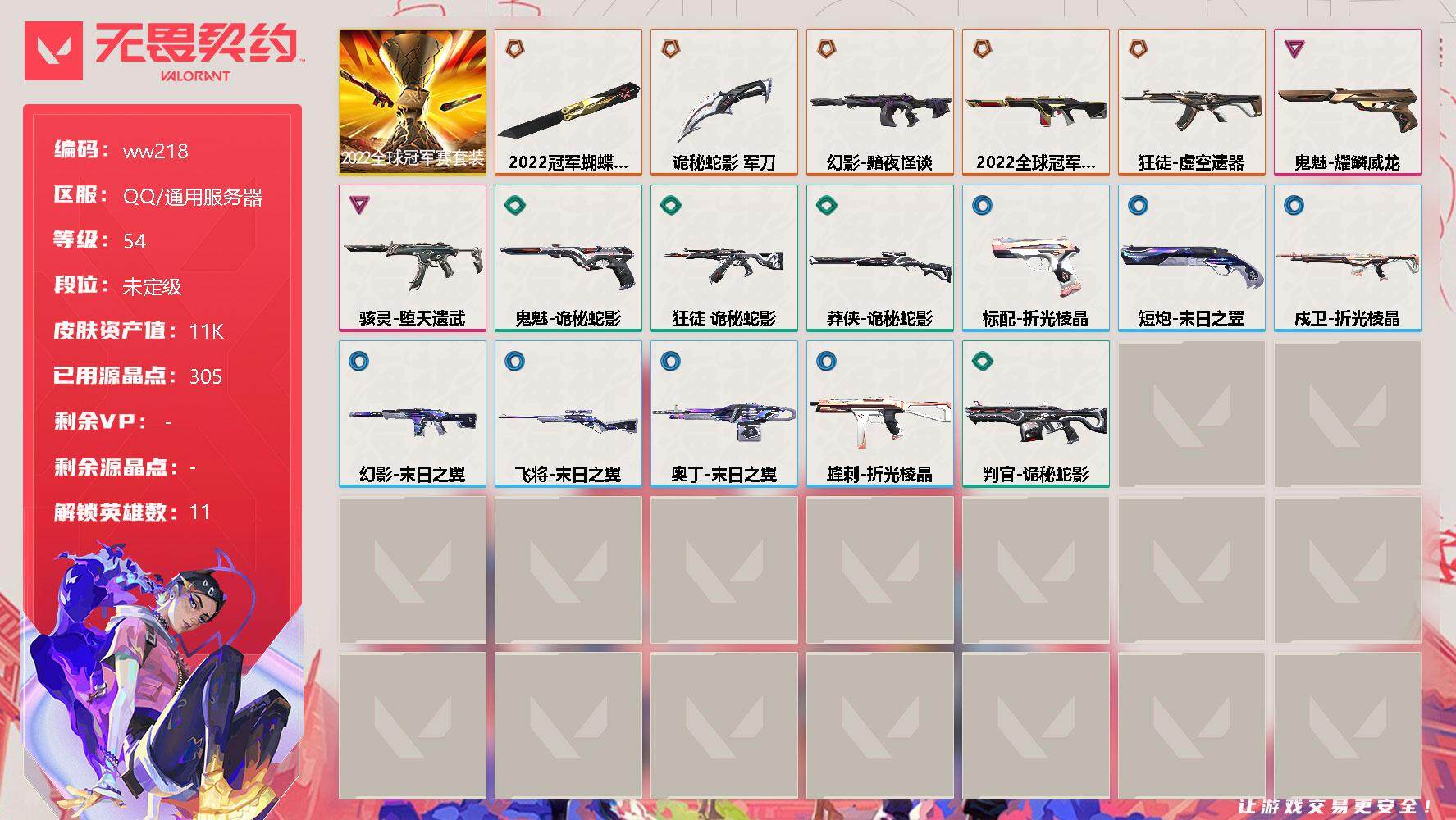 【云游堂】 【可二次实名】【ww218】【套装】:2022全球冠军赛套装 【英雄】:幻棱,炼狱,暮蝶,捷风,雷兹,不死鸟,贤者,猎枭,芮娜,夜露,黑梦 【近战 武器】:近战武器-2022全球冠军赛 蝴蝶刀,近战武器-诡秘蛇影 军刀 【狂徒】:狂徒-虚空遗器,狂徒-诡秘蛇影 【幻影】:幻影-2022全球冠军赛,幻影-黯夜怪谈,幻影-末日之翼 【戍卫】:戍卫-折光棱晶 【飞将】:飞将-末日之翼 【莽侠】:莽侠-诡秘蛇影 【奥丁】:奥丁-末日之翼 【判官】:判官-诡秘蛇影 【骇灵】:骇灵-堕天遗武 【蜂刺】:蜂刺-折光棱晶 【标配】:标配-折光棱晶 【鬼魅】:鬼魅-耀鳞威龙,鬼魅-诡秘蛇影 【短炮】:短炮-末日之翼 【卡面】:梦幻奶茶 卡面,无畏契约GO!第一卷:芮娜 卡面,无畏契约GO!第一卷:零 卡面,代号红色 卡面,新兵报到 卡面,V契约 卡面,无畏契约 卡面 【喷漆】:买装还是存钱 喷漆,胜利属于无畏契约 喷漆,GLHF 喷漆,无畏契约 喷漆 【挂饰】:战术河童 挂饰,天外飞客 挂饰,无畏契约 纪念币 挂饰