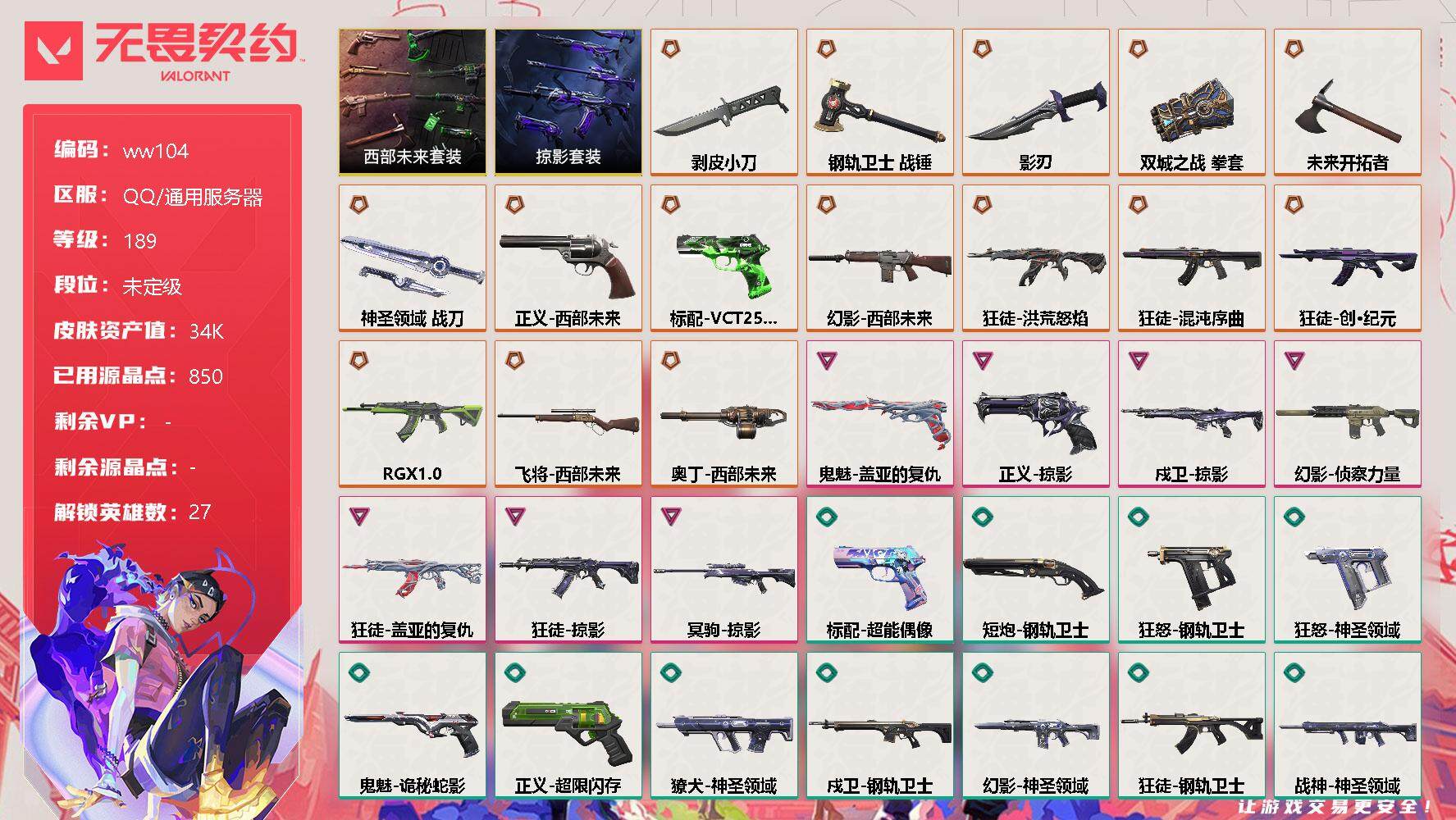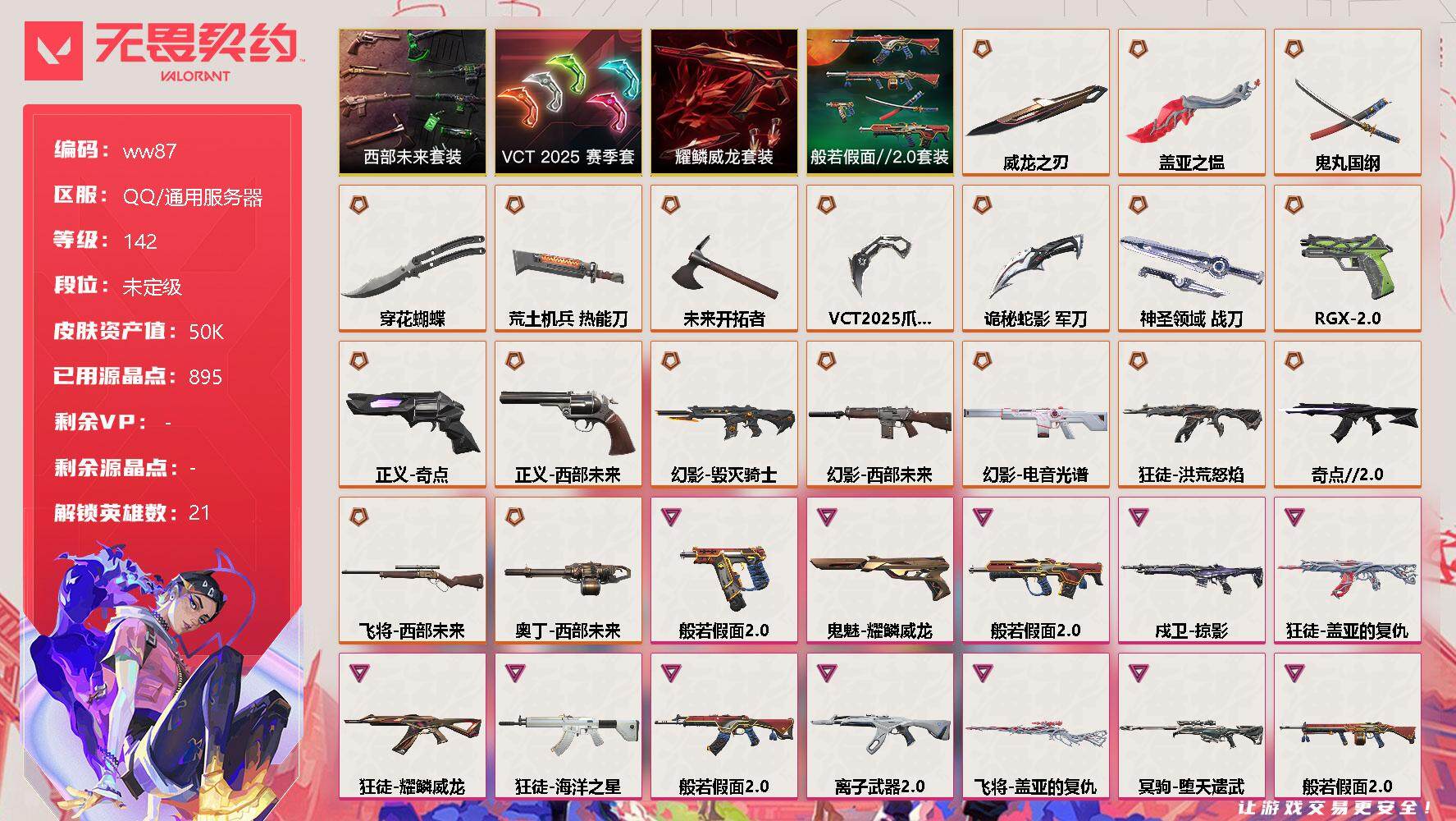 【云游堂】 【可二次实名】【ww104】【套装】:西部未来套装,掠影套装 【英雄】:幻棱,炼狱,维斯,暮蝶,钛狐,壹决,铁臂,捷风,雷兹,幽影,不死鸟,贤者,猎枭,蝰蛇,零,芮娜,奇乐,尚勃勒,霓虹,斯凯,夜露,星礈,K/O,海神,盖可,黑梦,钢锁 【近战 武器】:近战武器-剥皮小刀,近战武器-双城之战 拳套,近战武器-未来开拓者,近战武器-钢轨卫士 战锤,近战武器-影刃,近战武器-神圣领域 战刀 【狂徒】:狂徒-洪荒怒焰,狂徒-混沌序曲,狂徒-创·纪元,狂徒-RGX 11z Pro,狂徒-掠影,狂徒-盖亚的复仇,狂徒-钢轨卫士 【幻影】:幻影-西部未来,幻影-侦察力量,幻影-神圣领域,幻影-战术小伙伴,幻影-西部未来 【戍卫】:戍卫-掠影,戍卫-钢轨卫士,戍卫-月球哨兵 【獠犬】:獠犬-神圣领域,獠犬-战术小伙伴 【冥驹】:冥驹-掠影,冥驹-星云暗涌 【飞将】:飞将-西部未来,飞将-光导纤维 【莽侠】:莽侠-月球哨兵 【战神】:战神-神圣领域 【奥丁】:奥丁-西部未来,奥丁-战术小伙伴 【雄鹿】:雄鹿-月球哨兵 【骇灵】:骇灵-光导纤维,骇灵-星云暗涌 【蜂刺】:蜂刺-战术小伙伴,蜂刺-星云暗涌 【标配】:标配-超能偶像,标配-光导纤维 【VCT手枪】:标配-VCT25 x DRG 【正义】:正义-西部未来,正义-掠影,正义-超限闪存,正义-纳米打击,正义-月球哨兵 【鬼魅】:鬼魅-盖亚的复仇,鬼魅-诡秘蛇影,鬼魅-光导纤维,鬼魅-星云暗涌 【狂怒】:狂怒-钢轨卫士,狂怒-神圣领域 【短炮】:短炮-钢轨卫士 【卡面】:终章:激斗汉堡 卡面,进入射程 卡面,瓦娃脸雪糕 P2 卡面,《双城之战》拥抱 卡面,精灵大战 卡面,欢迎来到底城 卡面,南瓜盛典 卡面,修车达人 卡面,正义的化身 卡面,铁之华 卡面,时间到 卡面,最高舞台 卡面,超能偶像 卡面,树懒大作战 卡面,声感陷阱设计图 卡面,红鳞松叶 卡面,梦幻奶茶 卡面,流星兵团 卡面,零点嗅探设计图 卡面,沙雕爆能器 卡面,无畏契约GO!第一卷:芮娜 卡面,深海水族 卡面,清除名单 卡面,无畏契约GO!第一卷:零 卡面,终章:同步耍酷 卡面,龍记 卡面,化茧成蝶 卡面,比比看谁快? 卡面,无垠星环 卡面,先瓦为敬 - 绿色 卡面,《双城之战》金克丝 卡面,蝰蛇vs幽影 卡面,势不可挡//盖可 卡面,逆向独行 卡面 ,同步耍酷 卡面,完美调谐 卡面 ,没有什么能逃过我的眼睛 卡面,光导纤维 卡面,战术小伙伴 卡面,钢轨卫士 卡面,暗枪 卡面,无畏契约GO!第一卷:贤者 卡面,别冒尖 卡面,黑影先生的咖啡! 卡面,势不可挡//K/O 卡面,代号红色 卡面,冰淇淋店 卡面,新兵报到 卡面,友军火力 卡面,V契约 卡面,无畏契约 卡面 【喷漆】:嗨宝南瓜灯 喷漆,嘭! 喷漆,都算到了 喷漆,控场勿近 喷漆,小丑猫 喷漆,熊抱 喷漆,超级粉丝 喷漆,捷风差距 喷漆,惊声尖叫 喷漆,审判之爪 喷漆,拼一枪 喷漆,新潮流 喷漆,双击点赞 喷漆,买装还是存钱 喷漆,醒狮贺春 喷漆,萌化了 喷漆,松叶 喷漆,辣得好下饭 喷漆,飓刃涂鸦 喷漆 ,旅行小熊 喷漆,战术小伙伴 喷漆,又一个梦幻组合 喷漆,是大风刮来的 喷漆 ,静电火花 喷漆 ,今天的潮声甚是喧嚣 喷漆 ,请你冷静点 喷漆 ,蕊形灯 喷漆,这是你掉的吗? 喷漆,省钱大师 喷漆 ,皇冠拉花 喷漆,该转点了 喷漆,胜利属于无畏契约 喷漆,GLHF 喷漆,无畏契约 喷漆 【挂饰】:终章:猫猫木乃伊 挂饰,悠闲鸡块 挂饰,伞绳 挂饰,《双城之战》小蛋糕 挂饰,第九季//第三幕 纪念币 挂饰,工具腰带 挂饰,无畏契约GO!第一卷 芮娜 挂饰,无畏契约GO!第一卷 零 挂饰,鱼骨头 挂饰,熔岩灯 挂饰,第九季//第二幕 纪念币 挂饰,终章:这瓜保熟 挂饰,糖葫芦 挂饰,袖珍捷风 挂饰,迷你浓缩 挂饰,第九季//第一幕 纪念币 挂饰,第八季//第三幕 纪念币 挂饰,第八季//第二幕 纪念币 挂饰 ,天外飞客 挂饰,好运福爪 挂饰,终章:晒出笑脸 挂饰,悠闲鸭 挂饰,红鳞松叶 挂饰,酷闪轮滑 挂饰,呼啦熊 挂饰,晒出笑脸 挂饰,瞄这里 挂饰,盆栽小友 挂饰,斑点小姐 挂饰,插电音乐 挂饰,第八季//第一幕 纪念币 挂饰,第七季//第二幕 纪念币 挂饰,无畏契约 纪念币 挂饰