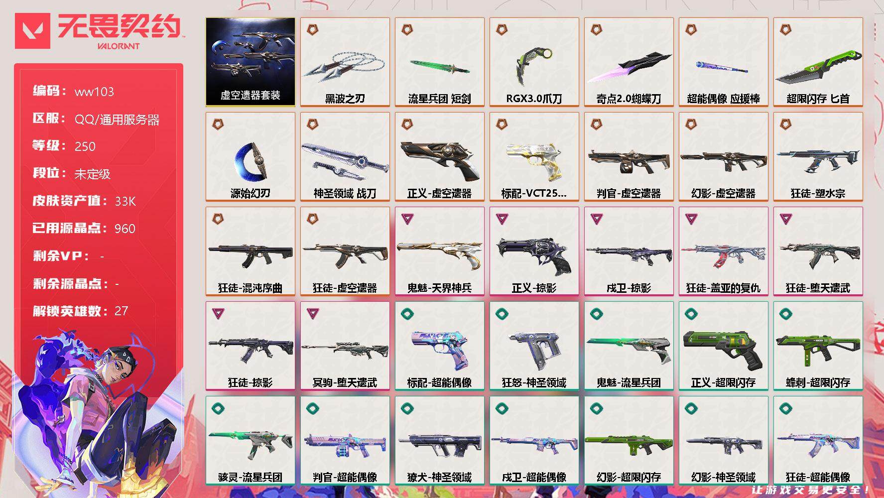 【云游堂】 【可二次实名】【ww97】【英雄】:幻棱,炼狱,暮蝶,壹决,铁臂,捷风,不死鸟,贤者,猎枭,蝰蛇,零,芮娜,K/O,海神,盖可,黑梦,钢锁 【近战 武器】:近战武器-紫金爪刀 【狂徒】:狂徒-堕天遗武,狂徒-盖亚的复仇 【幻影】:幻影-源能者娱乐系统,幻影-黯夜怪谈 【骇灵】:骇灵-艾沃莉的梦之翼 【鬼魅】:鬼魅-超时空卫队,鬼魅-诡秘蛇影 【卡面】:南瓜盛典 卡面,无畏契约:暮蝶 卡面,树懒大作战 卡面,Clutch 卡面,采蜜小蜂队 卡面,无畏契约GO!第一卷:芮娜 卡面,无畏契约GO!第一卷:零 卡面,无垠星环 卡面,《双城之战》金克丝 卡面,沙尘幻旅 卡面,代号红色 卡面,新兵报到 卡面,V契约 卡面,无畏契约 卡面 【喷漆】:伤心心 喷漆,买装还是存钱 喷漆,关门放狗 喷漆,无畏契约GO!第一卷:贤者 喷漆,放下武器 喷漆,胜利属于无畏契约 喷漆,GLHF 喷漆,无畏契约 喷漆 【挂饰】:薰衣草之心 挂饰,动力机箱 挂饰,天外飞客 挂饰,海豹的认可 挂饰,无畏契约 纪念币 挂饰