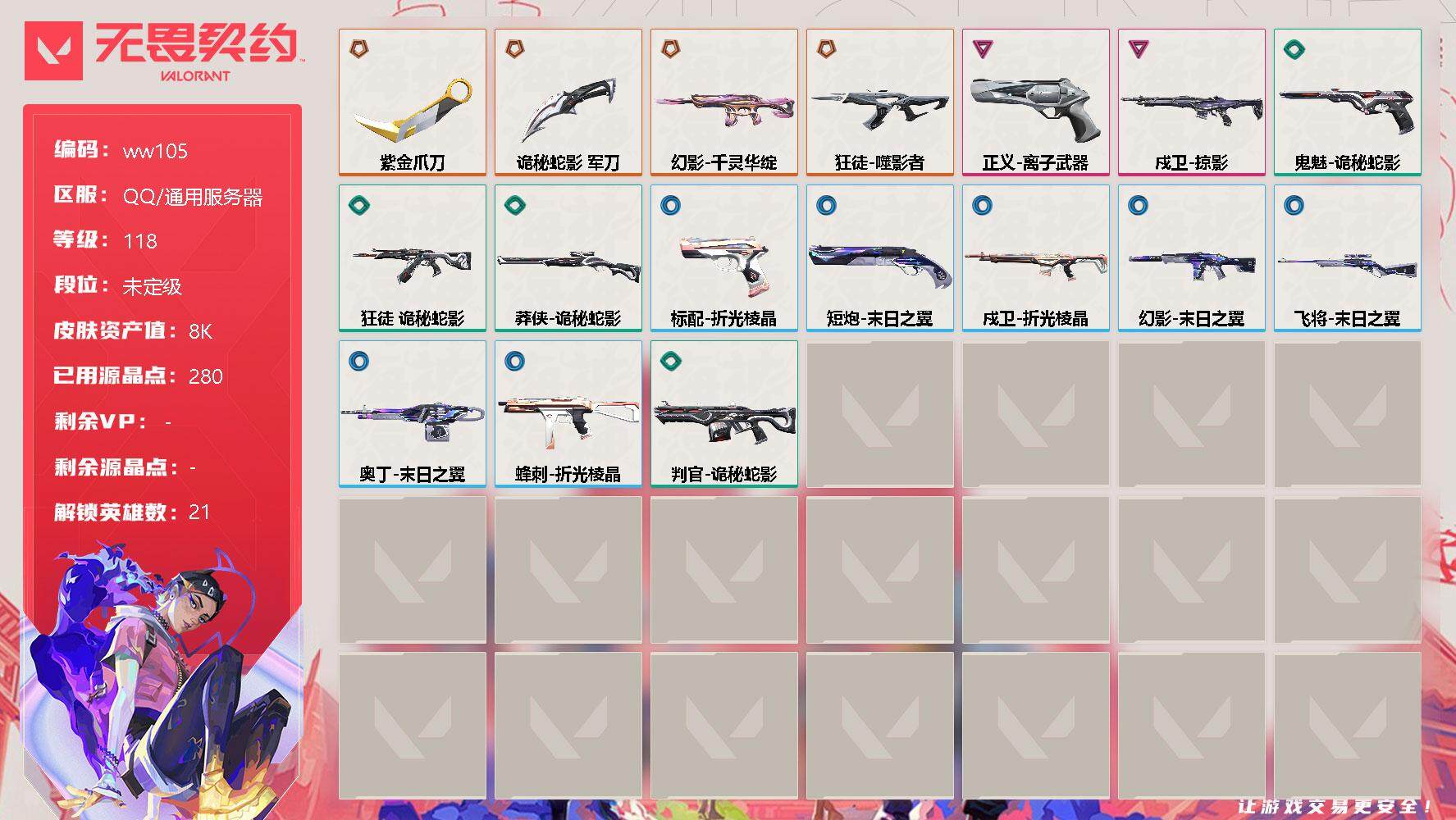 【云游堂】 【可二次实名】【ww105】【英雄】:幻棱,炼狱,暮蝶,钛狐,壹决,铁臂,捷风,雷兹,幽影,不死鸟,贤者,猎枭,零,芮娜,尚勃勒,霓虹,斯凯,夜露,K/O,盖可,黑梦 【近战 武器】:近战武器-紫金爪刀,近战武器-诡秘蛇影 军刀 【狂徒】:狂徒-噬影者,狂徒-诡秘蛇影 【幻影】:幻影-千灵华绽,幻影-末日之翼 【戍卫】:戍卫-掠影,戍卫-折光棱晶 【飞将】:飞将-末日之翼 【莽侠】:莽侠-诡秘蛇影 【奥丁】:奥丁-末日之翼 【判官】:判官-诡秘蛇影 【蜂刺】:蜂刺-折光棱晶 【标配】:标配-折光棱晶 【正义】:正义-离子武器 【鬼魅】:鬼魅-诡秘蛇影 【短炮】:短炮-末日之翼 【卡面】:虹吸式咖啡壶 卡面,无畏契约GO!第一卷:芮娜 卡面,无畏契约GO!第一卷:零 卡面,势不可挡//盖可 卡面,代号红色 卡面,新兵报到 卡面,V契约 卡面,无畏契约 卡面 【喷漆】:图谋不轨的零 喷漆,小丑猫 喷漆,买装还是存钱 喷漆,胜利属于无畏契约 喷漆,GLHF 喷漆,无畏契约 喷漆 【挂饰】:天外飞客 挂饰,无畏契约 纪念币 挂饰