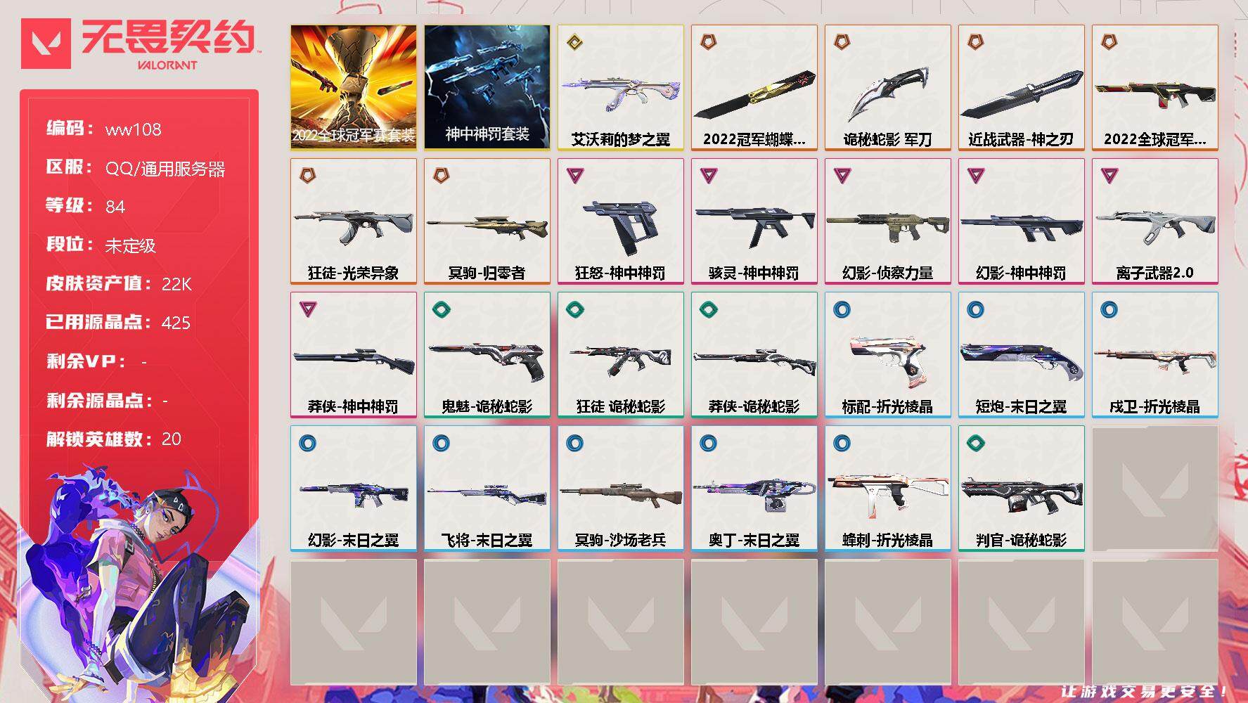 【云游堂】 【可二次实名】【ww108】【套装】:2022全球冠军赛套装,神中神罚套装 【英雄】:幻棱,炼狱,暮蝶,壹决,铁臂,捷风,幽影,不死鸟,贤者,猎枭,蝰蛇,零,芮娜,奇乐,尚勃勒,霓虹,夜露,星礈,黑梦,钢锁 【近战 武器】:近战武器-2022全球冠军赛 蝴蝶刀,近战武器-神之刃,近战武器-诡秘蛇影 军刀 【狂徒】:狂徒-艾沃莉的梦之翼,狂徒-光荣异象,狂徒-离子武器//2.0,狂徒-诡秘蛇影 【幻影】:幻影-2022全球冠军赛,幻影-侦察力量,幻影-神中神罚,幻影-末日之翼 【戍卫】:戍卫-折光棱晶 【冥驹】:冥驹-归零者,冥驹-沙场老兵 【飞将】:飞将-末日之翼 【莽侠】:莽侠-神中神罚,莽侠-诡秘蛇影 【奥丁】:奥丁-末日之翼 【判官】:判官-诡秘蛇影 【骇灵】:骇灵-神中神罚 【蜂刺】:蜂刺-折光棱晶 【标配】:标配-折光棱晶 【鬼魅】:鬼魅-诡秘蛇影 【狂怒】:狂怒-神中神罚 【短炮】:短炮-末日之翼 【卡面】:无畏契约:暮蝶 卡面,树懒大作战 卡面,无畏契约GO!第一卷:芮娜 卡面,无畏契约GO!第一卷:零 卡面,无垠星环 卡面,《双城之战》金克丝 卡面,没有什么能逃过我的眼睛 卡面,代号红色 卡面,新兵报到 卡面,V契约 卡面,无畏契约 卡面 【喷漆】:伤心心 喷漆,买装还是存钱 喷漆,关门放狗 喷漆,放下武器 喷漆,胜利属于无畏契约 喷漆,GLHF 喷漆,无畏契约 喷漆 【挂饰】:熔岩灯 挂饰,动力机箱 挂饰,天外飞客 挂饰,《双城之战》魄罗 挂饰,无畏契约 纪念币 挂饰