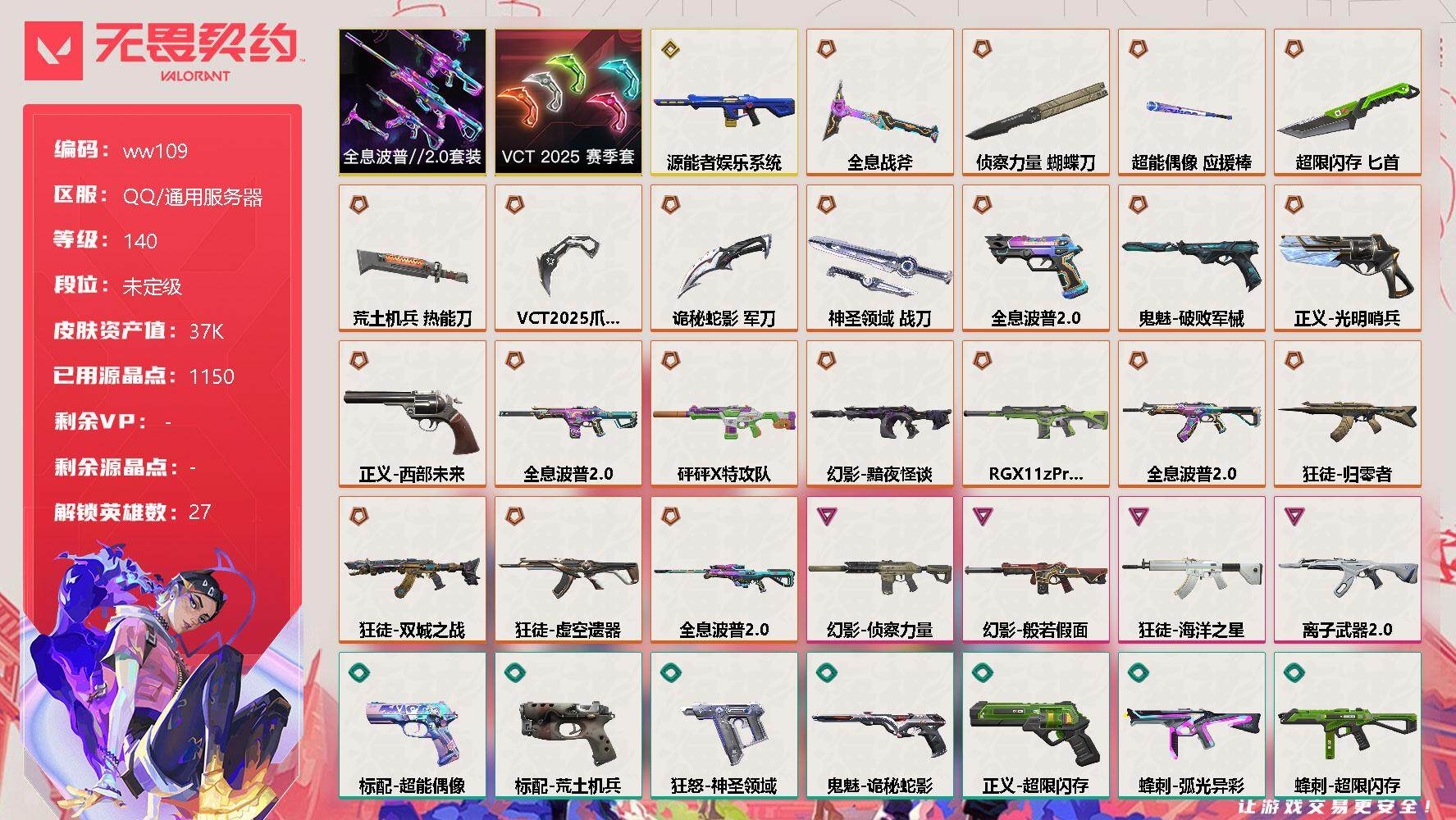 【云游堂】 【可二次实名】【ww109】【套装】:VCT 2025 赛季套装,全息波普//2.0套装 【英雄】:幻棱,炼狱,维斯,暮蝶,钛狐,壹决,铁臂,捷风,雷兹,幽影,不死鸟,贤者,猎枭,蝰蛇,零,芮娜,奇乐,尚勃勒,霓虹,斯凯,夜露,星礈,K/O,海神,盖可,黑梦,钢锁 【近战 武器】:近战武器-侦察力量 蝴蝶刀,近战武器-VCT 2025 爪刀,近战武器-超能偶像 应援棒,近战武器-超限闪存 匕首,近战武器-荒土机兵 热能刀,近战武器-全息战斧,近战武器-诡秘蛇影 军刀,近战武器-神圣领域 战刀 【狂徒】:狂徒-归零者,狂徒-全息波普//2.0,狂徒-双城之战,狂徒-虚空遗器,狂徒-海洋之星,狂徒-离子武器//2.0,狂徒-超能偶像,狂徒-弧光异彩,狂徒-荒土机兵,狂徒-诡秘蛇影 【幻影】:幻影-源能者娱乐系统,幻影-黯夜怪谈,幻影-砰砰X特攻队,幻影-全息波普//2.0,幻影-RGX 11z Pro//2.0,幻影-般若假面,幻影-侦察力量,幻影-超限闪存,幻影-神圣领域,幻影-聚合之力,幻影-纳米打击,幻影-末日之翼 【戍卫】:戍卫-超能偶像,戍卫-彩梦之城,戍卫-浮光跃金,戍卫-逆冲蛮牛,戍卫-月球哨兵,戍卫-折光棱晶 【獠犬】:獠犬-弧光异彩,獠犬-神圣领域,獠犬-采蜜小蜂队,獠犬-模拟赫兹,獠犬-逆冲蛮牛 【冥驹】:冥驹-全息波普//2.0,冥驹-荒土机兵,冥驹-模拟赫兹,冥驹-星云暗涌 【飞将】:飞将-聚合之力,飞将-末日之翼 【莽侠】:莽侠-超限闪存,莽侠-诡秘蛇影,莽侠-月球哨兵 【战神】:战神-神圣领域,战神-采蜜小蜂队,战神-浮光跃金 【奥丁】:奥丁-纳米打击,奥丁-信手涂鸦,奥丁-末日之翼 【判官】:判官-超能偶像,判官-诡秘蛇影,判官-采蜜小蜂队,判官-纳米打击x 【雄鹿】:雄鹿-彩梦之城,雄鹿-模拟赫兹,雄鹿-逆冲蛮牛,雄鹿-月球哨兵 【骇灵】:骇灵-荒土机兵,骇灵-浮光跃金,骇灵-信手涂鸦,骇灵-星云暗涌 【蜂刺】:蜂刺-超限闪存,蜂刺-弧光异彩,蜂刺-聚合之力,蜂刺-星云暗涌,蜂刺-折光棱晶 【标配】:标配-全息波普//2.0,标配-超能偶像,标配-荒土机兵,标配-彩梦之城,标配-浮光跃金,标配-折光棱晶 【正义】:正义-光明哨兵,正义-西部未来,正义-超限闪存,正义-纳米打击,正义-月球哨兵 【鬼魅】:鬼魅-破败军械,鬼魅-诡秘蛇影,鬼魅-采蜜小蜂队,鬼魅-模拟赫兹,鬼魅-信手涂鸦,鬼魅-星云暗涌 【狂怒】:狂怒-神圣领域,狂怒-聚合之力,狂怒-逆冲蛮牛 【短炮】:短炮-末日之翼 【卡面】:终章:激斗汉堡 卡面,进入射程 卡面,分崩离析 卡面,纳米打击 卡面,抑制技术 卡面,激斗汉堡 卡面,瓦娃脸雪糕 P2 卡面,从黄昏到黎明 卡面,荒土机兵 卡面,银弹猎手 卡面,逆冲蛮牛 卡面,《双城之战》拥抱 卡面,精灵大战 卡面,欢迎来到底城 卡面,南瓜盛典 卡面,唱片的故事 卡面,钢弓与箭弦 卡面,排除故障 卡面,战术桌游 卡面,悠享食光 卡面,修车达人 卡面,模拟赫兹 卡面,浮光跃金 卡面,超限闪存 卡面,维斯工牌 卡面,正义的化身 卡面,终章:生意人麦宝 卡面,铁之华 卡面,失而复得 卡面,时间到 卡面,最高舞台 卡面,复活专家 卡面,归乡 // 蝰蛇 卡面,超能偶像 卡面,生意人麦宝 卡面,声感陷阱设计图 卡面,霓帧牛蛙 卡面,钢锁工牌 卡面,战术小伙伴的夏日 卡面,采蜜小蜂队 卡面,聚合之力 卡面,梦幻奶茶 卡面,源能反应 卡面,零点嗅探设计图 卡面,无畏契约:蝰蛇 卡面,无畏契约GO!第一卷:芮娜 卡面,清除名单 卡面,无畏契约GO!第一卷:零 卡面,暗枪 卡面,"Luie" 卡面,铁臂设计图 卡面,代号红色 卡面,冰淇淋店 卡面,新兵报到 卡面,友军火力 卡面,V契约 卡面,无畏契约 卡面 【喷漆】:小小心意 喷漆,战“素”兔 喷漆,宇宙的指引 喷漆,请求重启 喷漆,逆冲蛮牛 喷漆,纳米打击 喷漆,鼻尖上的蝴蝶 喷漆,简笔画黯兽 喷漆,独守蝰腹 喷漆,他们将落荒而逃 喷漆,通缉:战术企鹅 喷漆,荒土机兵 喷漆,别挡我吃球! 喷漆,嗨宝南瓜灯 喷漆,嘭! 喷漆,都算到了 喷漆,控场勿近 喷漆,皮蛋呼呼 喷漆,像素星礈 喷漆,图谋不轨的零 喷漆,小丑猫 喷漆,模拟赫兹 喷漆,高丽风情小熊 喷漆,蹲到一个 喷漆,全力集中 喷漆,超限闪存 喷漆,RUA一下 喷漆,熊抱 喷漆,高丽风情小虎 喷漆,记在小本本 喷漆,防弹企鹅 喷漆,高丽风情小蛙 喷漆,又被闪了 喷漆,终极羞辱 喷漆,超级粉丝 喷漆,黯兽卖萌 喷漆,捷风差距 喷漆,惊声尖叫 喷漆,水晶球 喷漆,2021冠军巡回赛花火 喷漆,五人成星 喷漆,超能偶像 喷漆,放我出去 喷漆,掩护我 喷漆,大佬发枪 喷漆,边缘试探 喷漆,拼一枪 喷漆,聚合之力 喷漆,采蜜小