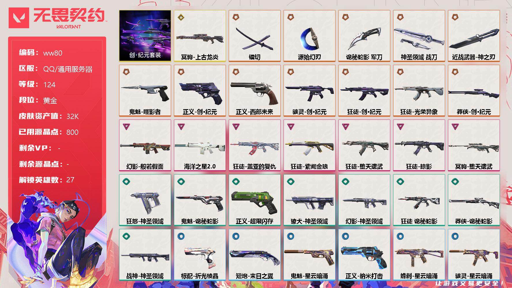 【云游堂】 【可二次实名】【ww80】【套装】:创·纪元套装 【英雄】:幻棱,炼狱,维斯,暮蝶,钛狐,壹决,铁臂,捷风,雷兹,幽影,不死鸟,贤者,猎枭,蝰蛇,零,芮娜,奇乐,尚勃勒,霓虹,斯凯,夜露,星礈,K/O,海神,盖可,黑梦,钢锁 【近战 武器】:近战武器-神之刃,近战武器-镭切,近战武器-源始幻刃,近战武器-诡秘蛇影 军刀,近战武器-神圣领域 战刀 【狂徒】:狂徒-创·纪元,狂徒-光荣异象,狂徒-堕天遗武,狂徒-掠影,狂徒-盖亚的复仇,狂徒-紫阙金琅,狂徒-诡秘蛇影 【幻影】:幻影-般若假面,幻影-海洋之星//2.0,幻影-神圣领域,幻影-末日之翼 【戍卫】:戍卫-月球哨兵,戍卫-折光棱晶 【獠犬】:獠犬-神圣领域 【冥驹】:冥驹-上古龙炎,冥驹-堕天遗武,冥驹-星云暗涌 【飞将】:飞将-末日之翼 【莽侠】:莽侠-创·纪元,莽侠-诡秘蛇影,莽侠-月球哨兵 【战神】:战神-神圣领域 【奥丁】:奥丁-末日之翼 【判官】:判官-诡秘蛇影 【雄鹿】:雄鹿-月球哨兵 【骇灵】:骇灵-创·纪元,骇灵-星云暗涌 【蜂刺】:蜂刺-星云暗涌,蜂刺-折光棱晶 【标配】:标配-折光棱晶 【正义】:正义-创·纪元,正义-西部未来,正义-超限闪存,正义-纳米打击,正义-月球哨兵 【鬼魅】:鬼魅-噬影者,鬼魅-诡秘蛇影,鬼魅-星云暗涌 【狂怒】:狂怒-神圣领域 【短炮】:短炮-末日之翼 【卡面】:终章:激斗汉堡 卡面,进入射程 卡面,《双城之战》拥抱 卡面,精灵大战 卡面,欢迎来到底城 卡面,南瓜盛典 卡面,修车达人 卡面,正义的化身 卡面,时间到 卡面,最高舞台 卡面,梦幻奶茶 卡面,哨卫者之领域 卡面,战术熊与伙伴们 卡面,无畏契约GO!第一卷:芮娜 卡面,无畏契约GO!第一卷:零 卡面,暗枪 卡面,"Luie" 卡面,代号红色 卡面,冰淇淋店 卡面,新兵报到 卡面,V契约 卡面,无畏契约 卡面 【喷漆】:嗨宝南瓜灯 喷漆,嘭! 喷漆,都算到了 喷漆,控场勿近 喷漆,小丑猫 喷漆,熊抱 喷漆,超级粉丝 喷漆,捷风差距 喷漆,买装还是存钱 喷漆,胜利属于无畏契约 喷漆,GLHF 喷漆,无畏契约 喷漆 【挂饰】:终章:猫猫木乃伊 挂饰,悠闲鸡块 挂饰,伞绳 挂饰,《双城之战》小蛋糕 挂饰,第九季//第三幕 纪念币 挂饰,工具腰带 挂饰,无畏契约GO!第一卷 芮娜 挂饰,无畏契约GO!第一卷 零 挂饰,熔岩灯 挂饰,第九季//第二幕 纪念币 挂饰,袖珍捷风 挂饰,Z世代特饮 挂饰,第九季//第一幕 纪念币 挂饰,天外飞客 挂饰,无畏契约 纪念币 挂饰