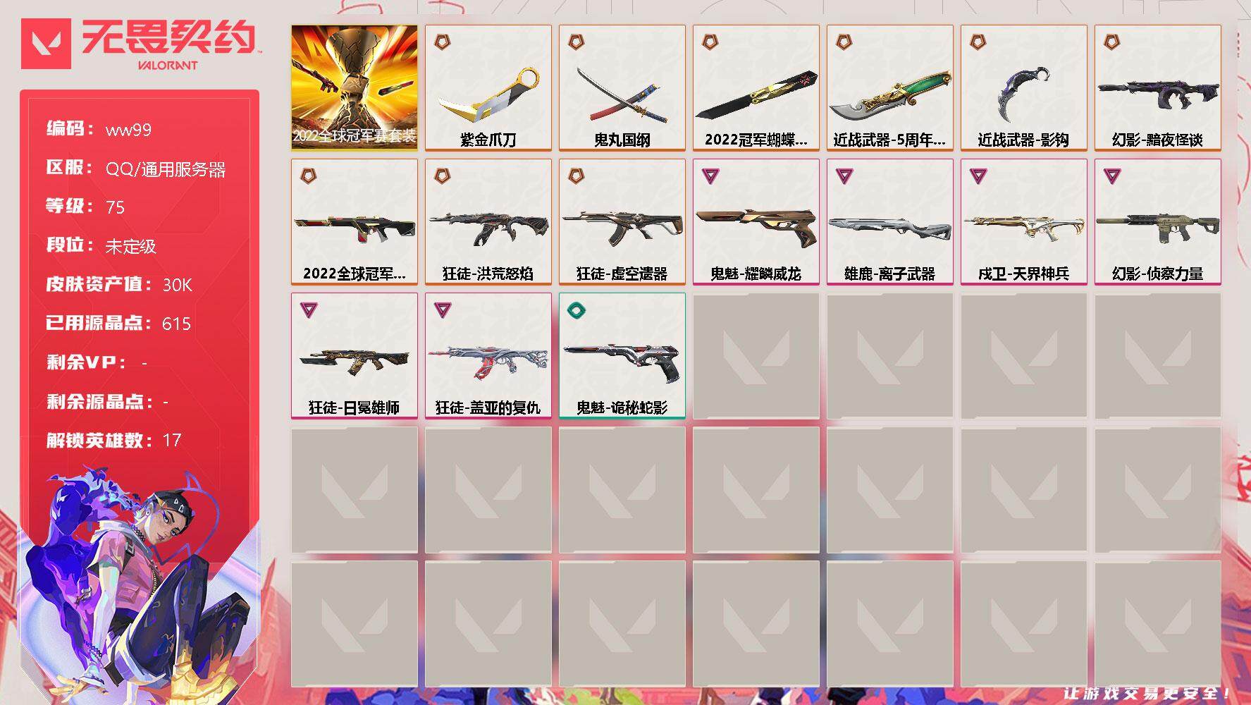 【云游堂】 【可二次实名】【ww99】【套装】:2022全球冠军赛套装 【英雄】:幻棱,炼狱,暮蝶,钛狐,壹决,铁臂,捷风,幽影,不死鸟,贤者,猎枭,芮娜,奇乐,霓虹,斯凯,夜露,盖可 【近战 武器】:近战武器-2022全球冠军赛 蝴蝶刀,近战武器-影钩,近战武器-5周年//公测重制版 苍龙之刃,近战武器-紫金爪刀,近战武器-鬼丸国纲 【狂徒】:狂徒-洪荒怒焰,狂徒-虚空遗器,狂徒-盖亚的复仇,狂徒-日冕雄师 【幻影】:幻影-2022全球冠军赛,幻影-黯夜怪谈,幻影-侦察力量 【戍卫】:戍卫-天界神兵 【雄鹿】:雄鹿-离子武器 【鬼魅】:鬼魅-耀鳞威龙,鬼魅-诡秘蛇影 【卡面】:无畏契约:暮蝶 卡面,热舞环节 卡面,无畏契约GO!第一卷:芮娜 卡面,清除名单 卡面,无畏契约GO!第一卷:零 卡面,暗枪 卡面,铁臂设计图 卡面,代号红色 卡面,冰淇淋店 卡面,新兵报到 卡面,友军火力 卡面,V契约 卡面,无畏契约 卡面 【喷漆】:伤心心 喷漆,买装还是存钱 喷漆,胜利属于无畏契约 喷漆,GLHF 喷漆,无畏契约 喷漆 【挂饰】:无畏契约GO!第一卷 芮娜 挂饰,第八季//第二幕 纪念币 挂饰 ,天外飞客 挂饰,第八季//第一幕 纪念币 挂饰,第七季//第二幕 纪念币 挂饰,无畏契约 纪念币 挂饰