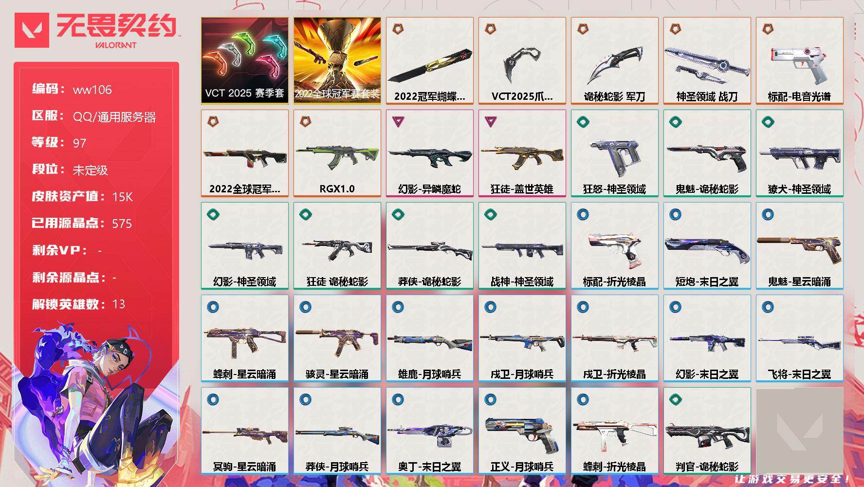 【云游堂】 【可二次实名】【ww106】【套装】:2022全球冠军赛套装,VCT 2025 赛季套装 【英雄】:幻棱,炼狱,维斯,暮蝶,钛狐,捷风,幽影,不死鸟,贤者,猎枭,芮娜,尚勃勒,K/O 【近战 武器】:近战武器-2022全球冠军赛 蝴蝶刀,近战武器-VCT 2025 爪刀,近战武器-诡秘蛇影 军刀,近战武器-神圣领域 战刀 【狂徒】:狂徒-RGX 11z Pro,狂徒-盖世英雄,狂徒-诡秘蛇影 【幻影】:幻影-2022全球冠军赛,幻影-异鳞魔蛇,幻影-神圣领域,幻影-末日之翼 【戍卫】:戍卫-月球哨兵,戍卫-折光棱晶 【獠犬】:獠犬-神圣领域 【冥驹】:冥驹-星云暗涌 【飞将】:飞将-末日之翼 【莽侠】:莽侠-诡秘蛇影,莽侠-月球哨兵 【战神】:战神-神圣领域 【奥丁】:奥丁-末日之翼 【判官】:判官-诡秘蛇影 【雄鹿】:雄鹿-月球哨兵 【骇灵】:骇灵-星云暗涌 【蜂刺】:蜂刺-星云暗涌,蜂刺-折光棱晶 【标配】:标配-电音光谱,标配-折光棱晶,标配-电音光谱 【正义】:正义-月球哨兵 【鬼魅】:鬼魅-诡秘蛇影,鬼魅-星云暗涌 【狂怒】:狂怒-神圣领域 【短炮】:短炮-末日之翼 【卡面】:树懒大作战 卡面,红鳞松叶 卡面,无畏契约:尚勃勒 卡面,无畏契约GO!第一卷:芮娜 卡面,无畏契约GO!第一卷:零 卡面,无垠星环 卡面,《双城之战》金克丝 卡面,无畏契约GO!第一卷:贤者 卡面,势不可挡//K/O 卡面,代号红色 卡面,新兵报到 卡面,V契约 卡面,无畏契约 卡面,809特遣队 卡面 【喷漆】:致命优雅 喷漆,哨卫滑步 喷漆,买装还是存钱 喷漆,关门放狗 喷漆,无畏契约GO!第一卷:芮娜 喷漆,无畏契约GO!第一卷:贤者 喷漆,暴走萝莉 喷漆,松叶 喷漆,战术小伙伴 喷漆,放下武器 喷漆,胜利属于无畏契约 喷漆,GLHF 喷漆,无畏契约 喷漆 【挂饰】:薰衣草之心 挂饰,动力机箱 挂饰,云开见日 挂饰,天外飞客 挂饰,红鳞松叶 挂饰,《双城之战》魄罗 挂饰,针织蜜蜂 挂饰,海豹的认可 挂饰,无畏契约 纪念币 挂饰