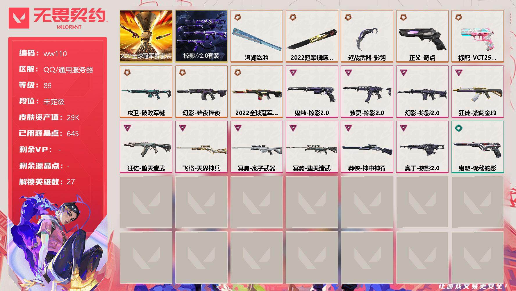 【云游堂】 【可二次实名】【ww110】【套装】:2022全球冠军赛套装,掠影//2.0套装 【英雄】:幻棱,炼狱,维斯,暮蝶,钛狐,壹决,铁臂,捷风,雷兹,幽影,不死鸟,贤者,猎枭,蝰蛇,零,芮娜,奇乐,尚勃勒,霓虹,斯凯,夜露,星礈,K/O,海神,盖可,黑梦,钢锁 【近战 武器】:近战武器-2022全球冠军赛 蝴蝶刀,近战武器-影钩,近战武器-澄湖潋滟 【狂徒】:狂徒-堕天遗武,狂徒-紫阙金琅 【幻影】:幻影-2022全球冠军赛,幻影-黯夜怪谈,幻影-掠影//2.0 【戍卫】:戍卫-破败军械 【冥驹】:冥驹-堕天遗武,冥驹-离子武器 【飞将】:飞将-天界神兵 【莽侠】:莽侠-神中神罚 【奥丁】:奥丁-掠影//2.0 【骇灵】:骇灵-掠影//2.0 【VCT手枪】:标配-VCT25 x BLG 【正义】:正义-奇点 【鬼魅】:鬼魅-掠影//2.0,鬼魅-诡秘蛇影 【卡面】:《双城之战》拥抱 卡面,精灵大战 卡面,欢迎来到底城 卡面,南瓜盛典 卡面,修车达人 卡面,正义的化身 卡面,无畏契约GO!第一卷:芮娜 卡面,无畏契约GO!第一卷:零 卡面,《双城之战》金克丝 卡面,代号红色 卡面,新兵报到 卡面,V契约 卡面,无畏契约 卡面 【喷漆】:嘭! 喷漆,都算到了 喷漆,控场勿近 喷漆,熊抱 喷漆,买装还是存钱 喷漆,关门放狗 喷漆,胜利属于无畏契约 喷漆,GLHF 喷漆,无畏契约 喷漆 【挂饰】:伞绳 挂饰,《双城之战》小蛋糕 挂饰,第九季//第三幕 纪念币 挂饰,无畏契约GO!第一卷 芮娜 挂饰,无畏契约GO!第一卷 零 挂饰,第九季//第二幕 纪念币 挂饰,天外飞客 挂饰,《双城之战》魄罗 挂饰,无畏契约 纪念币 挂饰