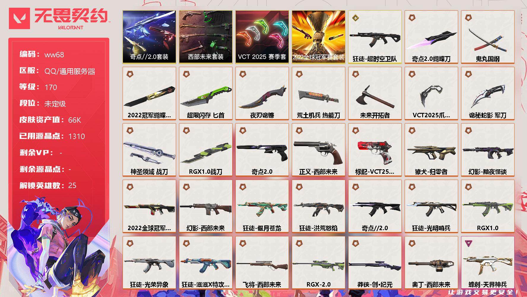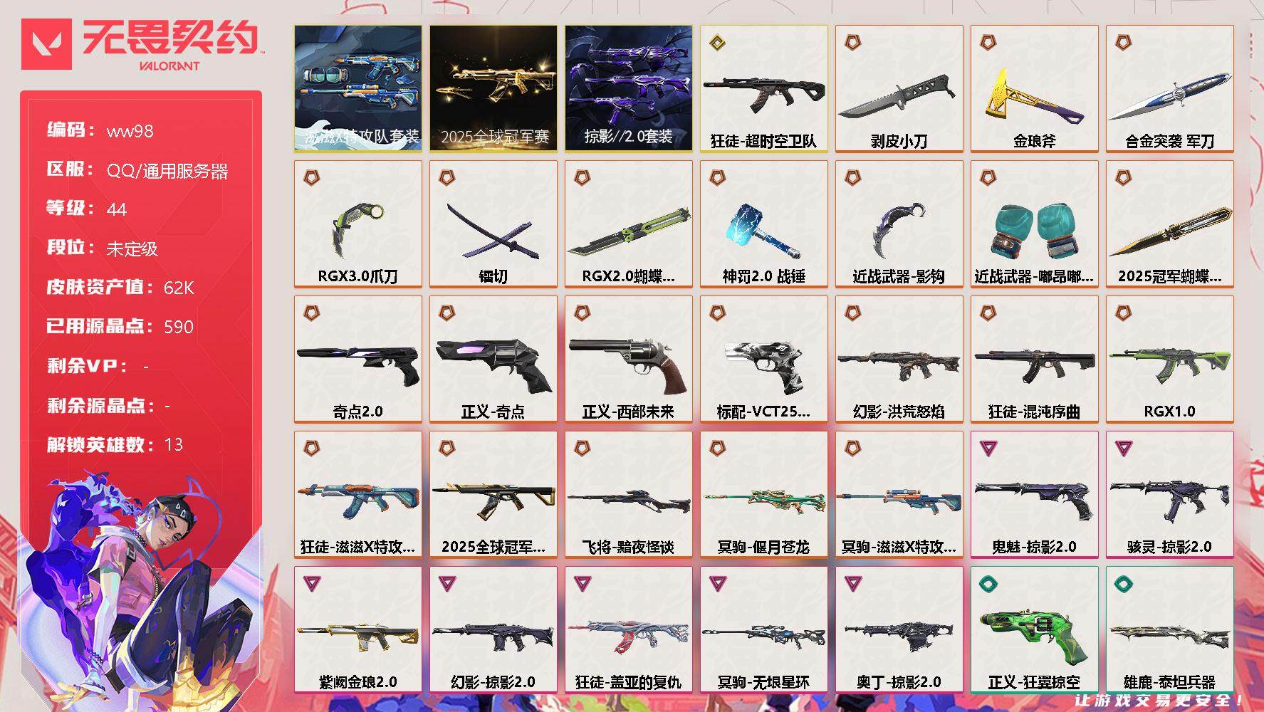 【云游堂】 【可二次实名】【ww98】【套装】:2025全球冠军赛套装,滋滋X特攻队套装,掠影//2.0套装 【英雄】:炼狱,暮蝶,捷风,雷兹,幽影,不死鸟,贤者,猎枭,零,芮娜,霓虹,K/O,盖可 【近战 武器】:近战武器-2025全球冠军赛 蝴蝶刀,近战武器-嘟昂嘟昂超弹力水球拳套,近战武器-影钩,近战武器-RGX 11z Pro//2.0 蝴蝶刀,近战武器-剥皮小刀,近战武器-RGX 11z Pro//3.0 爪刀,近战武器-镭切,近战武器-合金突袭 军刀,近战武器-金琅斧,近战武器-神罚//2.0 战锤 【狂徒】:狂徒-超时空卫队,狂徒-2025全球冠军赛,狂徒-混沌序曲,狂徒-RGX 11z Pro,狂徒-滋滋X特攻队,狂徒-盖亚的复仇,狂徒-海洋旅者 【幻影】:幻影-洪荒怒焰,幻影-紫阙金琅//2.0,幻影-掠影//2.0,幻影-神罚 【獠犬】:獠犬-海洋旅者 【冥驹】:冥驹-偃月苍龙,冥驹-滋滋X特攻队,冥驹-无垠星环 【飞将】:飞将-黯夜怪谈 【奥丁】:奥丁-掠影//2.0 【雄鹿】:雄鹿-泰坦兵器 【骇灵】:骇灵-掠影//2.0 【VCT手枪】:标配-VCT25 x TS 【正义】:正义-奇点,正义-西部未来,正义-狂翼掠空 【鬼魅】:鬼魅-奇点//2.0,鬼魅-掠影//2.0 【卡面】:热舞环节 卡面,树懒大作战 卡面,Clutch 卡面,零点嗅探设计图 卡面,无畏契约GO!第一卷:芮娜 卡面,无畏契约GO!第一卷:零 卡面,《双城之战》金克丝 卡面,暗枪 卡面,钢锁vs盖可 卡面,代号红色 卡面,冰淇淋店 卡面,新兵报到 卡面,V契约 卡面,无畏契约 卡面 【喷漆】:买装还是存钱 喷漆,无畏契约GO!第一卷:贤者 喷漆,暴走萝莉 喷漆,胜利属于无畏契约 喷漆,GLHF 喷漆,无畏契约 喷漆 【挂饰】:无畏契约GO!第一卷 零 挂饰,瞬云履 挂饰,动力机箱 挂饰,第八季//第三幕 纪念币 挂饰,天外飞客 挂饰,好运福爪 挂饰,无畏契约 纪念币 挂饰