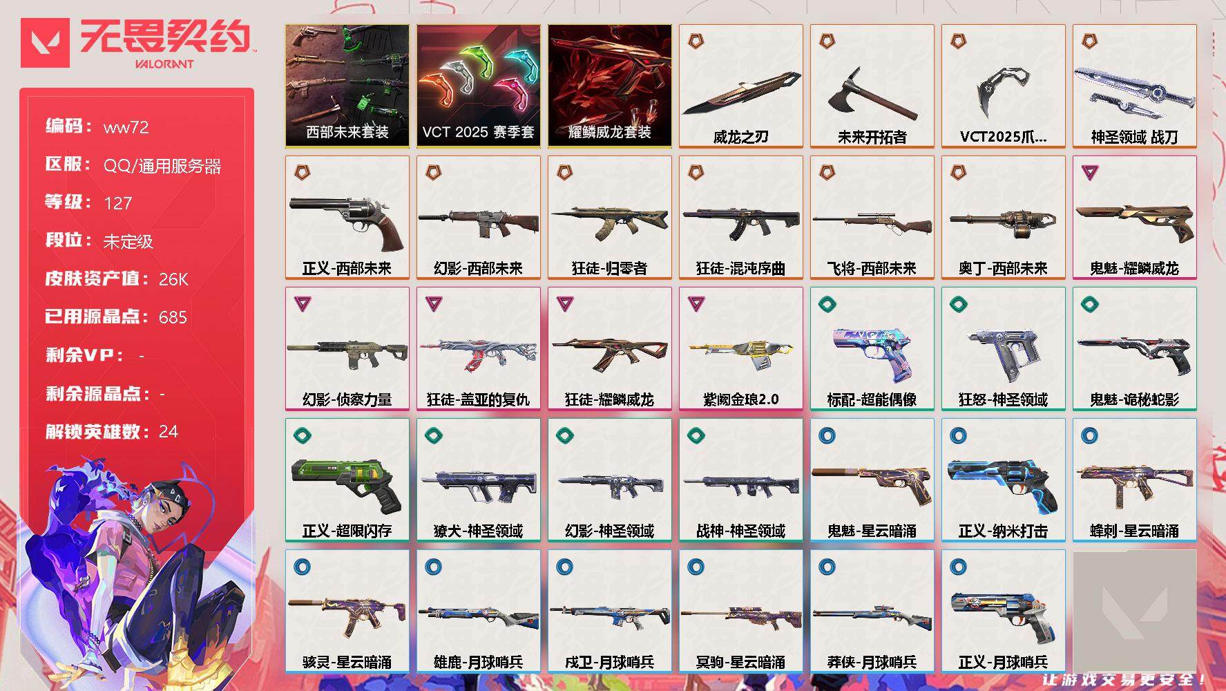 【云游堂】 【可二次实名】【ww72】【套装】:VCT 2025 赛季套装,西部未来套装,耀鳞威龙套装 【英雄】:幻棱,炼狱,维斯,暮蝶,钛狐,壹决,铁臂,捷风,雷兹,幽影,不死鸟,贤者,猎枭,蝰蛇,零,芮娜,奇乐,尚勃勒,霓虹,斯凯,星礈,海神,盖可,钢锁 【近战 武器】:近战武器-VCT 2025 爪刀,近战武器-威龙之刃,近战武器-未来开拓者,近战武器-神圣领域 战刀 【狂徒】:狂徒-归零者,狂徒-混沌序曲,狂徒-盖亚的复仇,狂徒-耀鳞威龙 【幻影】:幻影-西部未来,幻影-侦察力量,幻影-神圣领域,幻影-西部未来 【戍卫】:戍卫-月球哨兵 【獠犬】:獠犬-神圣领域 【冥驹】:冥驹-星云暗涌 【飞将】:飞将-西部未来 【莽侠】:莽侠-月球哨兵 【战神】:战神-神圣领域 【奥丁】:奥丁-西部未来,奥丁-紫阙金琅//2.0 【雄鹿】:雄鹿-月球哨兵 【骇灵】:骇灵-星云暗涌 【蜂刺】:蜂刺-星云暗涌 【标配】:标配-超能偶像 【正义】:正义-西部未来,正义-超限闪存,正义-纳米打击,正义-月球哨兵 【鬼魅】:鬼魅-耀鳞威龙,鬼魅-诡秘蛇影,鬼魅-星云暗涌 【狂怒】:狂怒-神圣领域 【卡面】:终章:激斗汉堡 卡面,进入射程 卡面,《双城之战》拥抱 卡面,精灵大战 卡面,欢迎来到底城 卡面,南瓜盛典 卡面,修车达人 卡面,正义的化身 卡面,终章:生意人麦宝 卡面,铁之华 卡面,时间到 卡面,最高舞台 卡面,声感陷阱设计图 卡面,梦幻奶茶 卡面,趁热吃 卡面,零点嗅探设计图 卡面,无畏契约GO!第一卷:芮娜 卡面,清除名单 卡面,无畏契约GO!第一卷:零 卡面,龍记 卡面,暗枪 卡面,铁臂设计图 卡面,代号红色 卡面,冰淇淋店 卡面,新兵报到 卡面,友军火力 卡面,V契约 卡面,无畏契约 卡面 【喷漆】:嗨宝南瓜灯 喷漆,嘭! 喷漆,都算到了 喷漆,控场勿近 喷漆,小丑猫 喷漆,熊抱 喷漆,又被闪了 喷漆,超级粉丝 喷漆,捷风差距 喷漆,惊声尖叫 喷漆,拼一枪 喷漆,买装还是存钱 喷漆,醒狮贺春 喷漆,蕊形灯 喷漆,老铁困了 喷漆,口袋贤者 喷漆,胜利属于无畏契约 喷漆,GLHF 喷漆,无畏契约 喷漆 【挂饰】:终章:猫猫木乃伊 挂饰,悠闲鸡块 挂饰,伞绳 挂饰,《双城之战》小蛋糕 挂饰,第九季//第三幕 纪念币 挂饰,工具腰带 挂饰,无畏契约GO!第一卷 芮娜 挂饰,无畏契约GO!第一卷 零 挂饰,熔岩灯 挂饰,第九季//第二幕 纪念币 挂饰,终章:这瓜保熟 挂饰,糖葫芦 挂饰,袖珍捷风 挂饰,迷你浓缩 挂饰,第九季//第一幕 纪念币 挂饰,第八季//第三幕 纪念币 挂饰,第八季//第二幕 纪念币 挂饰 ,天外飞客 挂饰,好运福爪 挂饰,第八季//第一幕 纪念币 挂饰,第七季:青铜 挂饰,第七季//第三幕 纪念币 挂饰,幸运中国结 挂饰,第七季//第二幕 纪念币 挂饰,无畏契约 纪念币 挂饰