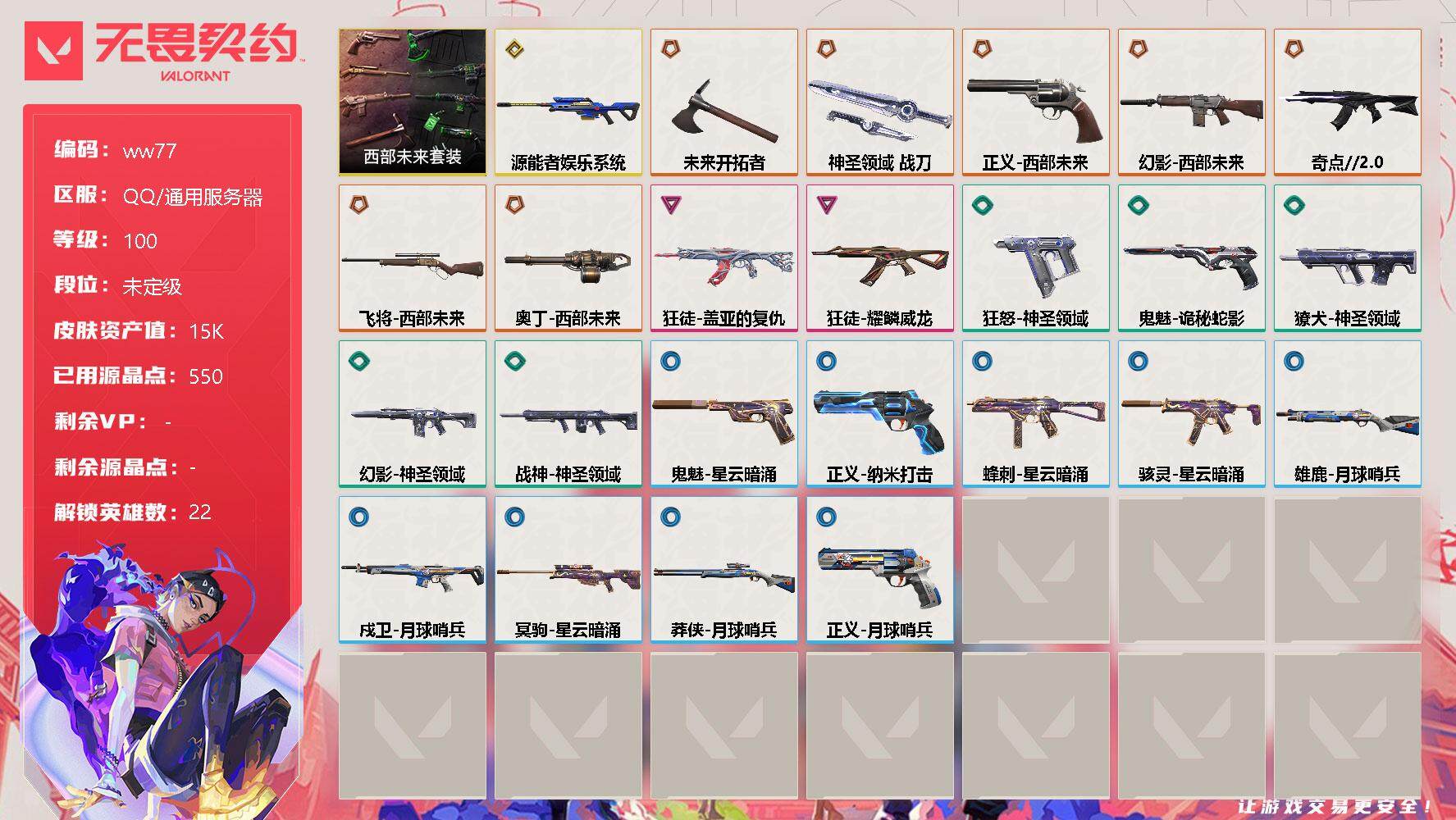 【云游堂】 【可二次实名】【ww77】【套装】:西部未来套装 【英雄】:幻棱,炼狱,暮蝶,钛狐,壹决,铁臂,捷风,雷兹,幽影,不死鸟,贤者,猎枭,蝰蛇,零,芮娜,奇乐,尚勃勒,霓虹,夜露,盖可,黑梦,钢锁 【近战 武器】:近战武器-未来开拓者,近战武器-神圣领域 战刀 【狂徒】:狂徒-奇点//2.0,狂徒-盖亚的复仇,狂徒-耀鳞威龙 【幻影】:幻影-西部未来,幻影-神圣领域,幻影-西部未来 【戍卫】:戍卫-月球哨兵 【獠犬】:獠犬-神圣领域 【冥驹】:冥驹-源能者娱乐系统,冥驹-星云暗涌 【飞将】:飞将-西部未来 【莽侠】:莽侠-月球哨兵 【战神】:战神-神圣领域 【奥丁】:奥丁-西部未来 【雄鹿】:雄鹿-月球哨兵 【骇灵】:骇灵-星云暗涌 【蜂刺】:蜂刺-星云暗涌 【正义】:正义-西部未来,正义-纳米打击,正义-月球哨兵 【鬼魅】:鬼魅-诡秘蛇影,鬼魅-星云暗涌 【狂怒】:狂怒-神圣领域 【卡面】:终章:激斗汉堡 卡面,进入射程 卡面,《双城之战》拥抱 卡面,精灵大战 卡面,欢迎来到底城 卡面,南瓜盛典 卡面,正义的化身 卡面,无畏契约GO!第一卷:芮娜 卡面,无畏契约GO!第一卷:零 卡面,代号红色 卡面,新兵报到 卡面,V契约 卡面,无畏契约 卡面 【喷漆】:嗨宝南瓜灯 喷漆,嘭! 喷漆,都算到了 喷漆,控场勿近 喷漆,熊抱 喷漆,买装还是存钱 喷漆,胜利属于无畏契约 喷漆,GLHF 喷漆,无畏契约 喷漆 【挂饰】:终章:猫猫木乃伊 挂饰,悠闲鸡块 挂饰,伞绳 挂饰,《双城之战》小蛋糕 挂饰,第九季//第三幕 纪念币 挂饰,无畏契约GO!第一卷 芮娜 挂饰,无畏契约GO!第一卷 零 挂饰,第九季//第二幕 纪念币 挂饰,Z世代特饮 挂饰,天外飞客 挂饰,无畏契约 纪念币 挂饰