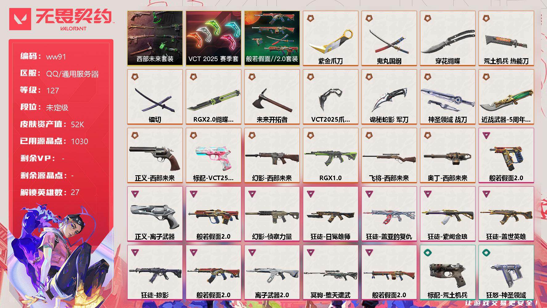 【云游堂】 【可二次实名】【ww91】【套装】:VCT 2025 赛季套装,西部未来套装,般若假面//2.0套装 【英雄】:幻棱,炼狱,维斯,暮蝶,钛狐,壹决,铁臂,捷风,雷兹,幽影,不死鸟,贤者,猎枭,蝰蛇,零,芮娜,奇乐,尚勃勒,霓虹,斯凯,夜露,星礈,K/O,海神,盖可,黑梦,钢锁 【近战 武器】:近战武器-5周年//公测重制版 苍龙之刃,近战武器-穿花蝴蝶,近战武器-RGX 11z Pro//2.0 蝴蝶刀,近战武器-VCT 2025 爪刀,近战武器-紫金爪刀,近战武器-镭切,近战武器-鬼丸国纲,近战武器-未来开拓者,近战武器-荒土机兵 热能刀,近战武器-诡秘蛇影 军刀,近战武器-神圣领域 战刀 【狂徒】:狂徒-RGX 11z Pro,狂徒-般若假面//2.0,狂徒-掠影,狂徒-盖世英雄,狂徒-盖亚的复仇,狂徒-日冕雄师,狂徒-紫阙金琅,狂徒-离子武器//2.0,狂徒-荒土机兵,狂徒-诡秘蛇影 【幻影】:幻影-西部未来,幻影-侦察力量,幻影-神圣领域,幻影-纳米打击,幻影-末日之翼,幻影-西部未来 【戍卫】:戍卫-逆冲蛮牛,戍卫-月球哨兵,戍卫-折光棱晶 【獠犬】:獠犬-般若假面//2.0,獠犬-神圣领域,獠犬-逆冲蛮牛 【冥驹】:冥驹-堕天遗武,冥驹-荒土机兵,冥驹-星云暗涌 【飞将】:飞将-西部未来,飞将-末日之翼 【莽侠】:莽侠-诡秘蛇影,莽侠-月球哨兵 【战神】:战神-般若假面//2.0,战神-神圣领域 【奥丁】:奥丁-西部未来,奥丁-纳米打击,奥丁-末日之翼 【判官】:判官-诡秘蛇影,判官-纳米打击x 【雄鹿】:雄鹿-逆冲蛮牛,雄鹿-月球哨兵 【骇灵】:骇灵-荒土机兵,骇灵-星云暗涌 【蜂刺】:蜂刺-星云暗涌,蜂刺-折光棱晶 【标配】:标配-荒土机兵,标配-折光棱晶 【VCT手枪】:标配-VCT25 x BLG 【正义】:正义-西部未来,正义-离子武器,正义-纳米打击,正义-月球哨兵 【鬼魅】:鬼魅-流星兵团,鬼魅-诡秘蛇影,鬼魅-星云暗涌 【狂怒】:狂怒-般若假面//2.0,狂怒-神圣领域,狂怒-逆冲蛮牛 【短炮】:短炮-末日之翼 【卡面】:进入射程 卡面,分崩离析 卡面,纳米打击 卡面,抑制技术 卡面,激斗汉堡 卡面,瓦娃脸雪糕 P2 卡面,从黄昏到黎明 卡面,荒土机兵 卡面,银弹猎手 卡面,逆冲蛮牛 卡面,《双城之战》拥抱 卡面,精灵大战 卡面,欢迎来到底城 卡面,南瓜盛典 卡面,热舞环节 卡面,Clutch 卡面,梦幻奶茶 卡面,趁热吃 卡面,源能反应 卡面,零点嗅探设计图 卡面,沙雕爆能器 卡面,无畏契约GO!第一卷:芮娜 卡面,清除名单 卡面,无畏契约GO!第一卷:零 卡面,龍记 卡面,《双城之战》金克丝 卡面,完美调谐 卡面 ,暗枪 卡面,无畏契约GO!第一卷:贤者 卡面,代号红色 卡面,新兵报到 卡面,V契约 卡面,无畏契约 卡面 【喷漆】:小小心意 喷漆,战“素”兔 喷漆,宇宙的指引 喷漆,请求重启 喷漆,逆冲蛮牛 喷漆,纳米打击 喷漆,鼻尖上的蝴蝶 喷漆,简笔画黯兽 喷漆,独守蝰腹 喷漆,他们将落荒而逃 喷漆,通缉:战术企鹅 喷漆,荒土机兵 喷漆,别挡我吃球! 喷漆,嗨宝南瓜灯 喷漆,嘭! 喷漆,都算到了 喷漆,控场勿近 喷漆,高丽风情小熊 喷漆,审判之爪 喷漆,拼一枪 喷漆,我觉得不行 喷漆,我的刀呢? 喷漆,新潮流 喷漆,双击点赞 喷漆,买装还是存钱 喷漆,醒狮贺春 喷漆,关门放狗 喷漆,酷熊冲浪 喷漆,蕊形灯 喷漆,胜利属于无畏契约 喷漆,GLHF 喷漆,无畏契约 喷漆 【挂饰】:终章:猫猫木乃伊 挂饰,荒土机兵 挂饰,悠闲鸡块 挂饰,猫猫木乃伊 挂饰,水壶 挂饰,纳米打击 挂饰,逆冲蛮牛 挂饰,可爱糖糖 挂饰,伞绳 挂饰,《双城之战》小蛋糕 挂饰,第九季//第三幕 纪念币 挂饰,薰衣草之心 挂饰,Z世代特饮 挂饰,第九季//第一幕 纪念币 挂饰,终章:迷你机甲 挂饰,战术河童 挂饰,荧光棒 挂饰,第八季//第三幕 纪念币 挂饰,传世莲华 挂饰,第八季//第二幕 纪念币 挂饰 ,天外飞客 挂饰,好运福爪 挂饰,第八季//第一幕 纪念币 挂饰,海豹的认可 挂饰,无畏契约 纪念币 挂饰