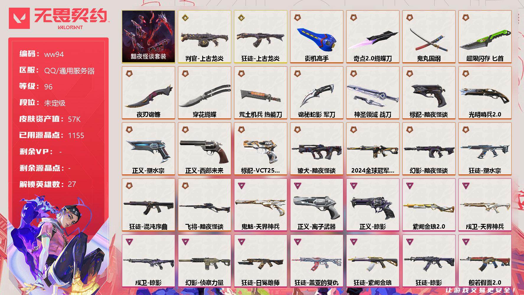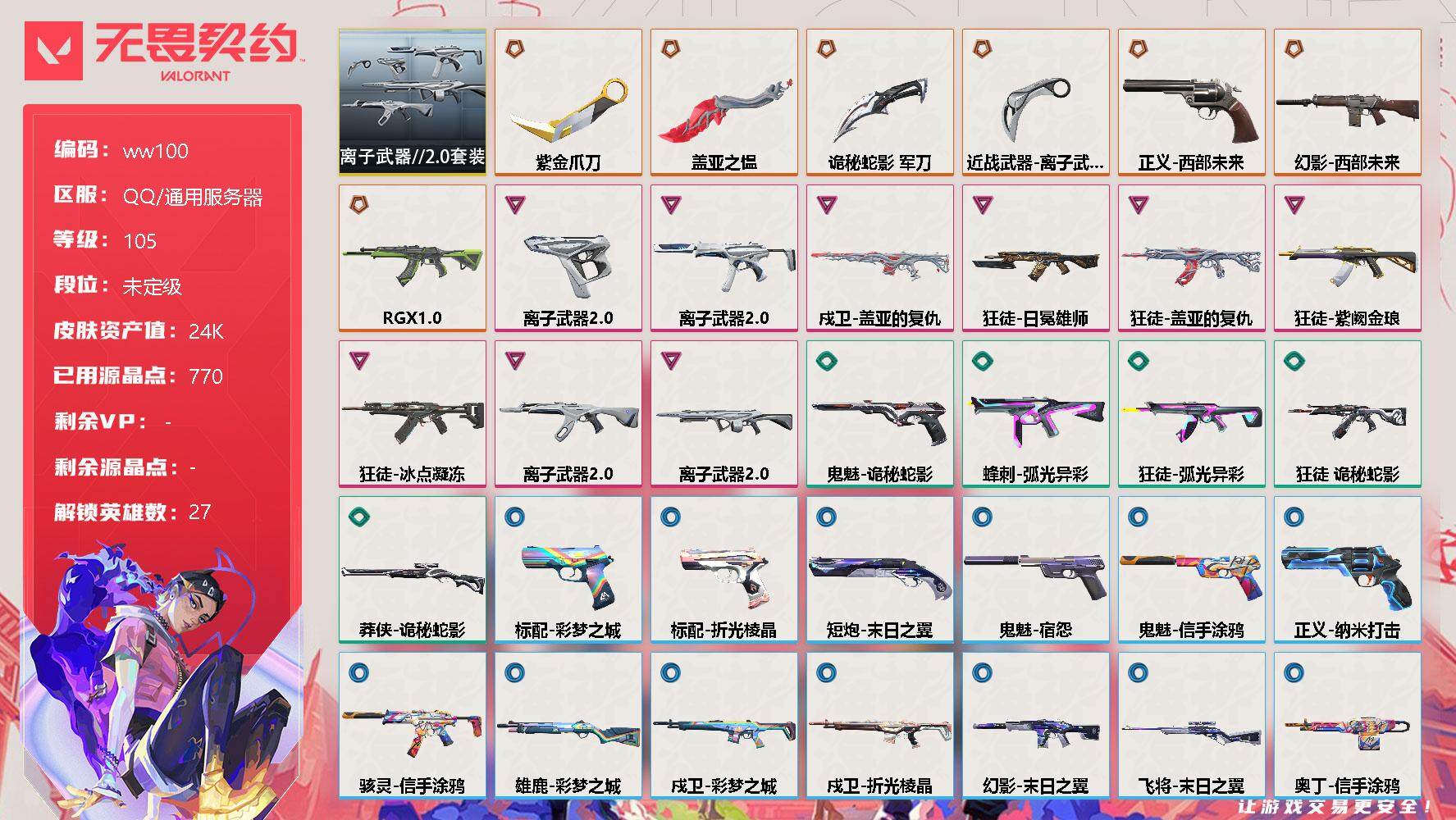 【云游堂】 【可二次实名】【ww86】【英雄】:幻棱,炼狱,维斯,暮蝶,壹决,铁臂,捷风,不死鸟,贤者,猎枭,芮娜,奇乐,K/O 【近战 武器】:近战武器-黑波之刃,近战武器-天玄刀,近战武器-诡秘蛇影 军刀,近战武器-神圣领域 战刀 【狂徒】:狂徒-塑水宗,狂徒-RGX 11z Pro,狂徒-盖亚的复仇,狂徒-海洋之星,狂徒-离子武器//2.0,狂徒-诡秘蛇影 【幻影】:幻影-侦察力量,幻影-神圣领域,幻影-末日之翼 【戍卫】:戍卫-月球哨兵,戍卫-折光棱晶 【獠犬】:獠犬-神圣领域 【冥驹】:冥驹-星云暗涌 【飞将】:飞将-西部未来,飞将-末日之翼 【莽侠】:莽侠-诡秘蛇影,莽侠-月球哨兵 【战神】:战神-神圣领域 【奥丁】:奥丁-末日之翼 【判官】:判官-诡秘蛇影 【雄鹿】:雄鹿-月球哨兵 【骇灵】:骇灵-星云暗涌 【蜂刺】:蜂刺-星云暗涌,蜂刺-折光棱晶 【标配】:标配-折光棱晶 【正义】:正义-西部未来,正义-月球哨兵 【鬼魅】:鬼魅-诡秘蛇影,鬼魅-星云暗涌 【狂怒】:狂怒-神圣领域 【短炮】:短炮-末日之翼 【卡面】:南瓜盛典 卡面,树懒大作战 卡面,无畏契约GO!第一卷:零 卡面,无垠星环 卡面,《双城之战》金克丝 卡面,代号红色 卡面,新兵报到 卡面,V契约 卡面,无畏契约 卡面 【喷漆】:买装还是存钱 喷漆,放下武器 喷漆,胜利属于无畏契约 喷漆,GLHF 喷漆,无畏契约 喷漆 【挂饰】:动力机箱 挂饰,天外飞客 挂饰,无畏契约 纪念币 挂饰