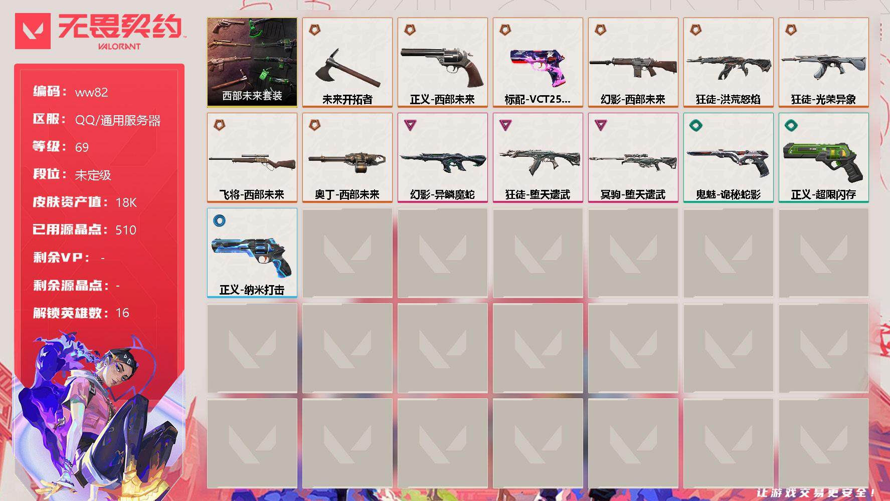 【云游堂】 【可二次实名】【ww82】【套装】:西部未来套装 【英雄】:幻棱,炼狱,维斯,暮蝶,钛狐,壹决,铁臂,捷风,不死鸟,贤者,猎枭,蝰蛇,芮娜,奇乐,斯凯,盖可 【近战 武器】:近战武器-未来开拓者 【狂徒】:狂徒-洪荒怒焰,狂徒-光荣异象,狂徒-堕天遗武 【幻影】:幻影-西部未来,幻影-异鳞魔蛇,幻影-西部未来 【冥驹】:冥驹-堕天遗武 【飞将】:飞将-西部未来 【奥丁】:奥丁-西部未来 【VCT手枪】:标配-VCT25 x PRX 【正义】:正义-西部未来,正义-超限闪存,正义-纳米打击 【鬼魅】:鬼魅-诡秘蛇影 【卡面】:进入射程 卡面,《双城之战》拥抱 卡面,精灵大战 卡面,欢迎来到底城 卡面,南瓜盛典 卡面,VCT CN首冠 卡面,修车达人 卡面,热舞环节 卡面,正义的化身 卡面,时间到 卡面,最高舞台 卡面,树懒大作战 卡面,Clutch 卡面,梦幻奶茶 卡面,无畏契约GO!第一卷:芮娜 卡面,无畏契约GO!第一卷:零 卡面,无畏契约GO!第一卷:贤者 卡面,纪念照 P2 卡面,代号红色 卡面,新兵报到 卡面,V契约 卡面,无畏契约 卡面 【喷漆】:嗨宝南瓜灯 喷漆,嘭! 喷漆,都算到了 喷漆,控场勿近 喷漆,小丑猫 喷漆,熊抱 喷漆,蛋糕还是爆能器? 喷漆,超级粉丝 喷漆,捷风差距 喷漆,拼一枪 喷漆,买装还是存钱 喷漆,关门放狗 喷漆,无畏契约GO!第一卷:芮娜 喷漆,胜利属于无畏契约 喷漆,GLHF 喷漆,无畏契约 喷漆 【挂饰】:终章:猫猫木乃伊 挂饰,悠闲鸡块 挂饰,伞绳 挂饰,《双城之战》小蛋糕 挂饰,第九季//第三幕 纪念币 挂饰,工具腰带 挂饰,无畏契约GO!第一卷 芮娜 挂饰,无畏契约GO!第一卷 零 挂饰,鱼骨头 挂饰,熔岩灯 挂饰,瞬云履 挂饰,第九季//第二幕 纪念币 挂饰,袖珍捷风 挂饰,Z世代特饮 挂饰,第九季//第一幕 纪念币 挂饰,天外飞客 挂饰,《双城之战》魄罗 挂饰,无畏契约 纪念币 挂饰