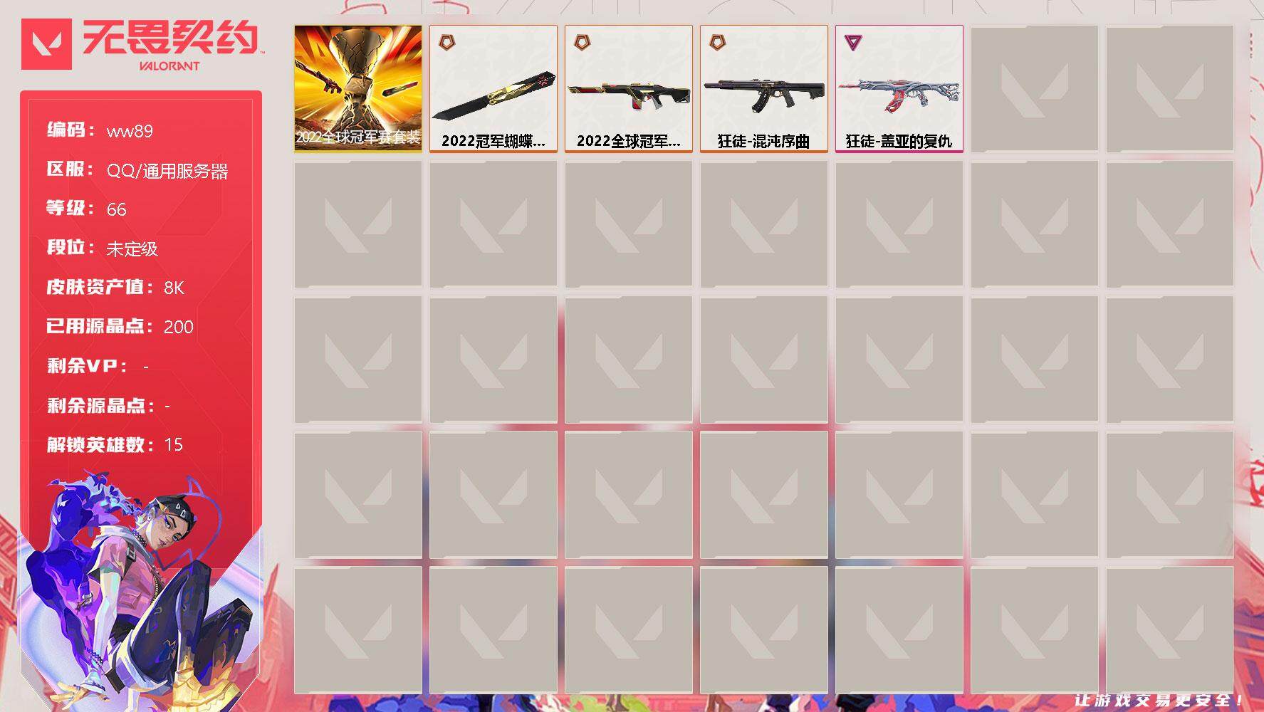 【云游堂】 【可二次实名】【ww89】【套装】:2022全球冠军赛套装 【英雄】:炼狱,维斯,暮蝶,壹决,捷风,不死鸟,贤者,猎枭,零,芮娜,尚勃勒,霓虹,海神,盖可,黑梦 【近战 武器】:近战武器-2022全球冠军赛 蝴蝶刀 【狂徒】:狂徒-混沌序曲,狂徒-盖亚的复仇 【幻影】:幻影-2022全球冠军赛 【卡面】:正义的化身 卡面,时间到 卡面,最高舞台 卡面,梦幻奶茶 卡面,无畏契约GO!第一卷:芮娜 卡面,无畏契约GO!第一卷:零 卡面,无垠星环 卡面,《双城之战》金克丝 卡面,代号红色 卡面,新兵报到 卡面,V契约 卡面,无畏契约 卡面 【喷漆】:纳米打击 喷漆,熊抱 喷漆,超级粉丝 喷漆,捷风差距 喷漆,审判之爪 喷漆,拼一枪 喷漆,买装还是存钱 喷漆,酷熊冲浪 喷漆,暴走萝莉 喷漆,放下武器 喷漆,胜利属于无畏契约 喷漆,GLHF 喷漆,无畏契约 喷漆 【挂饰】:无畏契约GO!第一卷 芮娜 挂饰,无畏契约GO!第一卷 零 挂饰,第九季//第二幕 纪念币 挂饰,袖珍捷风 挂饰,第九季//第一幕 纪念币 挂饰,天外飞客 挂饰,无畏契约 纪念币 挂饰