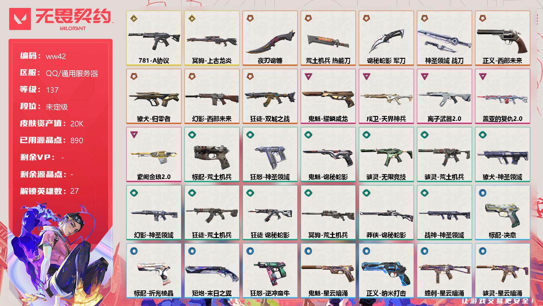 【云游堂】 【可二次实名】【ww42】【英雄】:幻棱,炼狱,维斯,暮蝶,钛狐,壹决,铁臂,捷风,雷兹,幽影,不死鸟,贤者,猎枭,蝰蛇,零,芮娜,奇乐,尚勃勒,霓虹,斯凯,夜露,星礈,K/O,海神,盖可,黑梦,钢锁 【近战 武器】:近战武器-荒土机兵 热能刀,近战武器-夜刃诡镰,近战武器-诡秘蛇影 军刀,近战武器-神圣领域 战刀 【狂徒】:狂徒-双城之战,狂徒-离子武器//2.0,狂徒-荒土机兵,狂徒-诡秘蛇影 【幻影】:幻影-西部未来,幻影-神圣领域,幻影-纳米打击,幻影-末日之翼,幻影-西部未来 【戍卫】:戍卫-天界神兵,戍卫-逆冲蛮牛,戍卫-月球哨兵,戍卫-折光棱晶 【獠犬】:獠犬-归零者,獠犬-神圣领域,獠犬-逆冲蛮牛 【冥驹】:冥驹-上古龙炎,冥驹-荒土机兵,冥驹-星云暗涌 【飞将】:飞将-末日之翼 【莽侠】:莽侠-诡秘蛇影,莽侠-月球哨兵 【战神】:战神-盖亚的复仇//2.0,战神-神圣领域 【奥丁】:奥丁-紫阙金琅//2.0,奥丁-纳米打击,奥丁-末日之翼 【判官】:判官-诡秘蛇影,判官-纳米打击x 【雄鹿】:雄鹿-逆冲蛮牛,雄鹿-月球哨兵 【骇灵】:骇灵-781-A协议,骇灵-荒土机兵,骇灵-无限竞技,骇灵-星云暗涌 【蜂刺】:蜂刺-星云暗涌,蜂刺-折光棱晶 【标配】:标配-荒土机兵,标配-决意,标配-折光棱晶 【正义】:正义-西部未来,正义-纳米打击,正义-月球哨兵 【鬼魅】:鬼魅-耀鳞威龙,鬼魅-诡秘蛇影,鬼魅-星云暗涌 【狂怒】:狂怒-神圣领域,狂怒-逆冲蛮牛 【短炮】:短炮-末日之翼 【卡面】:终章:激斗汉堡 卡面,进入射程 卡面,分崩离析 卡面,纳米打击 卡面,抑制技术 卡面,激斗汉堡 卡面,瓦娃脸雪糕 P2 卡面,从黄昏到黎明 卡面,荒土机兵 卡面,银弹猎手 卡面,逆冲蛮牛 卡面,《双城之战》拥抱 卡面,精灵大战 卡面,欢迎来到底城 卡面,南瓜盛典 卡面,无畏契约:暮蝶 卡面,树懒大作战 卡面,Clutch 卡面,无畏契约GO!第一卷:芮娜 卡面,无畏契约GO!第一卷:零 卡面,无垠星环 卡面,《双城之战》金克丝 卡面,无畏契约GO!第一卷:贤者 卡面,钢锁vs盖可 卡面,代号红色 卡面,新兵报到 卡面,V契约 卡面,无畏契约 卡面 【喷漆】:小小心意 喷漆,战“素”兔 喷漆,宇宙的指引 喷漆,请求重启 喷漆,逆冲蛮牛 喷漆,纳米打击 喷漆,鼻尖上的蝴蝶 喷漆,简笔画黯兽 喷漆,独守蝰腹 喷漆,他们将落荒而逃 喷漆,通缉:战术企鹅 喷漆,荒土机兵 喷漆,别挡我吃球! 喷漆,嗨宝南瓜灯 喷漆,嘭! 喷漆,都算到了 喷漆,控场勿近 喷漆,伤心心 喷漆,喜欢哪种毒? 喷漆,买装还是存钱 喷漆,关门放狗 喷漆,无畏契约GO!第一卷:芮娜 喷漆,放下武器 喷漆,胜利属于无畏契约 喷漆,GLHF 喷漆,无畏契约 喷漆 【挂饰】:终章:猫猫木乃伊 挂饰,荒土机兵 挂饰,悠闲鸡块 挂饰,猫猫木乃伊 挂饰,水壶 挂饰,纳米打击 挂饰,逆冲蛮牛 挂饰,可爱糖糖 挂饰,伞绳 挂饰,《双城之战》小蛋糕 挂饰,第九季//第三幕 纪念币 挂饰,无畏契约GO!第一卷 零 挂饰,瞬云履 挂饰,动力机箱 挂饰,天外飞客 挂饰,《双城之战》魄罗 挂饰,无畏契约 纪念币 挂饰