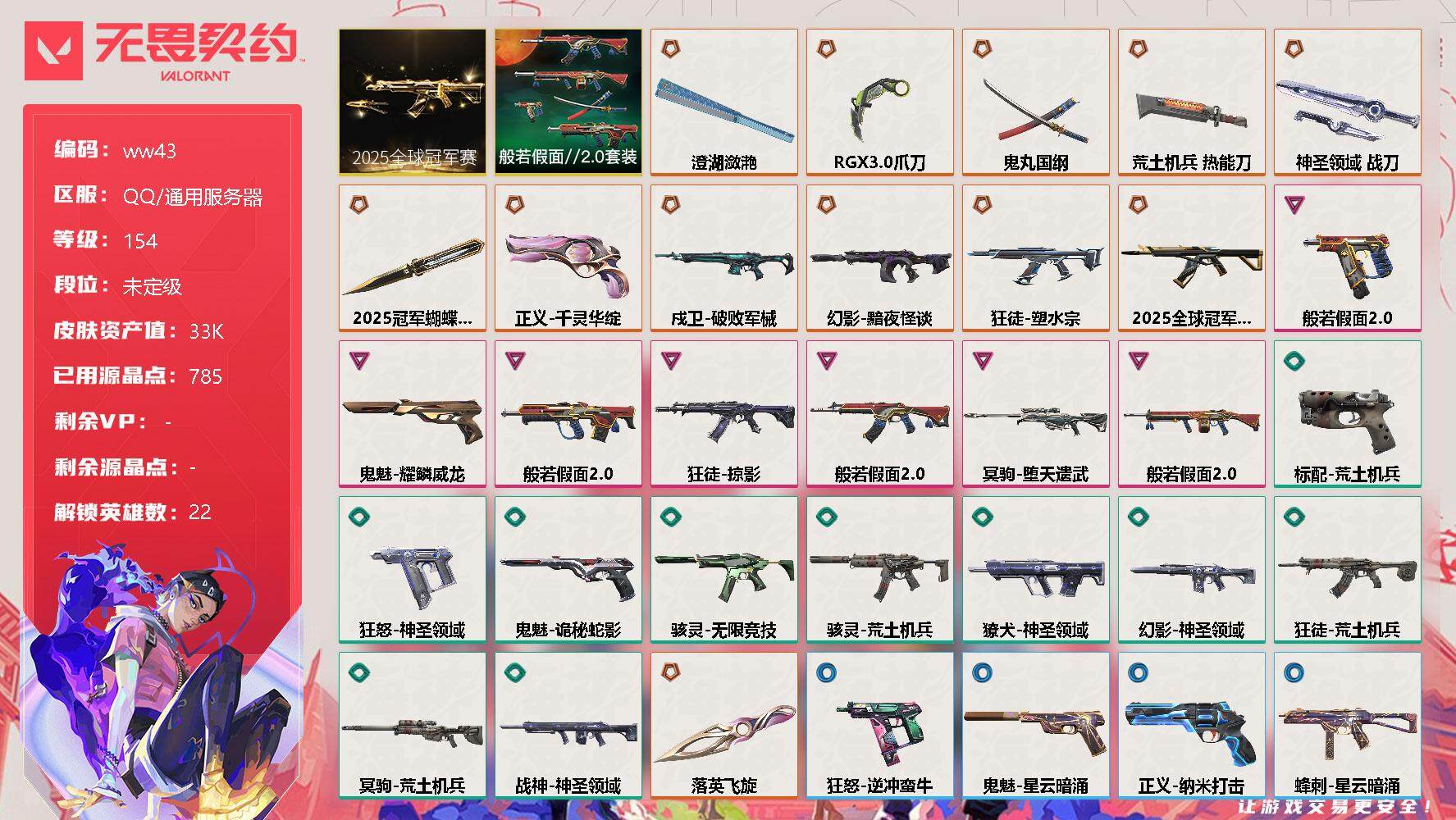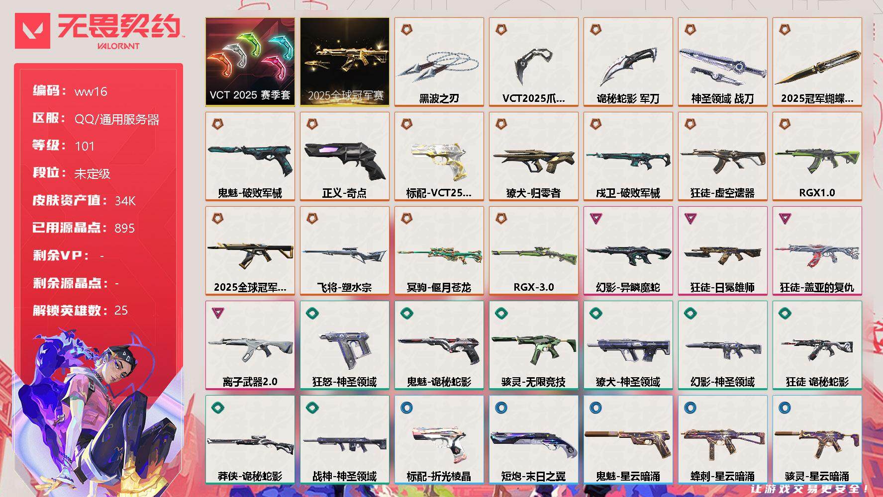 【云游堂】 【可二次实名】【ww16】【套装】:2025全球冠军赛套装,VCT 2025 赛季套装 【英雄】:幻棱,炼狱,维斯,暮蝶,钛狐,壹决,铁臂,捷风,雷兹,幽影,不死鸟,贤者,猎枭,蝰蛇,零,芮娜,奇乐,尚勃勒,霓虹,斯凯,夜露,K/O,盖可,黑梦,钢锁 【近战 武器】:近战武器-2025全球冠军赛 蝴蝶刀,近战武器-VCT 2025 爪刀,近战武器-黑波之刃,近战武器-诡秘蛇影 军刀,近战武器-神圣领域 战刀 【狂徒】:狂徒-2025全球冠军赛,狂徒-虚空遗器,狂徒-RGX 11z Pro,狂徒-盖亚的复仇,狂徒-日冕雄师,狂徒-离子武器//2.0,狂徒-诡秘蛇影 【幻影】:幻影-异鳞魔蛇,幻影-神圣领域,幻影-末日之翼 【戍卫】:戍卫-破败军械,戍卫-月球哨兵,戍卫-折光棱晶 【獠犬】:獠犬-归零者,獠犬-神圣领域 【冥驹】:冥驹-偃月苍龙,冥驹-星云暗涌 【飞将】:飞将-塑水宗,飞将-末日之翼 【莽侠】:莽侠-RGX 11z Pro//3.0,莽侠-诡秘蛇影,莽侠-月球哨兵 【战神】:战神-神圣领域 【奥丁】:奥丁-末日之翼 【判官】:判官-诡秘蛇影 【雄鹿】:雄鹿-月球哨兵 【骇灵】:骇灵-无限竞技,骇灵-星云暗涌 【蜂刺】:蜂刺-星云暗涌,蜂刺-折光棱晶 【标配】:标配-折光棱晶 【VCT手枪】:标配-VCT25 x TH 【正义】:正义-奇点,正义-月球哨兵 【鬼魅】:鬼魅-破败军械,鬼魅-诡秘蛇影,鬼魅-星云暗涌 【狂怒】:狂怒-神圣领域 【短炮】:短炮-末日之翼 【卡面】:《双城之战》拥抱 卡面,欢迎来到底城 卡面,南瓜盛典 卡面,红鳞松叶 卡面,梦幻奶茶 卡面,零点嗅探设计图 卡面,无畏契约GO!第一卷:芮娜 卡面,清除名单 卡面,无畏契约GO!第一卷:零 卡面,《双城之战》金克丝 卡面,无畏契约GO!第一卷:贤者 卡面,代号红色 卡面,新兵报到 卡面,V契约 卡面,无畏契约 卡面 【喷漆】:都算到了 喷漆,新潮流 喷漆,买装还是存钱 喷漆,关门放狗 喷漆,无畏契约GO!第一卷:芮娜 喷漆,胜利属于无畏契约 喷漆,GLHF 喷漆,无畏契约 喷漆 【挂饰】:第八季//第三幕 纪念币 挂饰,天外飞客 挂饰,红鳞松叶 挂饰,《双城之战》魄罗 挂饰,无畏契约 纪念币 挂饰