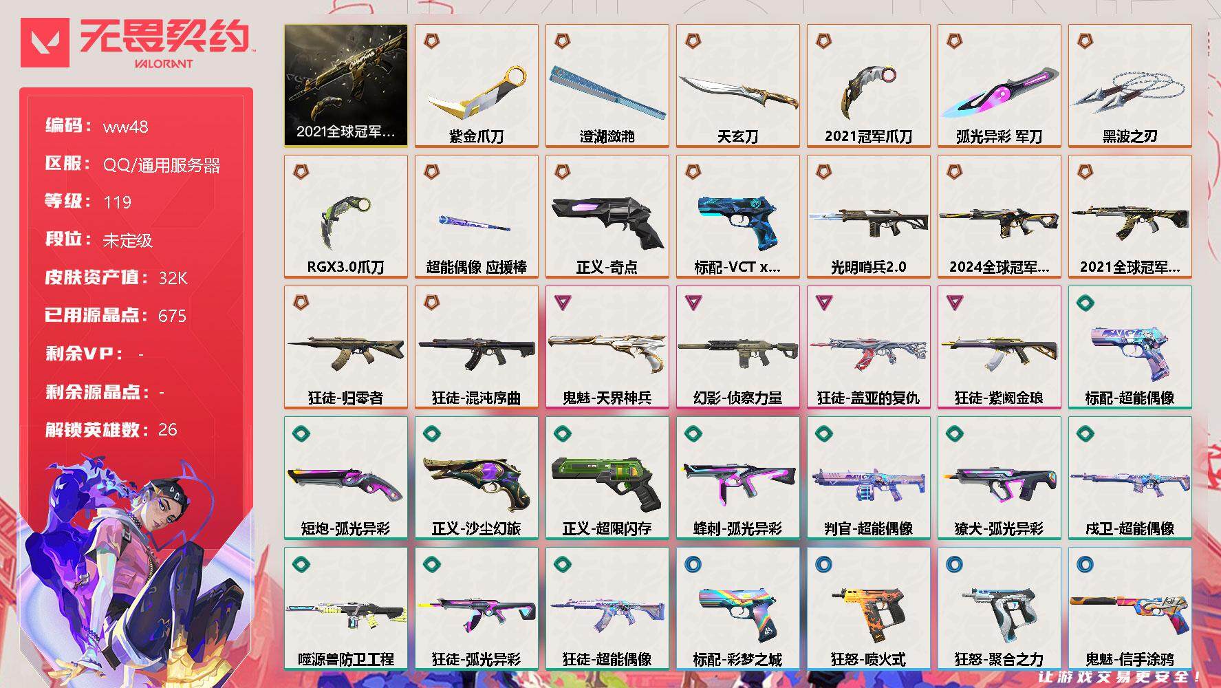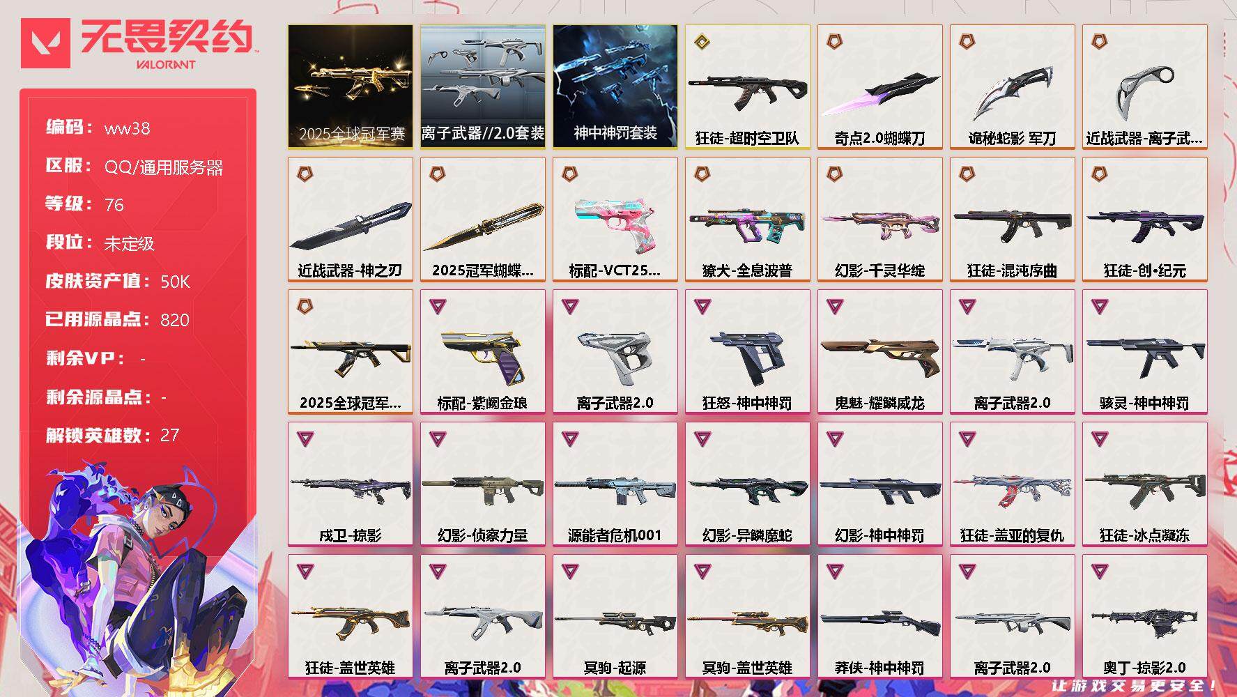 【云游堂】 【可二次实名】【ww38】【套装】:2025全球冠军赛套装,离子武器//2.0套装,神中神罚套装 【英雄】:幻棱,炼狱,维斯,暮蝶,钛狐,壹决,铁臂,捷风,雷兹,幽影,不死鸟,贤者,猎枭,蝰蛇,零,芮娜,奇乐,尚勃勒,霓虹,斯凯,夜露,星礈,K/O,海神,盖可,黑梦,钢锁 【近战 武器】:近战武器-2025全球冠军赛 蝴蝶刀,近战武器-神之刃,近战武器-奇点//2.0 蝴蝶刀,近战武器-离子武器//2.0 爪刀,近战武器-诡秘蛇影 军刀 【狂徒】:狂徒-超时空卫队,狂徒-2025全球冠军赛,狂徒-混沌序曲,狂徒-创·纪元,狂徒-冰点凝冻,狂徒-盖世英雄,狂徒-盖亚的复仇,狂徒-离子武器//2.0,狂徒-诡秘蛇影 【幻影】:幻影-千灵华绽,幻影-源能者危机001,幻影-侦察力量,幻影-异鳞魔蛇,幻影-神中神罚,幻影-末日之翼 【戍卫】:戍卫-掠影,戍卫-折光棱晶 【獠犬】:獠犬-全息波普 【冥驹】:冥驹-盖世英雄,冥驹-起源 【飞将】:飞将-末日之翼 【莽侠】:莽侠-神中神罚,莽侠-诡秘蛇影 【战神】:战神-离子武器//2.0 【奥丁】:奥丁-掠影//2.0,奥丁-末日之翼 【判官】:判官-诡秘蛇影 【骇灵】:骇灵-离子武器//2.0,骇灵-神中神罚 【蜂刺】:蜂刺-折光棱晶 【标配】:标配-紫阙金琅,标配-折光棱晶 【VCT手枪】:标配-VCT25 x BLG 【鬼魅】:鬼魅-耀鳞威龙,鬼魅-诡秘蛇影 【狂怒】:狂怒-离子武器//2.0,狂怒-神中神罚 【短炮】:短炮-末日之翼 【卡面】:梦幻奶茶 卡面,源能反应 卡面,零点嗅探设计图 卡面,沙雕爆能器 卡面,无畏契约GO!第一卷:芮娜 卡面,清除名单 卡面,无畏契约GO!第一卷:零 卡面,《双城之战》金克丝 卡面,铁臂设计图 卡面,代号红色 卡面,冰淇淋店 卡面,新兵报到 卡面,V契约 卡面,无畏契约 卡面 【喷漆】:蛋糕还是爆能器? 喷漆,我的刀呢? 喷漆,新潮流 喷漆,双击点赞 喷漆,买装还是存钱 喷漆,放下武器 喷漆,老铁困了 喷漆,口袋贤者 喷漆,胜利属于无畏契约 喷漆,GLHF 喷漆,无畏契约 喷漆 【挂饰】:第八季//第三幕 纪念币 挂饰,传世莲华 挂饰,第八季//第二幕 纪念币 挂饰 ,天外飞客 挂饰,红鳞松叶 挂饰,海豹的认可 挂饰,第七季//第三幕 纪念币 挂饰,幸运中国结 挂饰,无畏契约 纪念币 挂饰