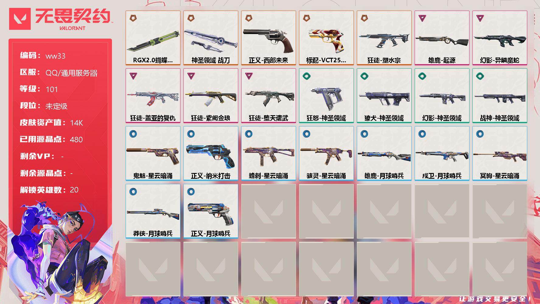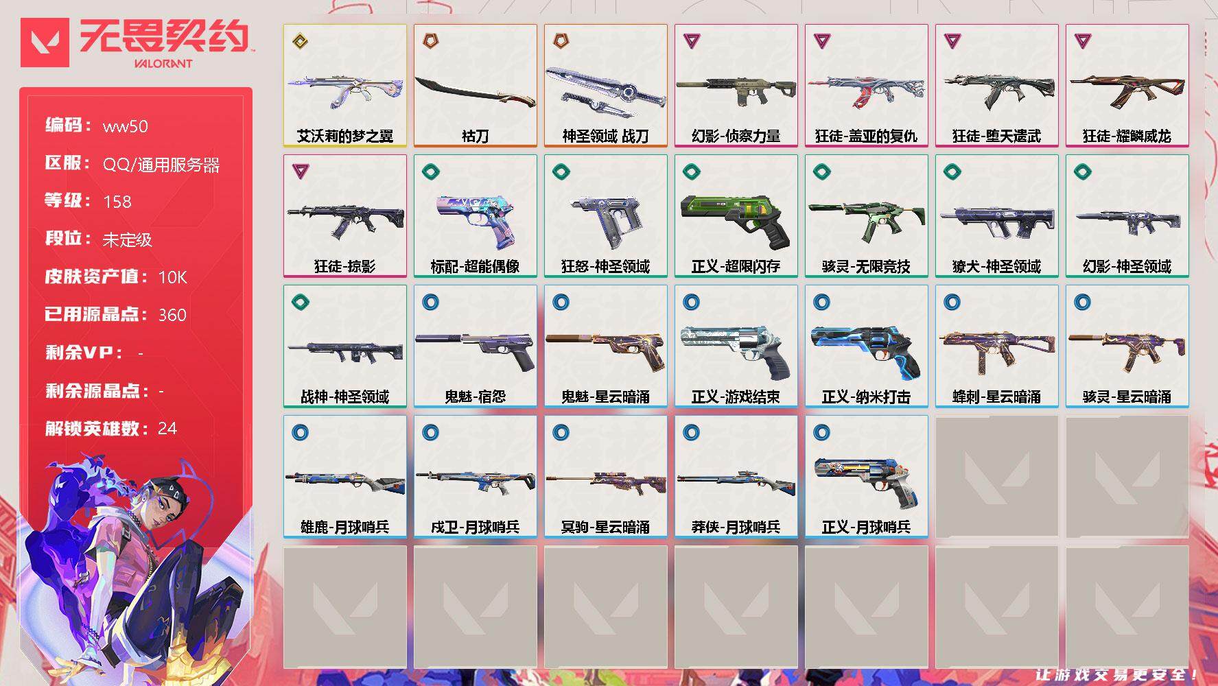 【云游堂】 【可二次实名】【ww33】【英雄】:炼狱,维斯,暮蝶,钛狐,壹决,铁臂,捷风,雷兹,不死鸟,贤者,猎枭,蝰蛇,零,芮娜,奇乐,尚勃勒,霓虹,斯凯,夜露,盖可 【近战 武器】:近战武器-RGX 11z Pro//2.0 蝴蝶刀,近战武器-神圣领域 战刀 【狂徒】:狂徒-塑水宗,狂徒-堕天遗武,狂徒-盖亚的复仇,狂徒-紫阙金琅 【幻影】:幻影-异鳞魔蛇,幻影-神圣领域 【戍卫】:戍卫-月球哨兵 【獠犬】:獠犬-神圣领域 【冥驹】:冥驹-星云暗涌 【莽侠】:莽侠-月球哨兵 【战神】:战神-神圣领域 【雄鹿】:雄鹿-起源,雄鹿-月球哨兵 【骇灵】:骇灵-星云暗涌 【蜂刺】:蜂刺-星云暗涌 【VCT手枪】:标配-VCT25 x EDG 【正义】:正义-西部未来,正义-纳米打击,正义-月球哨兵 【鬼魅】:鬼魅-星云暗涌 【狂怒】:狂怒-神圣领域 【卡面】:终章:激斗汉堡 卡面,进入射程 卡面,《双城之战》拥抱 卡面,精灵大战 卡面,欢迎来到底城 卡面,南瓜盛典 卡面,修车达人 卡面,正义的化身 卡面,梦幻奶茶 卡面,无畏契约:蝰蛇 卡面,无畏契约GO!第一卷:芮娜 卡面,无畏契约GO!第一卷:零 卡面,代号红色 卡面,新兵报到 卡面,V契约 卡面,无畏契约 卡面 【喷漆】:嗨宝南瓜灯 喷漆,嘭! 喷漆,都算到了 喷漆,控场勿近 喷漆,小丑猫 喷漆,熊抱 喷漆,捷风差距 喷漆,喜欢哪种毒? 喷漆,买装还是存钱 喷漆,胜利属于无畏契约 喷漆,GLHF 喷漆,无畏契约 喷漆 【挂饰】:终章:猫猫木乃伊 挂饰,悠闲鸡块 挂饰,伞绳 挂饰,《双城之战》小蛋糕 挂饰,第九季//第三幕 纪念币 挂饰,无畏契约GO!第一卷 芮娜 挂饰,无畏契约GO!第一卷 零 挂饰,熔岩灯 挂饰,第九季//第二幕 纪念币 挂饰,袖珍捷风 挂饰,VCT x EDG 挂饰,深海水族 挂饰 ,天外飞客 挂饰,无畏契约 纪念币 挂饰