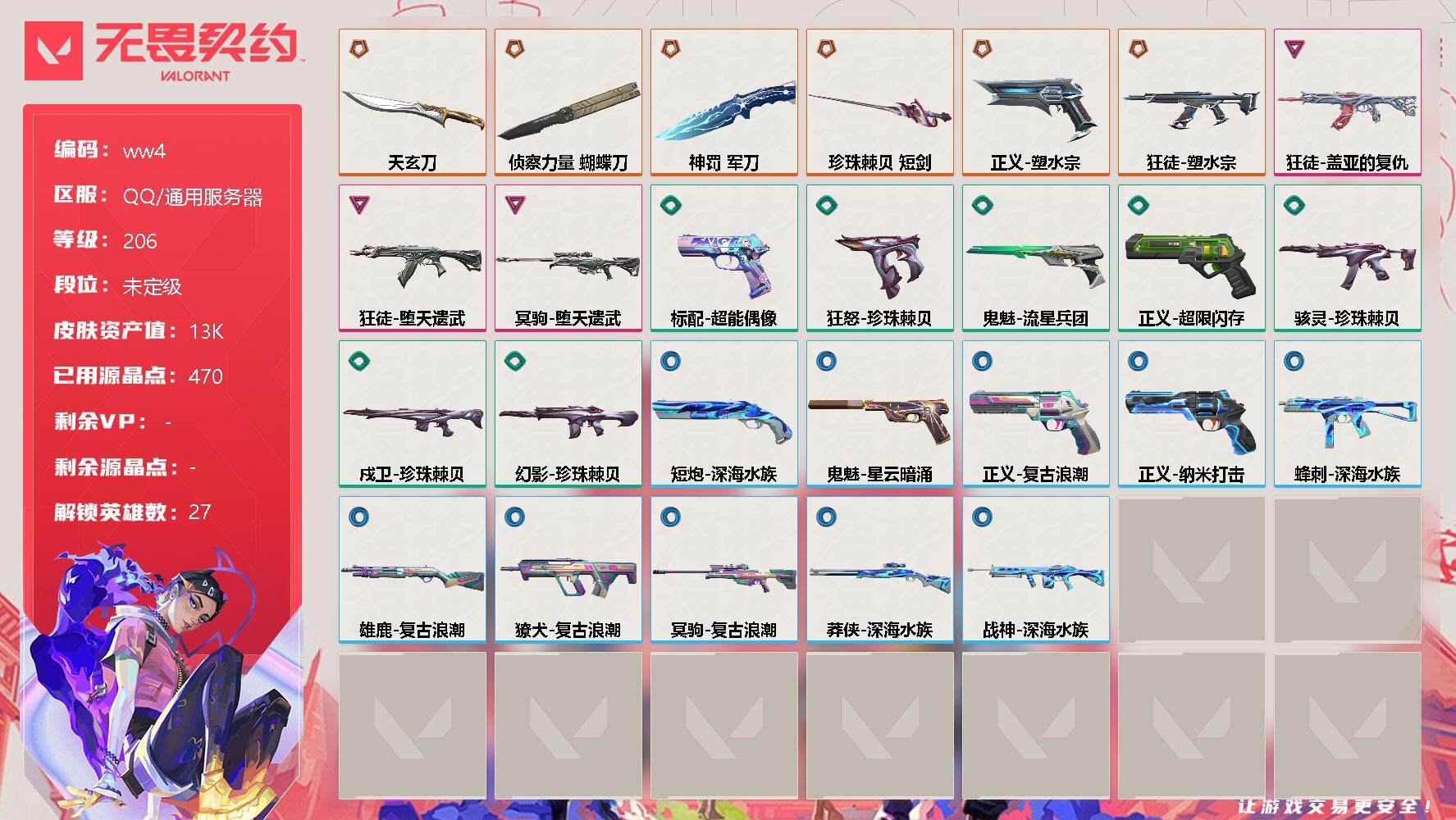 【云游堂】 【可二次实名】【ww4】【英雄】:幻棱,炼狱,维斯,暮蝶,钛狐,壹决,铁臂,捷风,雷兹,幽影,不死鸟,贤者,猎枭,蝰蛇,零,芮娜,奇乐,尚勃勒,霓虹,斯凯,夜露,星礈,K/O,海神,盖可,黑梦,钢锁 【近战 武器】:近战武器-侦察力量 蝴蝶刀,近战武器-珍珠棘贝 短剑,近战武器-神罚 军刀,近战武器-天玄刀 【狂徒】:狂徒-塑水宗,狂徒-堕天遗武,狂徒-盖亚的复仇 【幻影】:幻影-珍珠棘贝 【戍卫】:戍卫-珍珠棘贝 【獠犬】:獠犬-复古浪潮 【冥驹】:冥驹-堕天遗武,冥驹-复古浪潮 【莽侠】:莽侠-深海水族 【战神】:战神-深海水族 【雄鹿】:雄鹿-复古浪潮 【骇灵】:骇灵-珍珠棘贝 【蜂刺】:蜂刺-深海水族 【标配】:标配-超能偶像 【正义】:正义-塑水宗,正义-超限闪存,正义-复古浪潮,正义-纳米打击 【鬼魅】:鬼魅-流星兵团,鬼魅-星云暗涌 【狂怒】:狂怒-珍珠棘贝 【短炮】:短炮-深海水族 【卡面】:终章:激斗汉堡 卡面,进入射程 卡面,《双城之战》拥抱 卡面,精灵大战 卡面,欢迎来到底城 卡面,南瓜盛典 卡面,修车达人 卡面,正义的化身 卡面,终章:生意人麦宝 卡面,铁之华 卡面,时间到 卡面,最高舞台 卡面,声感陷阱设计图 卡面,梦幻奶茶 卡面,终章:打造专属狂徒 卡面,趁热吃 卡面,源能反应 卡面,零点嗅探设计图 卡面,终章:瓦娃脸雪糕 卡面,表象之下 卡面,虹吸式咖啡壶 卡面,源能者美容 卡面,脚踝终结者 卡面 ,夜班 卡面,瓦娃脸雪糕 卡面 ,沙雕爆能器 卡面,无畏契约GO!第一卷:芮娜 卡面,深海水族 卡面,珍珠棘贝 卡面,复古浪潮 卡面,盖可工牌 卡面,清除名单 卡面,无畏契约GO!第一卷:零 卡面,暗枪 卡面,代号红色 卡面,新兵报到 卡面,V契约 卡面,无畏契约 卡面 【喷漆】:嗨宝南瓜灯 喷漆,嘭! 喷漆,都算到了 喷漆,控场勿近 喷漆,小丑猫 喷漆,熊抱 喷漆,超级粉丝 喷漆,捷风差距 喷漆,惊声尖叫 喷漆,拼一枪 喷漆,我觉得不行 喷漆,我的刀呢? 喷漆,情绪控制 喷漆,哨卫滑步 喷漆,倒吸一口凉气 喷漆,UWU 喷漆,新潮流 喷漆,逮到一个 喷漆,一个人的孤岛 喷漆,双人比心 喷漆,不予置评 喷漆,三熊合一 喷漆,要喝完噢! 喷漆,双击点赞 喷漆,珍珠棘贝 喷漆,深海水族 喷漆,禁止标配 喷漆 ,铁臂尴尬 喷漆,买装还是存钱 喷漆,胜利属于无畏契约 喷漆,GLHF 喷漆,无畏契约 喷漆 【挂饰】:终章:猫猫木乃伊 挂饰,悠闲鸡块 挂饰,伞绳 挂饰,《双城之战》小蛋糕 挂饰,第九季//第三幕 纪念币 挂饰,工具腰带 挂饰,熔岩灯 挂饰,第九季//第二幕 纪念币 挂饰,终章:这瓜保熟 挂饰,糖葫芦 挂饰,袖珍捷风 挂饰,迷你浓缩 挂饰,第九季//第一幕 纪念币 挂饰,终章:迷你机甲 挂饰,战术河童 挂饰,荧光棒 挂饰,第八季//第三幕 纪念币 挂饰,终章:扭结饼干 挂饰 ,战术抓娃娃:阿丹 挂饰 ,瓶中信 挂饰,复古浪潮 挂饰,深海水母 挂饰,传世莲华 挂饰,扭结饼干 挂饰 ,珍珠棘贝 挂饰,深海水族 挂饰 ,第八季//第二幕 纪念币 挂饰 ,天外飞客 挂饰,第八季//第一幕 纪念币 挂饰,无畏契约 纪念币 挂饰