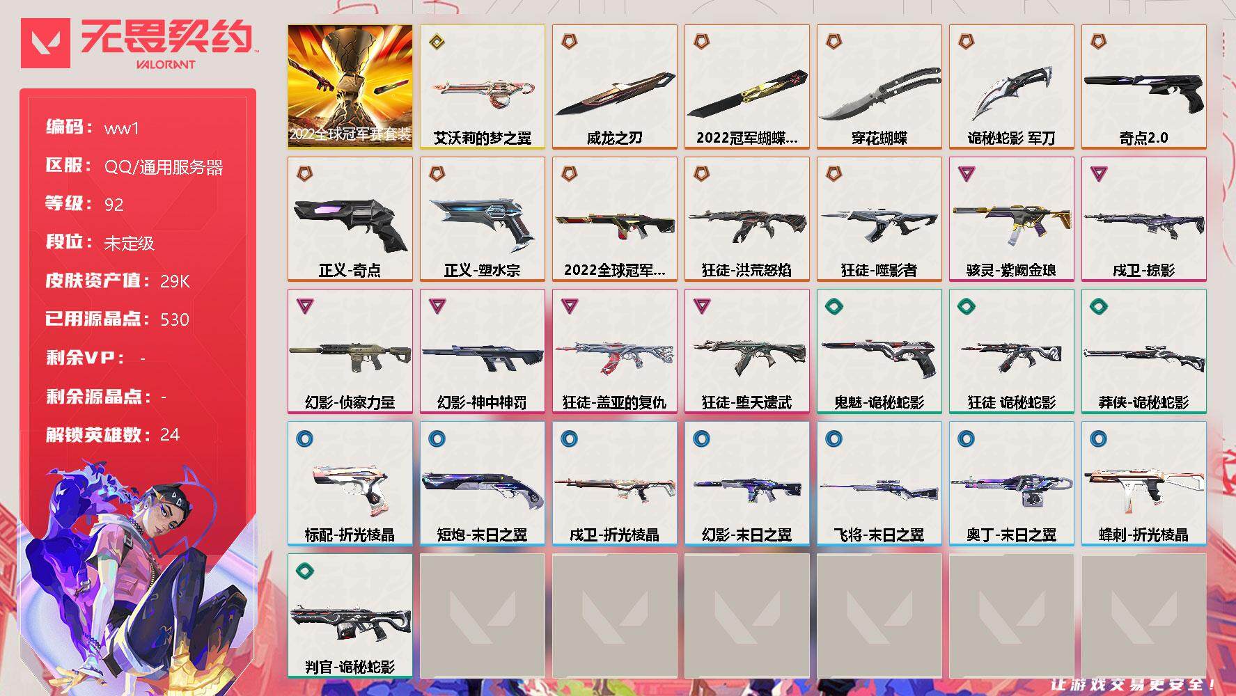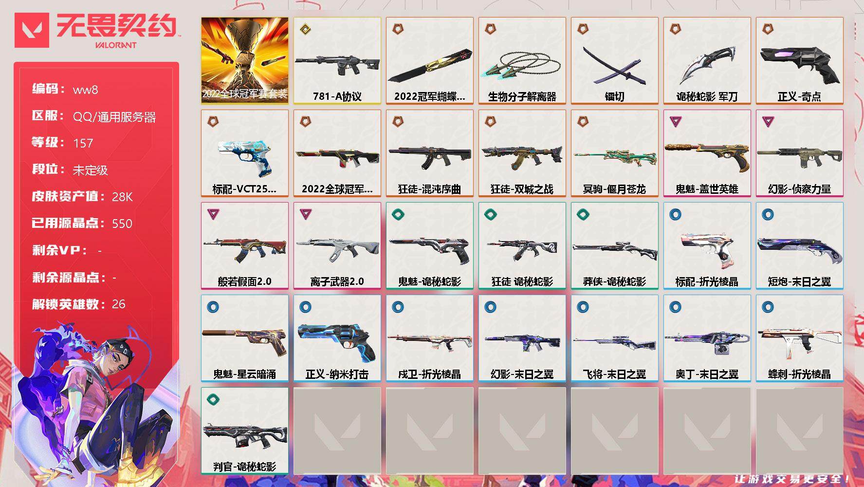 【云游堂】 【可二次实名】【ww145】【套装】:2022全球冠军赛套装 【英雄】:幻棱,炼狱,暮蝶,钛狐,壹决,铁臂,捷风,幽影,不死鸟,贤者,猎枭,蝰蛇,零,芮娜,奇乐,霓虹,斯凯,夜露,K/O,盖可 【近战 武器】:近战武器-2022全球冠军赛 蝴蝶刀,近战武器-镭切 【狂徒】:狂徒-混沌序曲,狂徒-光荣异象,狂徒-离子武器//2.0 【幻影】:幻影-2022全球冠军赛 【冥驹】:冥驹-偃月苍龙 【奥丁】:奥丁-掠影//2.0 【骇灵】:骇灵-艾沃莉的梦之翼,骇灵-无限竞技 【VCT手枪】:标配-VCT25 x BLG 【正义】:正义-奇点 【鬼魅】:鬼魅-掠影//2.0 【卡面】:银弹猎手 卡面,无畏契约:暮蝶 卡面,树懒大作战 卡面,无畏契约GO!第一卷:芮娜 卡面,无畏契约GO!第一卷:零 卡面,《双城之战》金克丝 卡面,夯实根基 卡面,代号红色 卡面,新兵报到 卡面,V契约 卡面,无畏契约 卡面 【喷漆】:伤心心 喷漆,霓光四射 喷漆,买装还是存钱 喷漆,关门放狗 喷漆,无畏契约GO!第一卷:贤者 喷漆,松叶 喷漆,胜利属于无畏契约 喷漆,GLHF 喷漆,无畏契约 喷漆 【挂饰】:无畏契约GO!第一卷 芮娜 挂饰,无畏契约GO!第一卷 零 挂饰,鱼骨头 挂饰,薰衣草之心 挂饰,动力机箱 挂饰,天外飞客 挂饰,红鳞松叶 挂饰,《双城之战》魄罗 挂饰,海豹的认可 挂饰,无畏契约 纪念币 挂饰