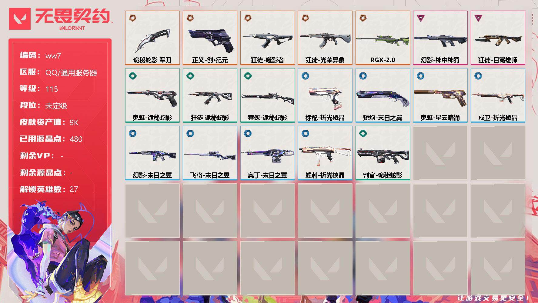 【云游堂】 【可二次实名】【ww7】【英雄】:幻棱,炼狱,维斯,暮蝶,钛狐,壹决,铁臂,捷风,雷兹,幽影,不死鸟,贤者,猎枭,蝰蛇,零,芮娜,奇乐,尚勃勒,霓虹,斯凯,夜露,星礈,K/O,海神,盖可,黑梦,钢锁 【近战 武器】:近战武器-诡秘蛇影 军刀 【狂徒】:狂徒-噬影者,狂徒-光荣异象,狂徒-日冕雄师,狂徒-诡秘蛇影 【幻影】:幻影-神中神罚,幻影-末日之翼 【戍卫】:戍卫-折光棱晶 【冥驹】:冥驹-RGX 11z Pro//2.0 【飞将】:飞将-末日之翼 【莽侠】:莽侠-诡秘蛇影 【奥丁】:奥丁-末日之翼 【判官】:判官-诡秘蛇影 【蜂刺】:蜂刺-折光棱晶 【标配】:标配-折光棱晶 【正义】:正义-创·纪元 【鬼魅】:鬼魅-诡秘蛇影,鬼魅-星云暗涌 【短炮】:短炮-末日之翼 【卡面】:精灵大战 卡面,南瓜盛典 卡面,零点嗅探设计图 卡面,龍记 卡面,暗枪 卡面,代号红色 卡面,新兵报到 卡面,V契约 卡面,无畏契约 卡面 【喷漆】:控场勿近 喷漆,醒狮贺春 喷漆,蕊形灯 喷漆,胜利属于无畏契约 喷漆,GLHF 喷漆,无畏契约 喷漆 【挂饰】:伞绳 挂饰,第九季//第三幕 纪念币 挂饰,好运福爪 挂饰,第八季//第一幕 纪念币 挂饰,无畏契约 纪念币 挂饰