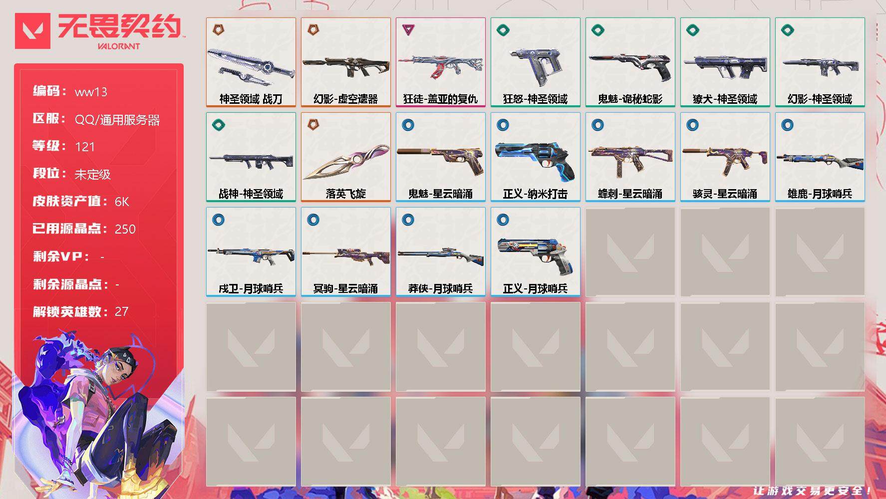 【云游堂】 【可二次实名】【ww27】【英雄】:幻棱,炼狱,维斯,暮蝶,钛狐,壹决,铁臂,捷风,雷兹,幽影,不死鸟,贤者,猎枭,蝰蛇,零,芮娜,奇乐,尚勃勒,霓虹,斯凯,夜露,星礈,K/O,盖可,黑梦,钢锁 【近战 武器】:近战武器-穿花蝴蝶,近战武器-诡秘蛇影 军刀,近战武器-神圣领域 战刀 【狂徒】:狂徒-混沌序曲,狂徒-塑水宗,狂徒-紫阙金琅,狂徒-诡秘蛇影 【幻影】:幻影-异鳞魔蛇,幻影-神圣领域,幻影-末日之翼 【戍卫】:戍卫-紫阙金琅,戍卫-月球哨兵,戍卫-折光棱晶 【獠犬】:獠犬-神圣领域 【冥驹】:冥驹-起源,冥驹-星云暗涌 【飞将】:飞将-末日之翼 【莽侠】:莽侠-诡秘蛇影,莽侠-月球哨兵 【战神】:战神-神圣领域 【奥丁】:奥丁-末日之翼 【判官】:判官-诡秘蛇影 【雄鹿】:雄鹿-月球哨兵 【骇灵】:骇灵-星云暗涌 【蜂刺】:蜂刺-星云暗涌,蜂刺-折光棱晶 【标配】:标配-折光棱晶 【正义】:正义-纳米打击,正义-月球哨兵 【鬼魅】:鬼魅-奇点//2.0,鬼魅-诡秘蛇影,鬼魅-星云暗涌 【狂怒】:狂怒-神圣领域 【短炮】:短炮-末日之翼 【卡面】:终章:激斗汉堡 卡面,进入射程 卡面,《双城之战》拥抱 卡面,精灵大战 卡面,欢迎来到底城 卡面,南瓜盛典 卡面,修车达人 卡面,正义的化身 卡面,梦幻奶茶 卡面,暮蝶工牌 卡面,无畏契约GO!第一卷:芮娜 卡面,无畏契约GO!第一卷:零 卡面,无畏契约GO!第一卷:贤者 卡面,势不可挡//K/O 卡面,代号红色 卡面,新兵报到 卡面,V契约 卡面,无畏契约 卡面 【喷漆】:嗨宝南瓜灯 喷漆,嘭! 喷漆,都算到了 喷漆,控场勿近 喷漆,熊抱 喷漆,买装还是存钱 喷漆,无畏契约GO!第一卷:芮娜 喷漆,胜利属于无畏契约 喷漆,GLHF 喷漆,无畏契约 喷漆 【挂饰】:终章:猫猫木乃伊 挂饰,悠闲鸡块 挂饰,伞绳 挂饰,《双城之战》小蛋糕 挂饰,第九季//第三幕 纪念币 挂饰,熔岩灯 挂饰,第九季//第二幕 纪念币 挂饰,天外飞客 挂饰,无畏契约 纪念币 挂饰