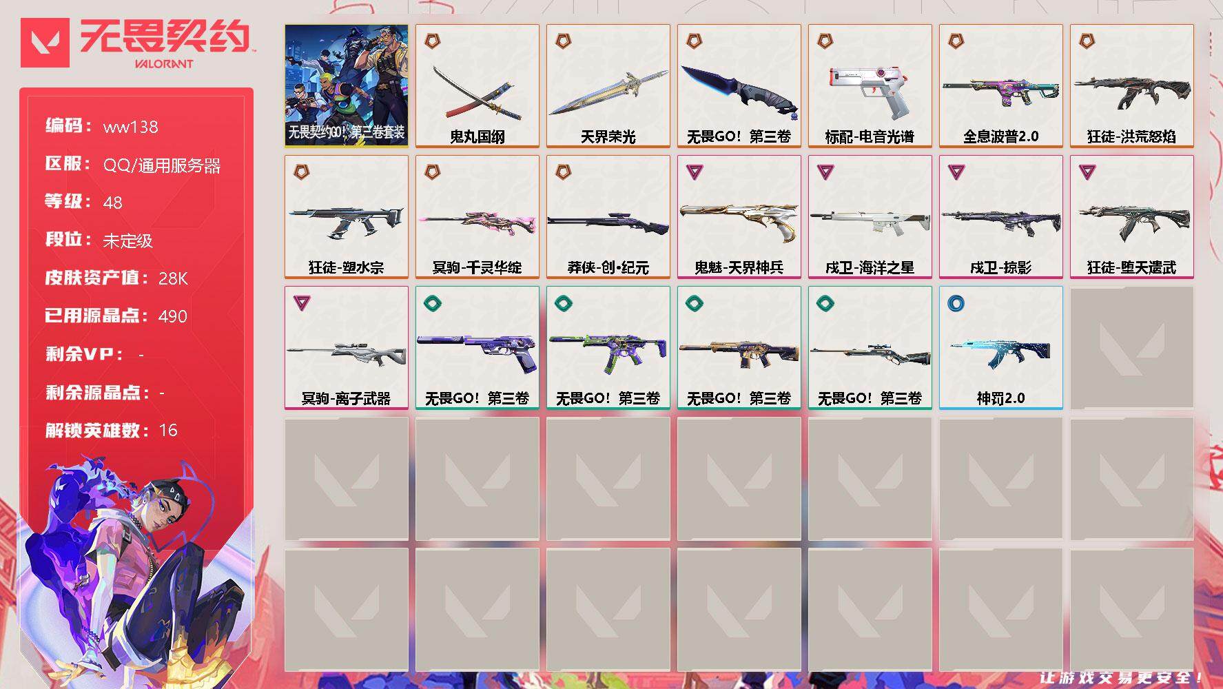 【云游堂】 【可二次实名】【ww138】【套装】:无畏契约GO!第三卷套装 【英雄】:炼狱,维斯,壹决,铁臂,捷风,不死鸟,贤者,猎枭,零,芮娜,奇乐,尚勃勒,霓虹,K/O,盖可,钢锁 【近战 武器】:近战武器-无畏契约GO!第三卷 匕首,近战武器-鬼丸国纲,近战武器-天界荣光 【狂徒】:狂徒-洪荒怒焰,狂徒-塑水宗,狂徒-堕天遗武,狂徒-神罚//2.0 【幻影】:幻影-全息波普//2.0,幻影-无畏契约GO!第三卷 【戍卫】:戍卫-掠影,戍卫-海洋之星 【冥驹】:冥驹-千灵华绽,冥驹-离子武器 【飞将】:飞将-无畏契约GO!第三卷 【莽侠】:莽侠-创·纪元 【骇灵】:骇灵-无畏契约GO!第三卷 【标配】:标配-电音光谱,标配-电音光谱 【鬼魅】:鬼魅-天界神兵,鬼魅-无畏契约GO!第三卷 【卡面】:Clutch 卡面,无畏契约GO!第一卷:芮娜 卡面,《双城之战》金克丝 卡面,代号红色 卡面,新兵报到 卡面,V契约 卡面,无畏契约 卡面 【喷漆】:关门放狗 喷漆,胜利属于无畏契约 喷漆,GLHF 喷漆,无畏契约 喷漆 【挂饰】:无畏契约 纪念币 挂饰
