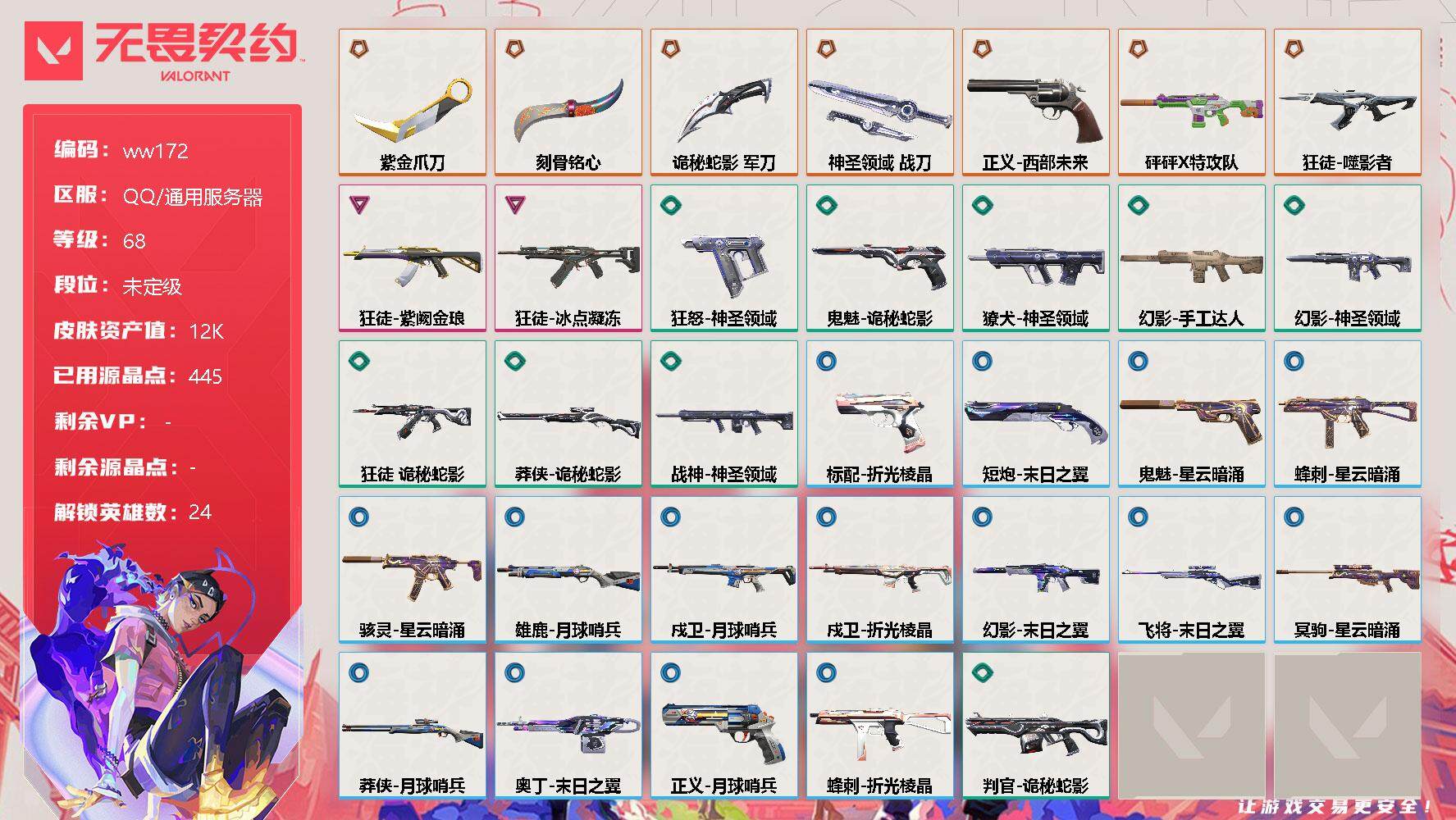【云游堂】 【可二次实名】【ww174】【英雄】:幻棱,炼狱,暮蝶,钛狐,壹决,铁臂,捷风,雷兹,幽影,不死鸟,贤者,猎枭,零,芮娜,霓虹,星礈,K/O,盖可 【近战 武器】:近战武器-RGX 11z Pro//2.0 蝴蝶刀,近战武器-紫金爪刀,近战武器-澄湖潋滟,近战武器-鬼丸国纲,近战武器-诡秘蛇影 军刀,近战武器-神圣领域 战刀 【狂徒】:狂徒-艾沃莉的梦之翼,狂徒-2025全球冠军赛,狂徒-塑水宗,狂徒-RGX 11z Pro,狂徒-堕天遗武,狂徒-盖世英雄,狂徒-盖亚的复仇,狂徒-诡秘蛇影 【幻影】:幻影-千灵华绽,幻影-电音光谱,幻影-迷邃星云,幻影-冬季仙境,幻影-神圣领域,幻影-末日之翼,幻影-电音光谱 【戍卫】:戍卫-月球哨兵,戍卫-折光棱晶 【獠犬】:獠犬-神圣领域 【冥驹】:冥驹-星云暗涌 【飞将】:飞将-塑水宗,飞将-末日之翼 【莽侠】:莽侠-诡秘蛇影,莽侠-月球哨兵 【战神】:战神-离子武器//2.0,战神-神圣领域 【奥丁】:奥丁-艾沃莉的梦之翼,奥丁-末日之翼 【判官】:判官-诡秘蛇影 【雄鹿】:雄鹿-月球哨兵 【骇灵】:骇灵-创·纪元,骇灵-星云暗涌 【蜂刺】:蜂刺-星云暗涌,蜂刺-折光棱晶 【标配】:标配-电音光谱,标配-折光棱晶,标配-电音光谱 【VCT手枪】:标配-VCT25 x LOUD 【正义】:正义-西部未来,正义-月球哨兵 【鬼魅】:鬼魅-盖亚的复仇,鬼魅-诡秘蛇影,鬼魅-星云暗涌 【狂怒】:狂怒-神圣领域 【短炮】:短炮-末日之翼 【卡面】:精灵大战 卡面,欢迎来到底城 卡面,南瓜盛典 卡面,无畏契约GO!第一卷:芮娜 卡面,无畏契约GO!第一卷:零 卡面,《双城之战》金克丝 卡面,无畏契约GO!第一卷:贤者 卡面,代号红色 卡面,新兵报到 卡面,V契约 卡面,无畏契约 卡面 【喷漆】:都算到了 喷漆,控场勿近 喷漆,小丑猫 喷漆,买装还是存钱 喷漆,胜利属于无畏契约 喷漆,GLHF 喷漆,无畏契约 喷漆 【挂饰】:第九季//第三幕 纪念币 挂饰,薰衣草之心 挂饰,天外飞客 挂饰,插电音乐 挂饰,无畏契约 纪念币 挂饰