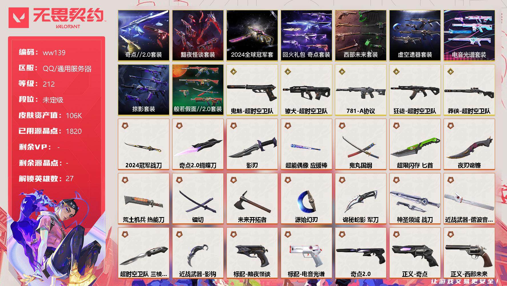 【云游堂】 【可二次实名】【ww139】【套装】:2024全球冠军赛套装,超时空卫队套装,电音光谱套装,虚空遗器套装,西部未来套装,奇点//2.0套装,黯夜怪谈套装,回火礼包:奇点套装,般若假面//2.0套装,掠影套装 【英雄】:幻棱,炼狱,维斯,暮蝶,钛狐,壹决,铁臂,捷风,雷兹,幽影,不死鸟,贤者,猎枭,蝰蛇,零,芮娜,奇乐,尚勃勒,霓虹,斯凯,夜露,星礈,K/O,海神,盖可,黑梦,钢锁 【近战 武器】:近战武器-2024全球冠军赛 战刀,近战武器-影钩,近战武器-超时空卫队 三棱军刺,近战武器-谐波音谱,近战武器-奇点//2.0 蝴蝶刀,近战武器-镭切,近战武器-鬼丸国纲,近战武器-源始幻刃,近战武器-未来开拓者,近战武器-超能偶像 应援棒,近战武器-超限闪存 匕首,近战武器-荒土机兵 热能刀,近战武器-夜刃诡镰,近战武器-影刃,近战武器-诡秘蛇影 军刀,近战武器-神圣领域 战刀 【狂徒】:狂徒-超时空卫队,狂徒-2025全球冠军赛,狂徒-归零者,狂徒-洪荒怒焰,狂徒-混沌序曲,狂徒-奇点//2.0,狂徒-虚空遗器,狂徒-般若假面//2.0,狂徒-堕天遗武,狂徒-掠影,狂徒-盖亚的复仇,狂徒-日冕雄师,狂徒-紫阙金琅,狂徒-超能偶像,狂徒-荒土机兵,狂徒-诡秘蛇影 【幻影】:幻影-781-A协议,幻影-2024全球冠军赛,幻影-黯夜怪谈,幻影-奇点,幻影-西部未来,幻影-虚空遗器,幻影-电音光谱,幻影-侦察力量,幻影-超限闪存,幻影-神圣领域,幻影-聚合之力,幻影-纳米打击,幻影-末日之翼,幻影-西部未来,幻影-电音光谱 【戍卫】:戍卫-电音光谱,戍卫-掠影,戍卫-超能偶像,戍卫-浮光跃金,戍卫-逆冲蛮牛,戍卫-月球哨兵,戍卫-折光棱晶,戍卫-电音光谱 【獠犬】:獠犬-超时空卫队,獠犬-黯夜怪谈,獠犬-电音光谱,獠犬-般若假面//2.0,獠犬-神圣领域,獠犬-采蜜小蜂队,獠犬-模拟赫兹,獠犬-逆冲蛮牛,獠犬-电音光谱 【冥驹】:冥驹-掠影,冥驹-荒土机兵,冥驹-模拟赫兹,冥驹-星云暗涌 【飞将】:飞将-黯夜怪谈,飞将-西部未来,飞将-聚合之力,飞将-末日之翼 【莽侠】:莽侠-超时空卫队,莽侠-超限闪存,莽侠-诡秘蛇影,莽侠-月球哨兵 【战神】:战神-般若假面//2.0,战神-神圣领域,战神-采蜜小蜂队,战神-浮光跃金 【奥丁】:奥丁-西部未来,奥丁-纳米打击,奥丁-末日之翼 【判官】:判官-虚空遗器,判官-超能偶像,判官-诡秘蛇影,判官-采蜜小蜂队,判官-纳米打击x 【雄鹿】:雄鹿-模拟赫兹,雄鹿-逆冲蛮牛,雄鹿-月球哨兵 【骇灵】:骇灵-奇点,骇灵-荒土机兵,骇灵-浮光跃金,骇灵-星云暗涌 【蜂刺】:蜂刺-超限闪存,蜂刺-聚合之力,蜂刺-星云暗涌,蜂刺-折光棱晶 【标配】:标配-黯夜怪谈,标配-电音光谱,标配-超能偶像,标配-荒土机兵,标配-浮光跃金,标配-折光棱晶,标配-电音光谱 【正义】:正义-奇点,正义-西部未来,正义-虚空遗器,正义-掠影,正义-超限闪存,正义-沙尘幻旅,正义-纳米打击,正义-月球哨兵 【鬼魅】:鬼魅-超时空卫队,鬼魅-奇点//2.0,鬼魅-诡秘蛇影,鬼魅-采蜜小蜂队,鬼魅-光导纤维,鬼魅-模拟赫兹,鬼魅-星云暗涌 【狂怒】:狂怒-般若假面//2.0,狂怒-神圣领域,狂怒-聚合之力,狂怒-逆冲蛮牛 【短炮】:短炮-蛇吻,短炮-末日之翼 【卡面】:终章:激斗汉堡 卡面,进入射程 卡面,分崩离析 卡面,纳米打击 卡面,抑制技术 卡面,激斗汉堡 卡面,瓦娃脸雪糕 P2 卡面,从黄昏到黎明 卡面,荒土机兵 卡面,银弹猎手 卡面,逆冲蛮牛 卡面,《双城之战》拥抱 卡面,精灵大战 卡面,欢迎来到底城 卡面,南瓜盛典 卡面,唱片的故事 卡面,钢弓与箭弦 卡面,排除故障 卡面,奇点//2.0 卡面,战术桌游 卡面,悠享食光 卡面,修车达人 卡面,模拟赫兹 卡面,浮光跃金 卡面,超限闪存 卡面,维斯工牌 卡面,正义的化身 卡面,至黑之夜 卡面,终章:生意人麦宝 卡面,铁之华 卡面,2024全球冠军赛 卡面,失而复得 卡面,时间到 卡面,最高舞台 卡面,复活专家 卡面,归乡 // 蝰蛇 卡面,超能偶像 卡面,生意人麦宝 卡面,树懒大作战 卡面,声感陷阱设计图 卡面,Clutch 卡面,钢锁工牌 卡面,战术小伙伴的夏日 卡面,采蜜小蜂队 卡面,聚合之力 卡面,梦幻奶茶 卡面,暮蝶工牌 卡面,源能反应 卡面,零点嗅探设计图 卡面,无畏契约:蝰蛇 卡面,沙雕爆能器 卡面,无畏契约GO!第一卷:芮娜 卡面,清除名单 卡面,无畏契约GO!第一卷:零 卡面,龍记 卡面,化茧成蝶 卡面,无垠星环 卡面,《双城之战》金克丝 卡面,完美调谐 卡面 ,暗枪 卡面,无畏契约GO!第一卷:贤者 卡面,终章:黑影先生的咖啡! 卡面,铁臂vs雷兹 卡面,钢锁vs盖