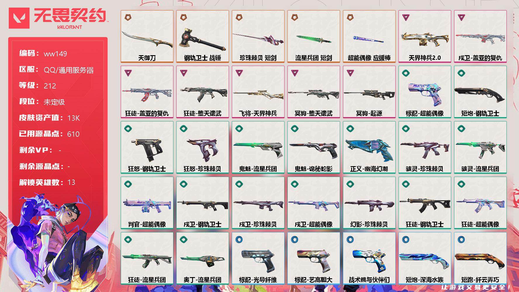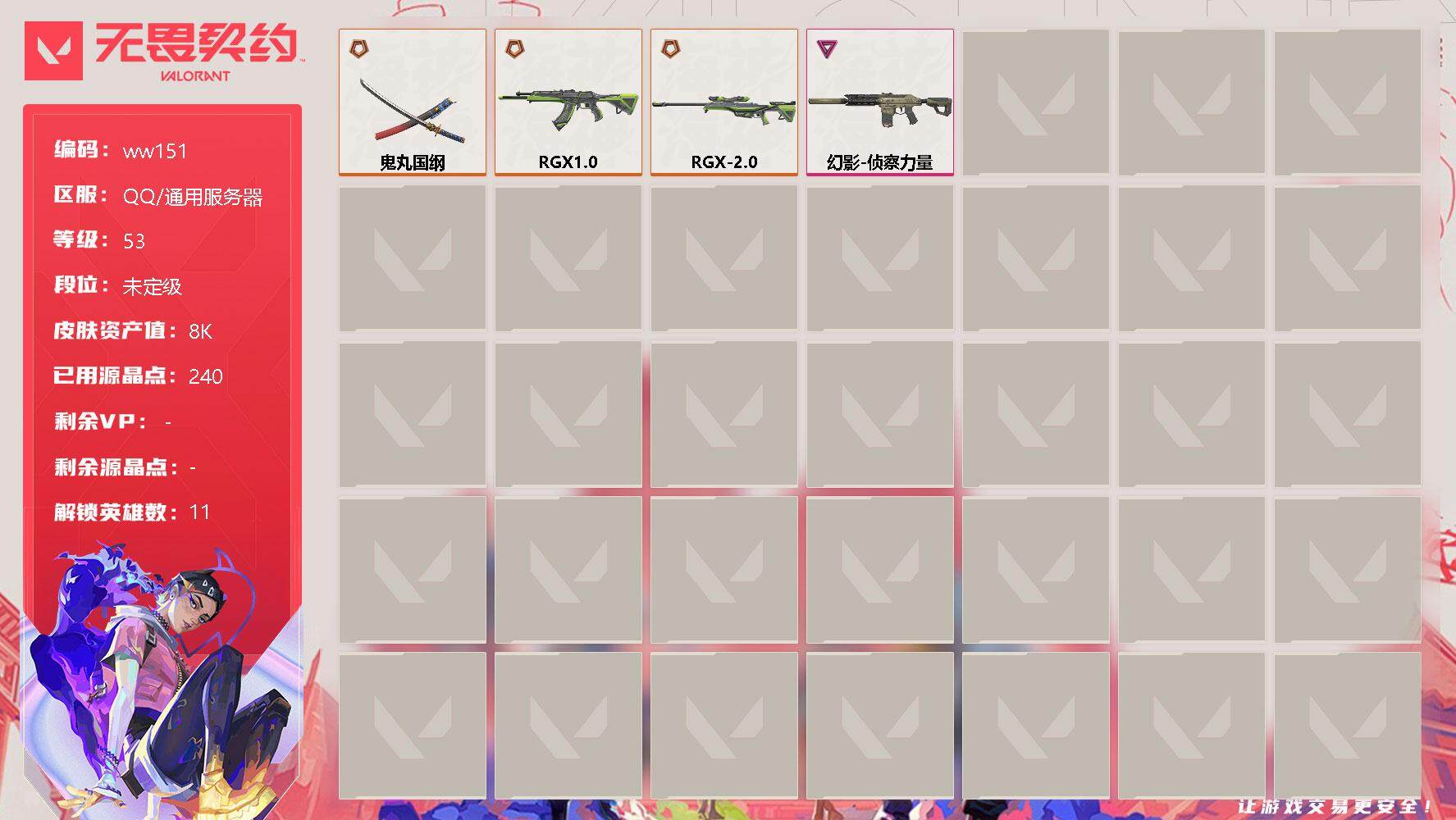 【云游堂】 【可二次实名】【ww151】【英雄】:幻棱,炼狱,暮蝶,壹决,捷风,幽影,不死鸟,贤者,猎枭,芮娜,霓虹 【近战 武器】:近战武器-鬼丸国纲 【狂徒】:狂徒-RGX 11z Pro 【幻影】:幻影-侦察力量 【冥驹】:冥驹-RGX 11z Pro//2.0 【卡面】:音熊登场 卡面,无畏契约GO!第一卷:芮娜 卡面,无畏契约GO!第一卷:零 卡面,《双城之战》金克丝 卡面,无畏契约GO!第一卷:贤者 卡面,代号红色 卡面,新兵报到 卡面,V契约 卡面,无畏契约 卡面 【喷漆】:买装还是存钱 喷漆,暴走萝莉 喷漆,胜利属于无畏契约 喷漆,GLHF 喷漆,无畏契约 喷漆 【挂饰】:天外飞客 挂饰,无畏契约 纪念币 挂饰