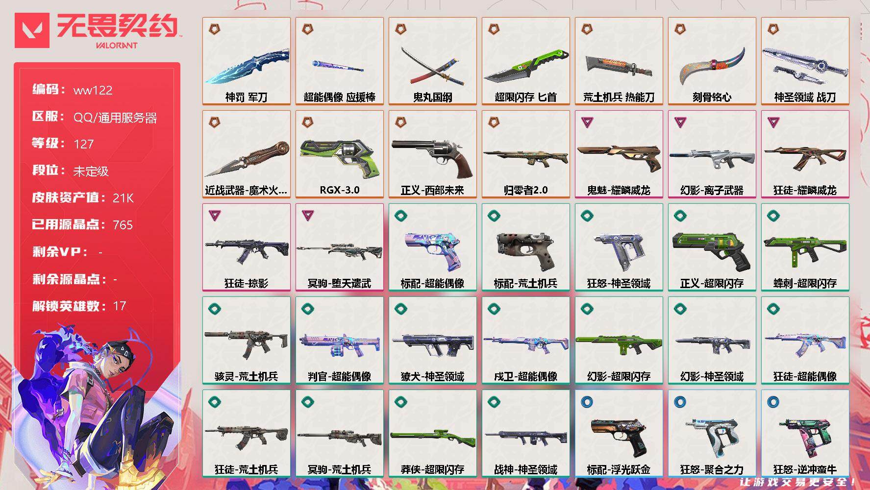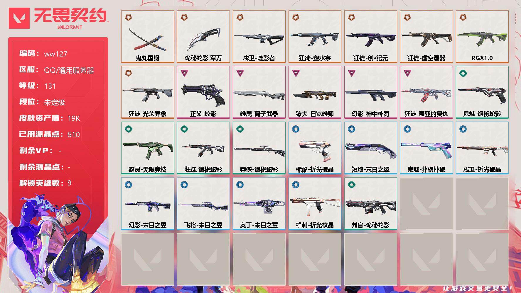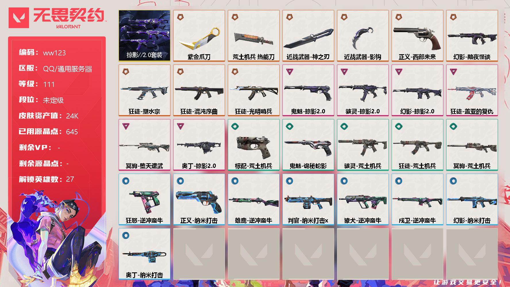 【云游堂】 【可二次实名】【ww127】【英雄】:幻棱,炼狱,暮蝶,壹决,捷风,不死鸟,贤者,猎枭,芮娜 【近战 武器】:近战武器-鬼丸国纲,近战武器-诡秘蛇影 军刀 【狂徒】:狂徒-塑水宗,狂徒-创·纪元,狂徒-虚空遗器,狂徒-RGX 11z Pro,狂徒-光荣异象,狂徒-盖亚的复仇,狂徒-诡秘蛇影 【幻影】:幻影-神中神罚,幻影-末日之翼 【戍卫】:戍卫-噬影者,戍卫-折光棱晶 【獠犬】:獠犬-日冕雄师 【飞将】:飞将-末日之翼 【莽侠】:莽侠-诡秘蛇影 【奥丁】:奥丁-末日之翼 【判官】:判官-诡秘蛇影 【雄鹿】:雄鹿-离子武器 【骇灵】:骇灵-无限竞技 【蜂刺】:蜂刺-折光棱晶 【标配】:标配-折光棱晶 【正义】:正义-掠影 【鬼魅】:鬼魅-诡秘蛇影,鬼魅-扑棱扑棱 【短炮】:短炮-末日之翼 【卡面】:无畏契约:暮蝶 卡面,战术桌游 卡面,修车达人 卡面,超限闪存 卡面,树懒大作战 卡面,红鳞松叶 卡面,Clutch 卡面,无畏契约GO!第一卷:芮娜 卡面,深海水族 卡面,无畏契约GO!第一卷:零 卡面,比比看谁快? 卡面,无垠星环 卡面,《双城之战》金克丝 卡面,别冒尖 卡面,代号红色 卡面,新兵报到 卡面,V契约 卡面,无畏契约 卡面 【喷漆】:伤心心 喷漆,不予置评 喷漆,买装还是存钱 喷漆,无畏契约GO!第一卷:捷风 喷漆,放下武器 喷漆,胜利属于无畏契约 喷漆,GLHF 喷漆,无畏契约 喷漆 【挂饰】:无畏契约GO!第一卷 零 挂饰,糖葫芦 挂饰,超能偶像 挂饰,Z世代特饮 挂饰,动力机箱 挂饰,天外飞客 挂饰,《双城之战》魄罗 挂饰,无畏契约 纪念币 挂饰