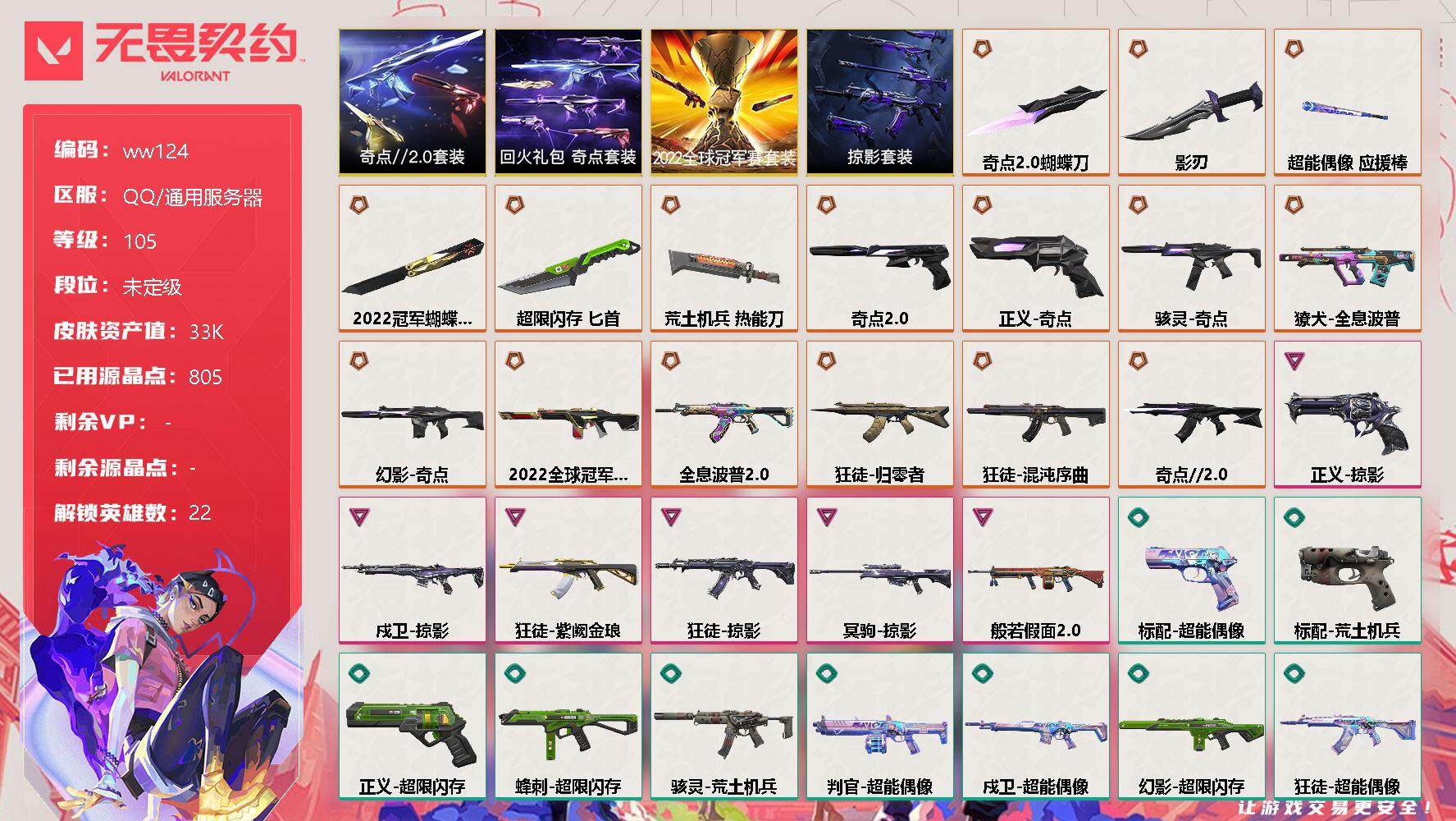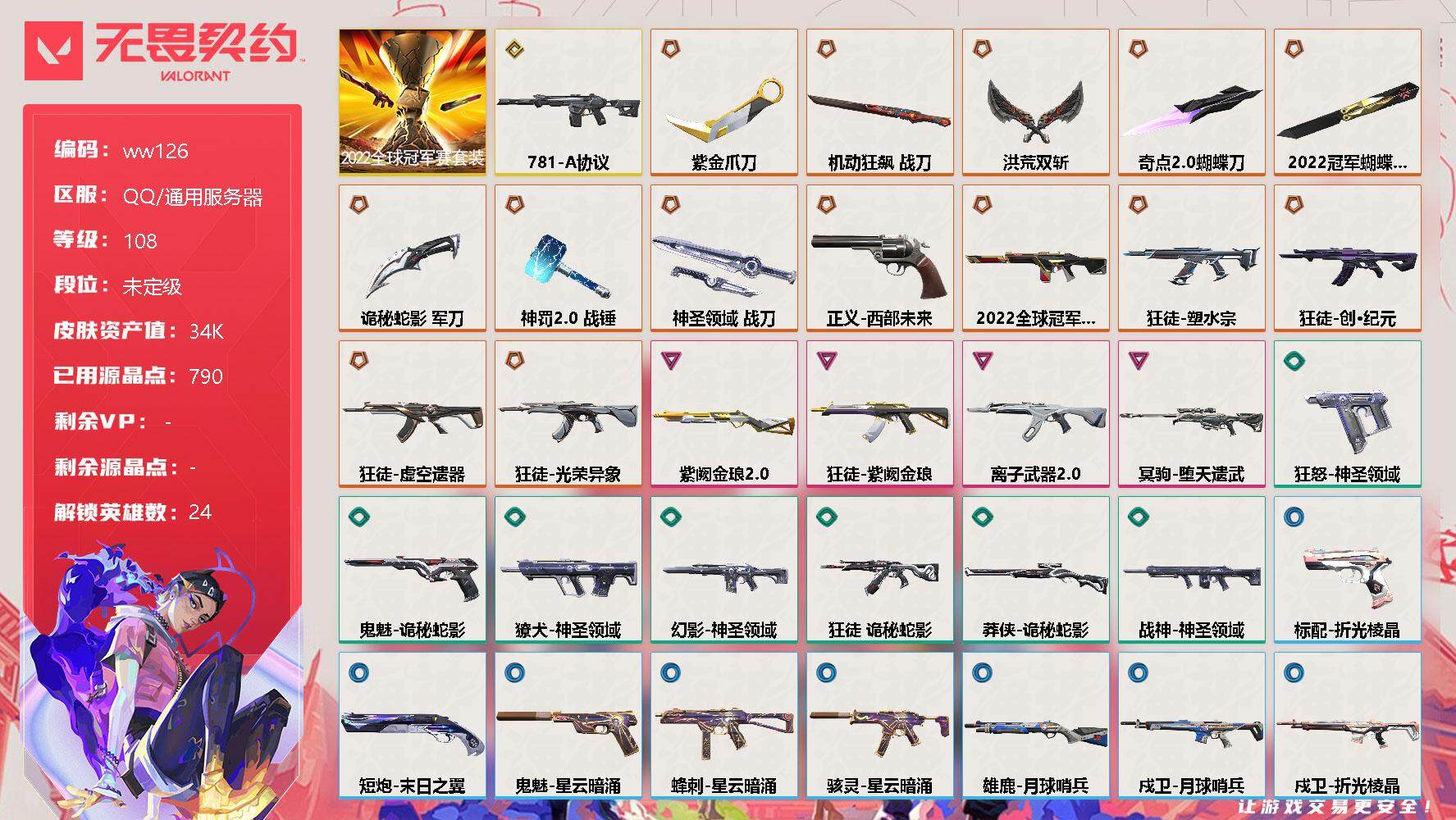 【云游堂】 【可二次实名】【ww126】【套装】:2022全球冠军赛套装 【英雄】:幻棱,炼狱,维斯,暮蝶,壹决,铁臂,捷风,雷兹,幽影,不死鸟,贤者,猎枭,蝰蛇,零,芮娜,奇乐,尚勃勒,霓虹,夜露,星礈,K/O,盖可,黑梦,钢锁 【近战 武器】:近战武器-2022全球冠军赛 蝴蝶刀,近战武器-奇点//2.0 蝴蝶刀,近战武器-紫金爪刀,近战武器-洪荒双斩,近战武器-机动狂飙 战刀,近战武器-诡秘蛇影 军刀,近战武器-神罚//2.0 战锤,近战武器-神圣领域 战刀 【狂徒】:狂徒-塑水宗,狂徒-创·纪元,狂徒-虚空遗器,狂徒-光荣异象,狂徒-紫阙金琅,狂徒-离子武器//2.0,狂徒-诡秘蛇影 【幻影】:幻影-781-A协议,幻影-2022全球冠军赛,幻影-神圣领域,幻影-末日之翼 【戍卫】:戍卫-月球哨兵,戍卫-折光棱晶 【獠犬】:獠犬-神圣领域 【冥驹】:冥驹-堕天遗武,冥驹-星云暗涌 【飞将】:飞将-末日之翼 【莽侠】:莽侠-诡秘蛇影,莽侠-月球哨兵 【战神】:战神-神圣领域 【奥丁】:奥丁-末日之翼 【判官】:判官-诡秘蛇影 【雄鹿】:雄鹿-紫阙金琅//2.0,雄鹿-月球哨兵 【骇灵】:骇灵-星云暗涌 【蜂刺】:蜂刺-星云暗涌,蜂刺-折光棱晶 【标配】:标配-折光棱晶 【正义】:正义-西部未来,正义-月球哨兵 【鬼魅】:鬼魅-诡秘蛇影,鬼魅-星云暗涌 【狂怒】:狂怒-神圣领域 【短炮】:短炮-末日之翼 【卡面】:树懒大作战 卡面,Clutch 卡面,哨卫者之领域 卡面,无畏契约GO!第一卷:芮娜 卡面,无畏契约GO!第一卷:零 卡面,无垠星环 卡面,《双城之战》金克丝 卡面,别冒尖 卡面,代号红色 卡面,新兵报到 卡面,V契约 卡面,无畏契约 卡面 【喷漆】:买装还是存钱 喷漆,无畏契约GO!第一卷:零 喷漆,放下武器 喷漆,胜利属于无畏契约 喷漆,GLHF 喷漆,无畏契约 喷漆 【挂饰】:动力机箱 挂饰,战术抓娃娃:阿丹 挂饰 ,天外飞客 挂饰,《双城之战》魄罗 挂饰,无畏契约 纪念币 挂饰