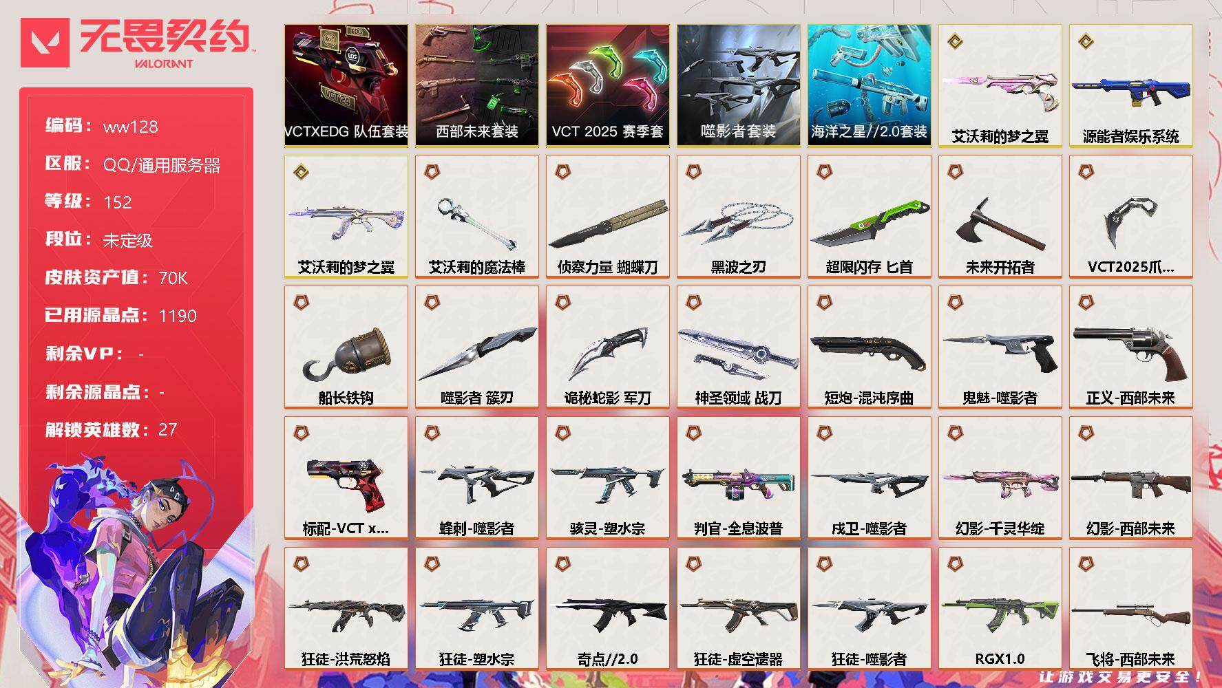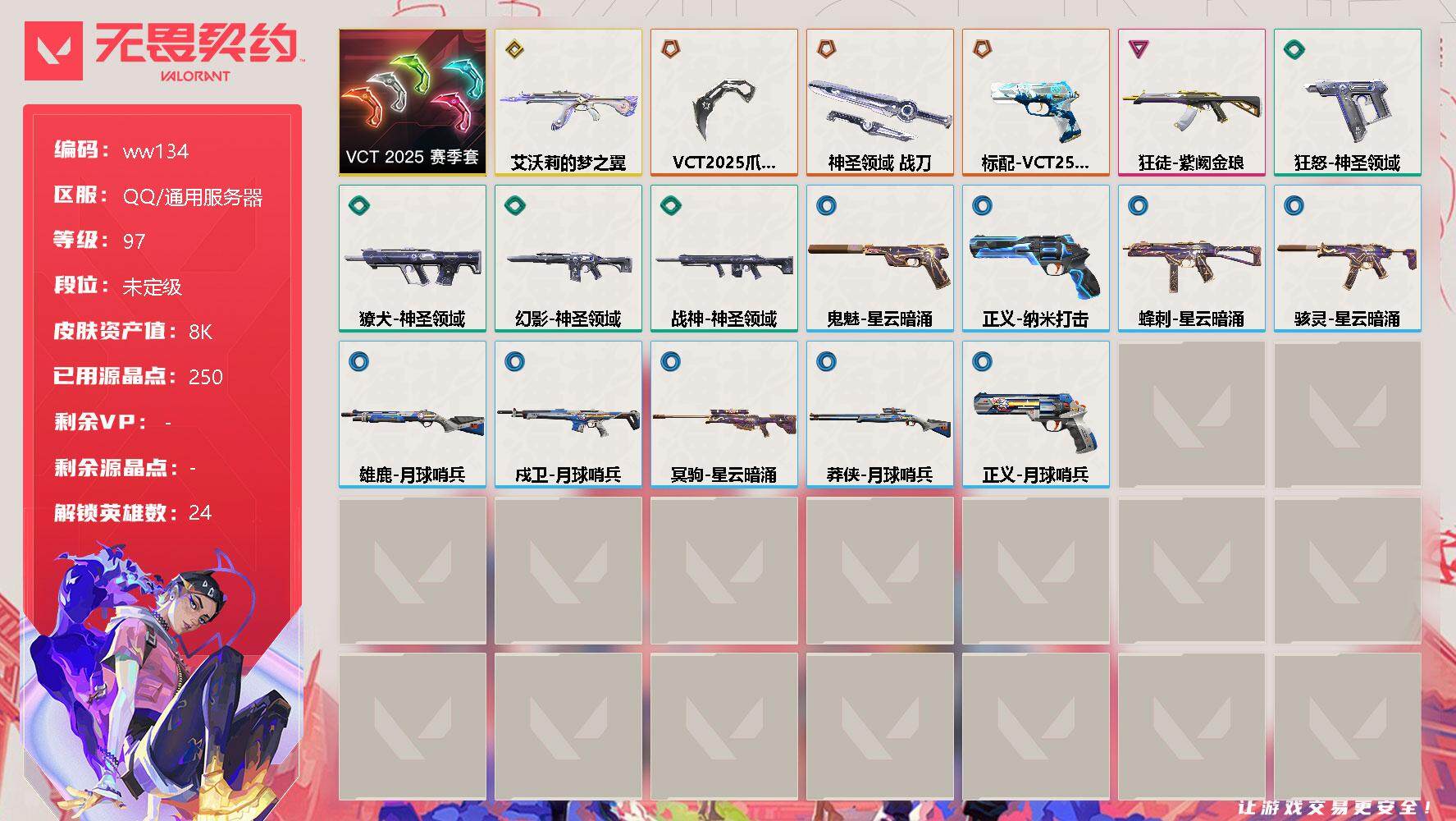 【云游堂】 【可二次实名】【ww134】【套装】:VCT 2025 赛季套装 【英雄】:炼狱,维斯,暮蝶,钛狐,壹决,铁臂,捷风,雷兹,不死鸟,贤者,猎枭,蝰蛇,零,芮娜,奇乐,尚勃勒,霓虹,斯凯,夜露,K/O,海神,盖可,黑梦,钢锁 【近战 武器】:近战武器-VCT 2025 爪刀,近战武器-神圣领域 战刀 【狂徒】:狂徒-艾沃莉的梦之翼,狂徒-紫阙金琅 【幻影】:幻影-神圣领域 【戍卫】:戍卫-月球哨兵 【獠犬】:獠犬-神圣领域 【冥驹】:冥驹-星云暗涌 【莽侠】:莽侠-月球哨兵 【战神】:战神-神圣领域 【雄鹿】:雄鹿-月球哨兵 【骇灵】:骇灵-星云暗涌 【蜂刺】:蜂刺-星云暗涌 【VCT手枪】:标配-VCT25 x LEV 【正义】:正义-纳米打击,正义-月球哨兵 【鬼魅】:鬼魅-星云暗涌 【狂怒】:狂怒-神圣领域 【卡面】:进入射程 卡面,《双城之战》拥抱 卡面,精灵大战 卡面,欢迎来到底城 卡面,南瓜盛典 卡面,正义的化身 卡面,最高舞台 卡面,梦幻奶茶 卡面,纤云弄巧 卡面,无畏契约GO!第一卷:芮娜 卡面,无畏契约GO!第一卷:零 卡面,代号红色 卡面,新兵报到 卡面,V契约 卡面,无畏契约 卡面 【喷漆】:嗨宝南瓜灯 喷漆,都算到了 喷漆,控场勿近 喷漆,超级粉丝 喷漆,捷风差距 喷漆,买装还是存钱 喷漆,胜利属于无畏契约 喷漆,GLHF 喷漆,无畏契约 喷漆 【挂饰】:终章:猫猫木乃伊 挂饰,悠闲鸡块 挂饰,伞绳 挂饰,第九季//第三幕 纪念币 挂饰,无畏契约GO!第一卷 芮娜 挂饰,无畏契约GO!第一卷 零 挂饰,第九季//第二幕 纪念币 挂饰,袖珍捷风 挂饰,第九季//第一幕 纪念币 挂饰,天外飞客 挂饰,无畏契约 纪念币 挂饰