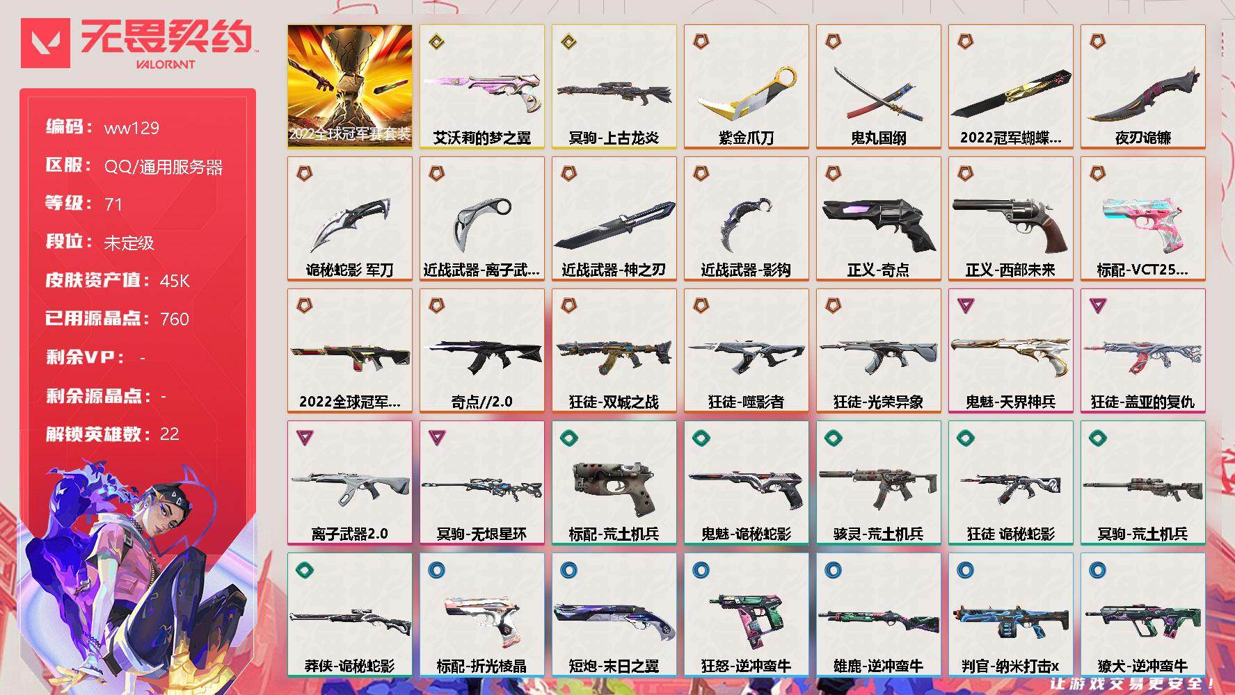 【云游堂】 【可二次实名】【ww129】【套装】:2022全球冠军赛套装 【英雄】:炼狱,维斯,暮蝶,壹决,铁臂,捷风,雷兹,幽影,不死鸟,贤者,猎枭,蝰蛇,零,芮娜,奇乐,尚勃勒,斯凯,夜露,K/O,盖可,黑梦,钢锁 【近战 武器】:近战武器-2022全球冠军赛 蝴蝶刀,近战武器-影钩,近战武器-神之刃,近战武器-紫金爪刀,近战武器-鬼丸国纲,近战武器-离子武器//2.0 爪刀,近战武器-夜刃诡镰,近战武器-诡秘蛇影 军刀 【狂徒】:狂徒-奇点//2.0,狂徒-双城之战,狂徒-噬影者,狂徒-光荣异象,狂徒-盖亚的复仇,狂徒-离子武器//2.0,狂徒-诡秘蛇影 【幻影】:幻影-2022全球冠军赛,幻影-末日之翼 【戍卫】:戍卫-折光棱晶 【獠犬】:獠犬-逆冲蛮牛 【冥驹】:冥驹-上古龙炎,冥驹-无垠星环,冥驹-荒土机兵 【飞将】:飞将-末日之翼 【莽侠】:莽侠-诡秘蛇影 【奥丁】:奥丁-纳米打击,奥丁-末日之翼 【判官】:判官-诡秘蛇影,判官-纳米打击x 【雄鹿】:雄鹿-逆冲蛮牛 【骇灵】:骇灵-荒土机兵 【蜂刺】:蜂刺-折光棱晶 【标配】:标配-荒土机兵,标配-折光棱晶 【VCT手枪】:标配-VCT25 x BLG 【正义】:正义-奇点,正义-西部未来 【鬼魅】:鬼魅-艾沃莉的梦之翼,鬼魅-天界神兵,鬼魅-诡秘蛇影 【狂怒】:狂怒-逆冲蛮牛 【短炮】:短炮-末日之翼 【卡面】:纳米打击 卡面,抑制技术 卡面,激斗汉堡 卡面,瓦娃脸雪糕 P2 卡面,荒土机兵 卡面,银弹猎手 卡面,《双城之战》拥抱 卡面,精灵大战 卡面,欢迎来到底城 卡面,南瓜盛典 卡面,树懒大作战 卡面,无畏契约GO!第一卷:芮娜 卡面,无畏契约GO!第一卷:零 卡面,无垠星环 卡面,《双城之战》金克丝 卡面,代号红色 卡面,新兵报到 卡面,V契约 卡面,无畏契约 卡面 【喷漆】:请求重启 喷漆,逆冲蛮牛 喷漆,纳米打击 喷漆,简笔画黯兽 喷漆,独守蝰腹 喷漆,他们将落荒而逃 喷漆,通缉:战术企鹅 喷漆,荒土机兵 喷漆,别挡我吃球! 喷漆,嘭! 喷漆,都算到了 喷漆,控场勿近 喷漆,买装还是存钱 喷漆,暴走萝莉 喷漆,松叶 喷漆,放下武器 喷漆,胜利属于无畏契约 喷漆,GLHF 喷漆,无畏契约 喷漆 【挂饰】:猫猫木乃伊 挂饰,水壶 挂饰,纳米打击 挂饰,逆冲蛮牛 挂饰,伞绳 挂饰,《双城之战》小蛋糕 挂饰,第九季//第三幕 纪念币 挂饰,动力机箱 挂饰,天外飞客 挂饰,红鳞松叶 挂饰,海豹的认可 挂饰,无畏契约 纪念币 挂饰