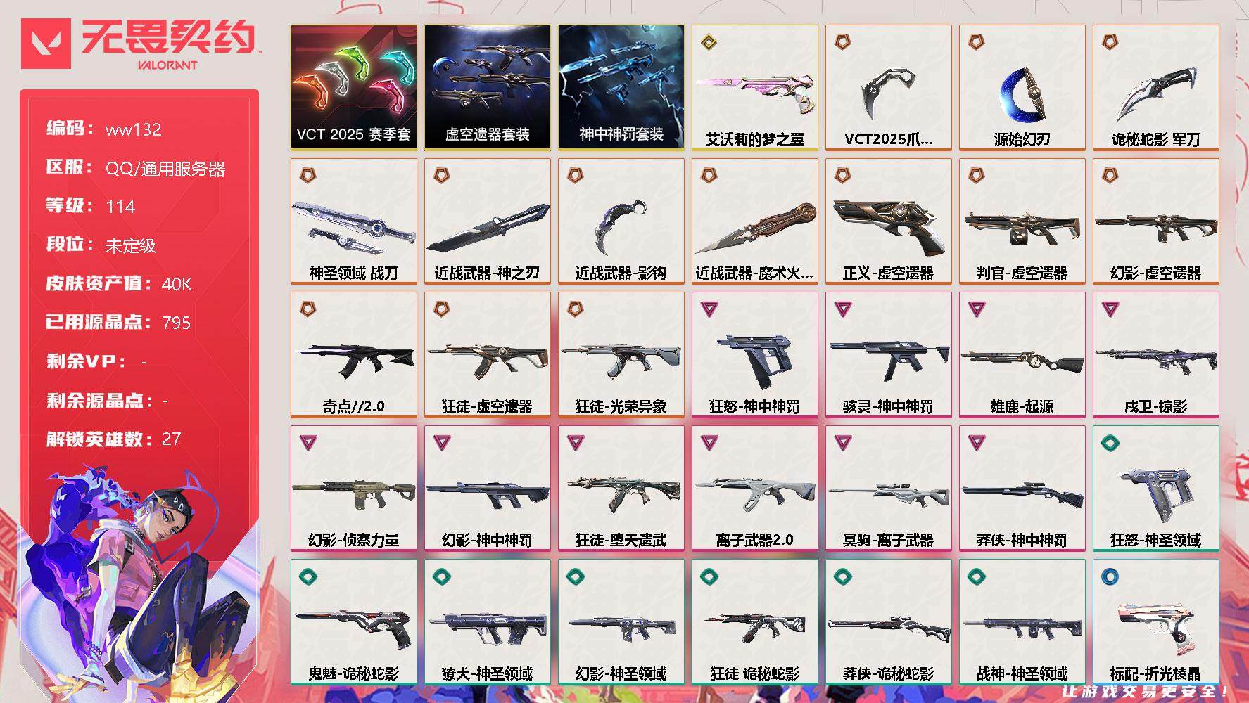 【云游堂】 【可二次实名】【ww132】【套装】:虚空遗器套装,VCT 2025 赛季套装,神中神罚套装 【英雄】:幻棱,炼狱,维斯,暮蝶,钛狐,壹决,铁臂,捷风,雷兹,幽影,不死鸟,贤者,猎枭,蝰蛇,零,芮娜,奇乐,尚勃勒,霓虹,斯凯,夜露,星礈,K/O,海神,盖可,黑梦,钢锁 【近战 武器】:近战武器-魔术火花,近战武器-影钩,近战武器-神之刃,近战武器-VCT 2025 爪刀,近战武器-源始幻刃,近战武器-诡秘蛇影 军刀,近战武器-神圣领域 战刀,近战武器-魔术火花 【狂徒】:狂徒-奇点//2.0,狂徒-虚空遗器,狂徒-光荣异象,狂徒-堕天遗武,狂徒-离子武器//2.0,狂徒-诡秘蛇影 【幻影】:幻影-虚空遗器,幻影-侦察力量,幻影-神中神罚,幻影-神圣领域,幻影-末日之翼 【戍卫】:戍卫-掠影,戍卫-月球哨兵,戍卫-折光棱晶 【獠犬】:獠犬-神圣领域 【冥驹】:冥驹-离子武器,冥驹-星云暗涌 【飞将】:飞将-末日之翼 【莽侠】:莽侠-神中神罚,莽侠-诡秘蛇影,莽侠-月球哨兵 【战神】:战神-神圣领域 【奥丁】:奥丁-末日之翼 【判官】:判官-虚空遗器,判官-诡秘蛇影 【雄鹿】:雄鹿-起源,雄鹿-月球哨兵 【骇灵】:骇灵-神中神罚,骇灵-星云暗涌 【蜂刺】:蜂刺-星云暗涌,蜂刺-折光棱晶 【标配】:标配-折光棱晶 【正义】:正义-虚空遗器,正义-月球哨兵 【鬼魅】:鬼魅-艾沃莉的梦之翼,鬼魅-诡秘蛇影,鬼魅-星云暗涌 【狂怒】:狂怒-神中神罚,狂怒-神圣领域 【短炮】:短炮-末日之翼 【卡面】:树懒大作战 卡面,红鳞松叶 卡面,无畏契约GO!第一卷:芮娜 卡面,无畏契约GO!第一卷:零 卡面,无垠星环 卡面,《双城之战》金克丝 卡面,无畏契约GO!第一卷:贤者 卡面,代号红色 卡面,新兵报到 卡面,V契约 卡面,无畏契约 卡面 【喷漆】:买装还是存钱 喷漆,无畏契约GO!第一卷:贤者 喷漆,放下武器 喷漆,胜利属于无畏契约 喷漆,GLHF 喷漆,无畏契约 喷漆 【挂饰】:无畏契约GO!第一卷 芮娜 挂饰,动力机箱 挂饰,天外飞客 挂饰,无畏契约 纪念币 挂饰