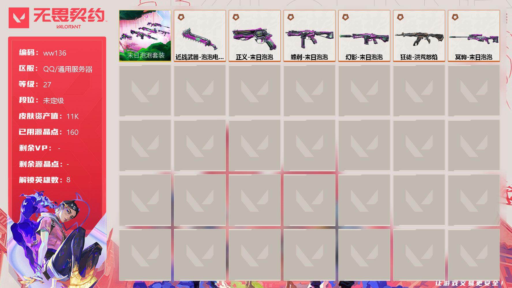 【云游堂】 【可二次实名】【ww136】【套装】:末日泡泡套装 【英雄】:炼狱,捷风,不死鸟,贤者,猎枭,芮娜,尚勃勒,盖可 【近战 武器】:近战武器-泡泡电锯 【狂徒】:狂徒-洪荒怒焰 【幻影】:幻影-末日泡泡 【冥驹】:冥驹-末日泡泡 【蜂刺】:蜂刺-末日泡泡 【正义】:正义-末日泡泡 【卡面】:南瓜盛典 卡面,树懒大作战 卡面,Clutch 卡面,无畏契约GO!第一卷:芮娜 卡面,无畏契约GO!第一卷:零 卡面,无垠星环 卡面,《双城之战》金克丝 卡面,代号红色 卡面,新兵报到 卡面,V契约 卡面,无畏契约 卡面 【喷漆】:记在小本本 喷漆,买装还是存钱 喷漆,关门放狗 喷漆,无畏契约GO!第一卷:零 喷漆,放下武器 喷漆,胜利属于无畏契约 喷漆,GLHF 喷漆,无畏契约 喷漆 【挂饰】:薰衣草之心 挂饰,Z世代特饮 挂饰,动力机箱 挂饰,天外飞客 挂饰,无畏契约 纪念币 挂饰