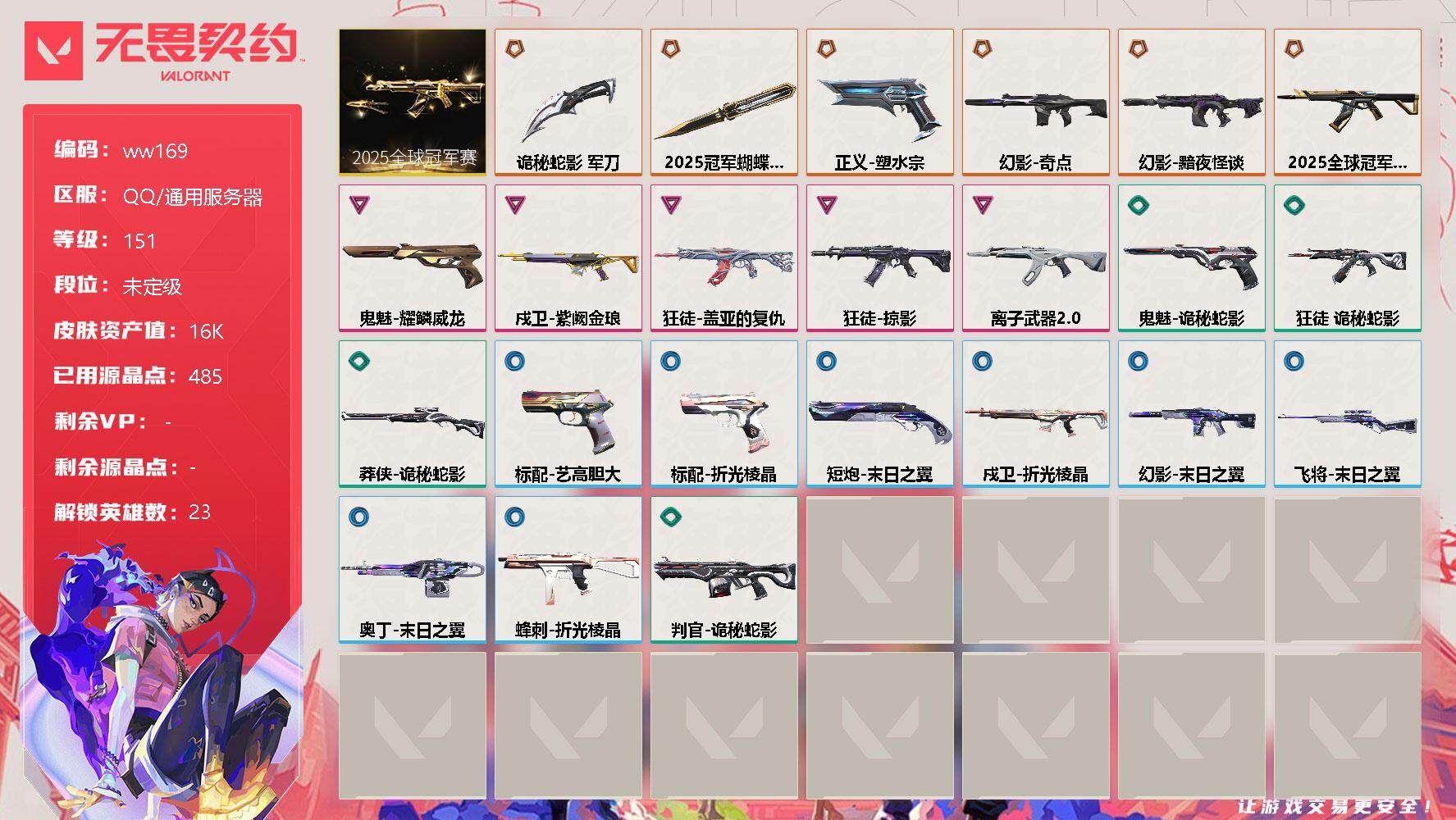 【云游堂】 【可二次实名】【ww169】【套装】:2025全球冠军赛套装 【英雄】:幻棱,炼狱,维斯,暮蝶,钛狐,壹决,铁臂,捷风,雷兹,幽影,不死鸟,贤者,猎枭,蝰蛇,零,芮娜,奇乐,尚勃勒,霓虹,斯凯,K/O,盖可,黑梦 【近战 武器】:近战武器-2025全球冠军赛 蝴蝶刀,近战武器-诡秘蛇影 军刀 【狂徒】:狂徒-2025全球冠军赛,狂徒-掠影,狂徒-盖亚的复仇,狂徒-离子武器//2.0,狂徒-诡秘蛇影 【幻影】:幻影-黯夜怪谈,幻影-奇点,幻影-末日之翼 【戍卫】:戍卫-紫阙金琅,戍卫-折光棱晶 【飞将】:飞将-末日之翼 【莽侠】:莽侠-诡秘蛇影 【奥丁】:奥丁-末日之翼 【判官】:判官-诡秘蛇影 【蜂刺】:蜂刺-折光棱晶 【标配】:标配-艺高胆大,标配-折光棱晶 【正义】:正义-塑水宗 【鬼魅】:鬼魅-耀鳞威龙,鬼魅-诡秘蛇影 【短炮】:短炮-末日之翼 【卡面】:风险合作 卡面,无畏契约:尚勃勒 卡面,代号红色 卡面,新兵报到 卡面,V契约 卡面,无畏契约 卡面 【喷漆】:尚勃勒 喷漆,分身有术 喷漆,致命优雅 喷漆,胜利属于无畏契约 喷漆,GLHF 喷漆,无畏契约 喷漆 【挂饰】:有事联系 挂饰,无畏契约 纪念币 挂饰