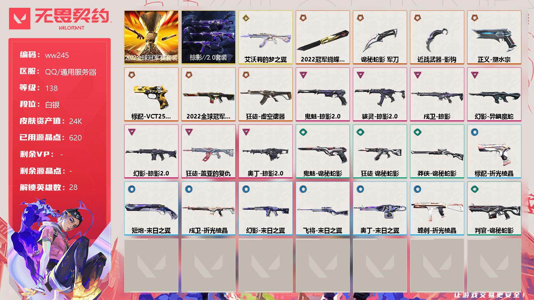 【云游堂】 【可二次实名】【ww245】【套装】:2022全球冠军赛套装,掠影//2.0套装 【英雄】:幻棱,炼狱,维斯,暮蝶,钛狐,壹决,铁臂,捷风,雷兹,幽影,不死鸟,贤者,猎枭,蝰蛇,零,芮娜,奇乐,尚勃勒,霓虹,斯凯,夜露,星礈,K/O,海神,盖可,黑梦,钢锁 【近战 武器】:近战武器-2022全球冠军赛 蝴蝶刀,近战武器-影钩,近战武器-诡秘蛇影 军刀 【狂徒】:狂徒-艾沃莉的梦之翼,狂徒-虚空遗器,狂徒-盖亚的复仇,狂徒-诡秘蛇影 【幻影】:幻影-2022全球冠军赛,幻影-异鳞魔蛇,幻影-掠影//2.0,幻影-末日之翼 【戍卫】:戍卫-掠影,戍卫-折光棱晶 【飞将】:飞将-末日之翼 【莽侠】:莽侠-诡秘蛇影 【奥丁】:奥丁-掠影//2.0,奥丁-末日之翼 【判官】:判官-诡秘蛇影 【骇灵】:骇灵-掠影//2.0 【蜂刺】:蜂刺-折光棱晶 【标配】:标配-折光棱晶 【VCT手枪】:标配-VCT25 x WOL 【正义】:正义-塑水宗 【鬼魅】:鬼魅-掠影//2.0,鬼魅-诡秘蛇影 【短炮】:短炮-末日之翼 【卡面】:南瓜盛典 卡面,树懒大作战 卡面,梦幻奶茶 卡面,无畏契约GO!第一卷:芮娜 卡面,无畏契约GO!第一卷:零 卡面,《双城之战》金克丝 卡面,代号红色 卡面,新兵报到 卡面,V契约 卡面,无畏契约 卡面 【喷漆】:捷风差距 喷漆,买装还是存钱 喷漆,酷熊冲浪 喷漆,无畏契约GO!第一卷:芮娜 喷漆,胜利属于无畏契约 喷漆,GLHF 喷漆,无畏契约 喷漆 【挂饰】:鱼骨头 挂饰,动力机箱 挂饰,天外飞客 挂饰,海豹的认可 挂饰,无畏契约 纪念币 挂饰