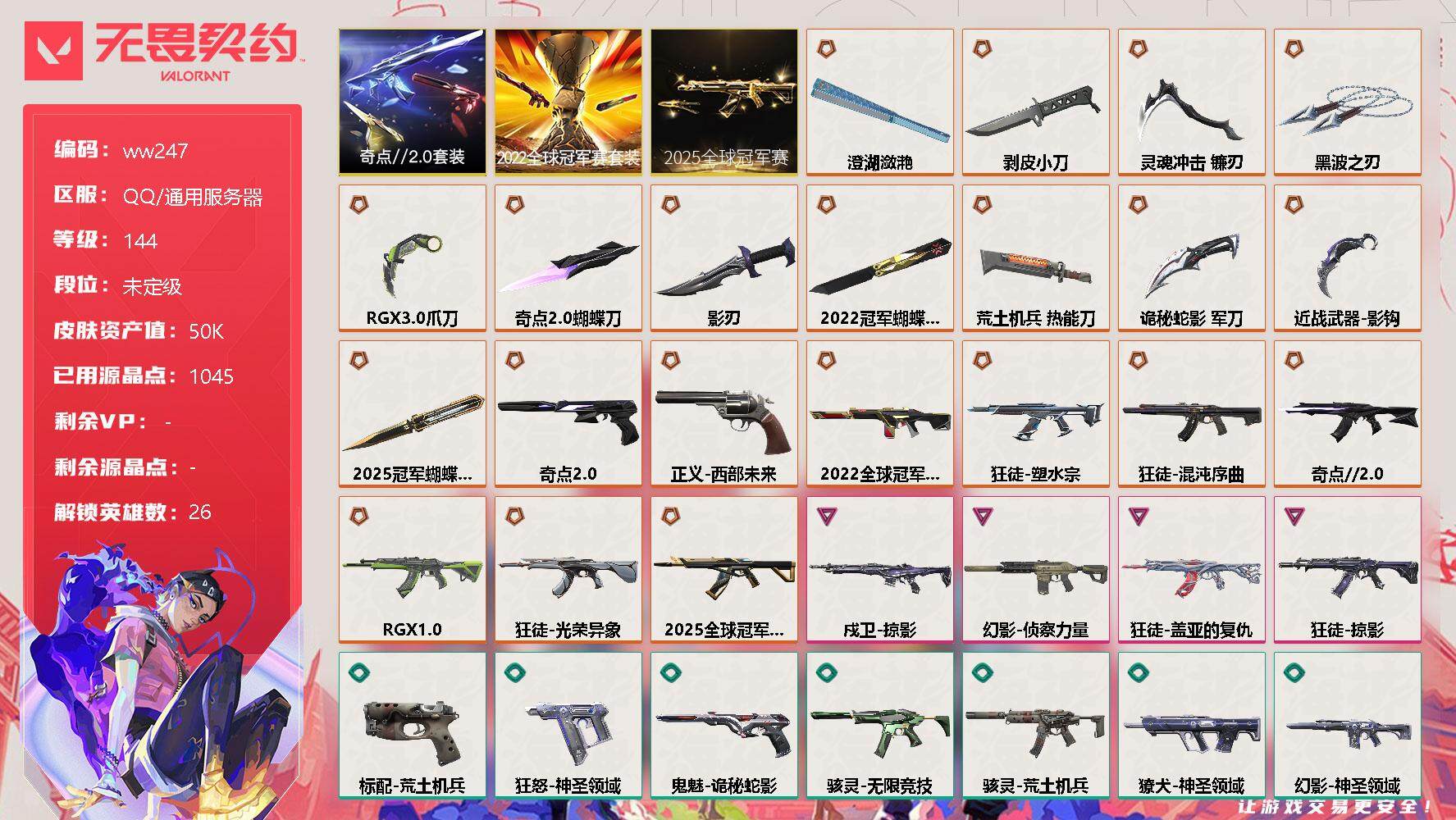 【云游堂】 【可二次实名】【ww249】【套装】:2025全球冠军赛套装 【英雄】:幻棱,炼狱,暮蝶,壹决,铁臂,捷风,幽影,不死鸟,贤者,猎枭,零,芮娜,尚勃勒,霓虹,斯凯,夜露,海神 【近战 武器】:近战武器-2025全球冠军赛 蝴蝶刀 【狂徒】:狂徒-2025全球冠军赛,狂徒-机动狂飙 【幻影】:幻影-千灵华绽 【正义】:正义-西部未来 【鬼魅】:鬼魅-耀鳞威龙 【卡面】:南瓜盛典 卡面,修车达人 卡面,正义的化身 卡面,无畏契约GO!第一卷:芮娜 卡面,清除名单 卡面,无畏契约GO!第一卷:零 卡面,完美调谐 卡面 ,代号红色 卡面,新兵报到 卡面,V契约 卡面,无畏契约 卡面 【喷漆】:熊抱 喷漆,买装还是存钱 喷漆,胜利属于无畏契约 喷漆,GLHF 喷漆,无畏契约 喷漆 【挂饰】:第九季//第三幕 纪念币 挂饰,无畏契约GO!第一卷 芮娜 挂饰,无畏契约GO!第一卷 零 挂饰,第九季//第二幕 纪念币 挂饰,天外飞客 挂饰,无畏契约 纪念币 挂饰