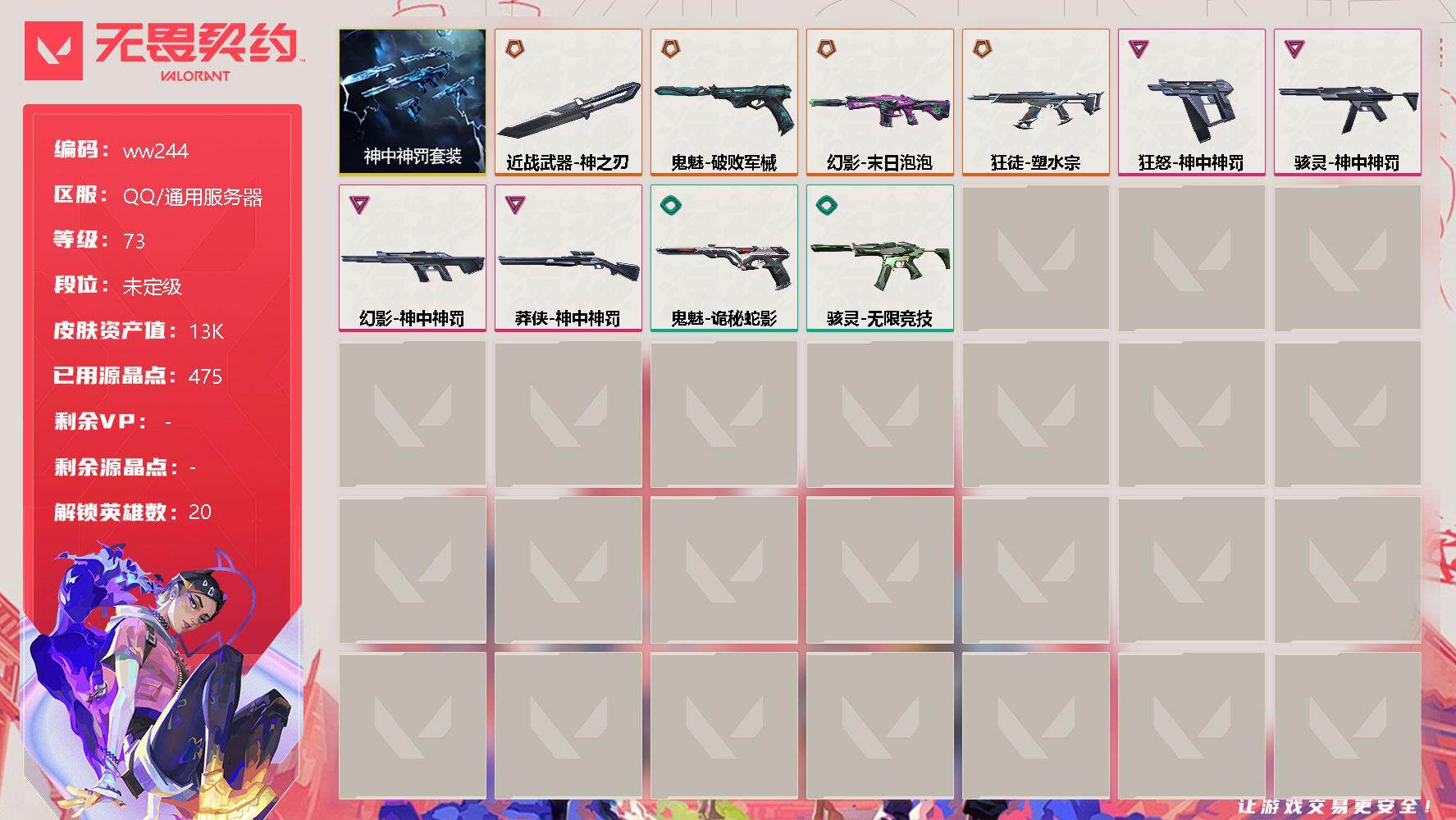 【云游堂】 【可二次实名】【ww244】【套装】:神中神罚套装 【英雄】:幻棱,炼狱,维斯,暮蝶,钛狐,壹决,铁臂,捷风,幽影,不死鸟,贤者,猎枭,零,芮娜,奇乐,尚勃勒,霓虹,夜露,盖可,钢锁 【近战 武器】:近战武器-神之刃 【狂徒】:狂徒-塑水宗 【幻影】:幻影-末日泡泡,幻影-神中神罚 【莽侠】:莽侠-神中神罚 【骇灵】:骇灵-神中神罚,骇灵-无限竞技 【鬼魅】:鬼魅-破败军械,鬼魅-诡秘蛇影 【狂怒】:狂怒-神中神罚 【卡面】:Clutch 卡面,无畏契约GO!第一卷:芮娜 卡面,无畏契约GO!第一卷:零 卡面,代号红色 卡面,新兵报到 卡面,V契约 卡面,无畏契约 卡面 【喷漆】:买装还是存钱 喷漆,关门放狗 喷漆,胜利属于无畏契约 喷漆,GLHF 喷漆,无畏契约 喷漆 【挂饰】:无畏契约GO!第一卷 零 挂饰,天外飞客 挂饰,无畏契约 纪念币 挂饰