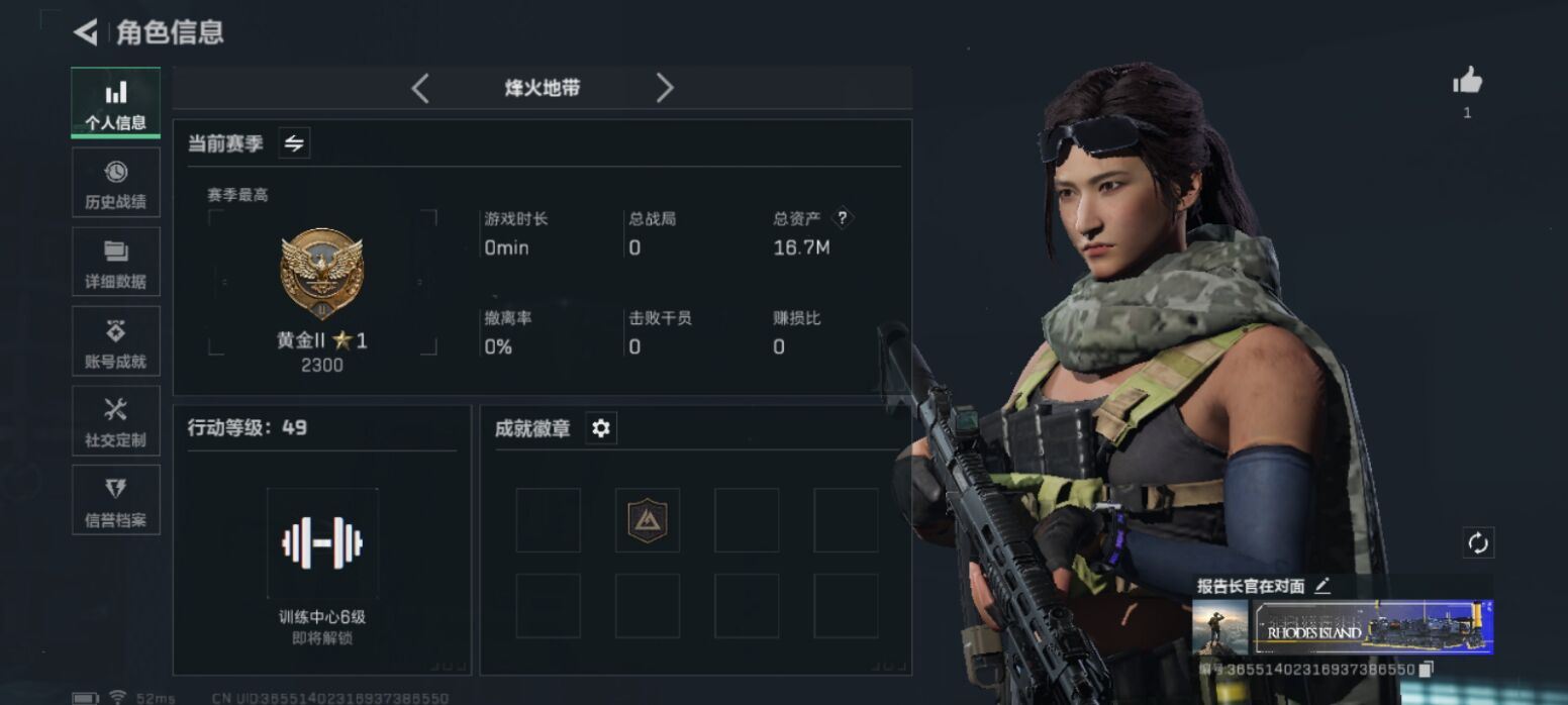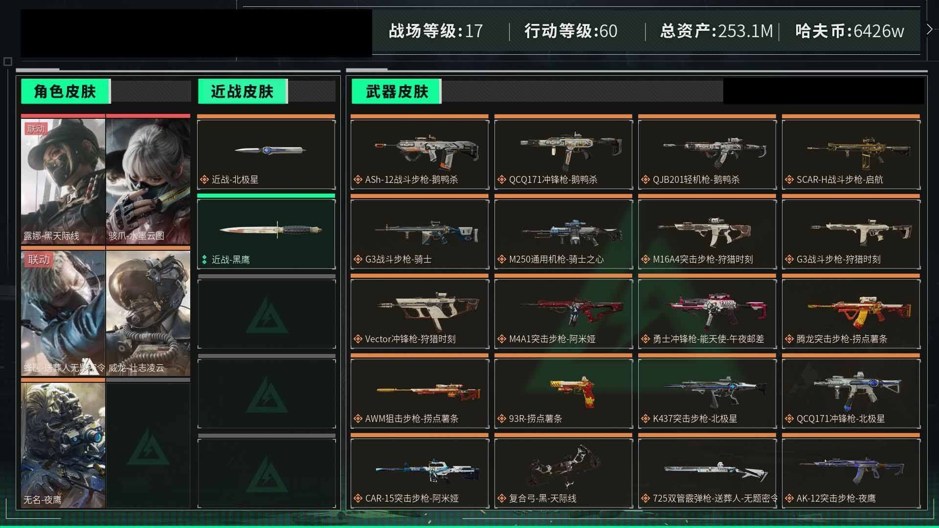 【云游堂】 R42240 可二次QQ【行动等级49】【总资产16.7m】【战场等级1】【刀:黑鹰】【露娜黑天际线】【m4突击步枪阿米娅+car突击步枪阿米娅+腾龙突击步枪捞点薯条+勇士冲锋枪能天使午夜邮差+awm狙击步枪捞点薯条+93R捞点薯条+复合弓黑天际线】详情请看图片【卖号买号首选亿梦】
