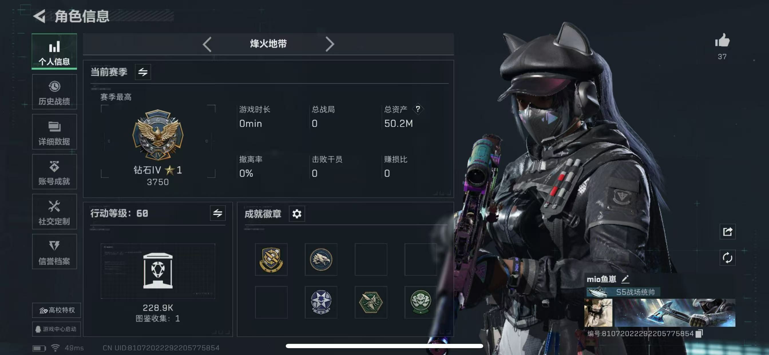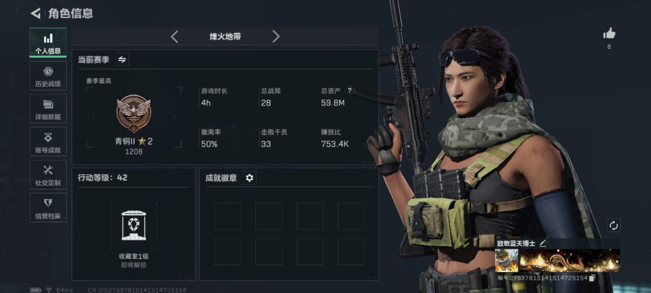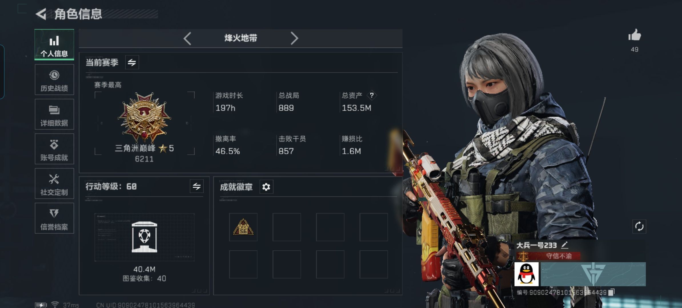 【云游堂】 汤39053总资产873M,哈夫币50024w,枪皮数量154,战场等级:34 军士长,行动等级:60 黑鹰,角色皮肤数量1,蜂医-送葬人无题密令,近战-黑鹰,安全箱等时效性道具请以游戏内数据为准;详情请看图【个人信息】战场等级:34 军士长,行动等级:60 _黑鹰【哈夫币】50024w【总资产】873M【货币】479三角币/0曼德尔币/1249三角券【安全箱】基础安全箱2(1x2)/S6高级安全箱6(2x3)/S6顶级安全箱9(3x3)【通行证】烽火地带限定版【特勤处】制药台Lv.3/工作台Lv.3/仓库Lv.9/防具台Lv.3/训练中心Lv.7/靶场Lv.7/技术中心Lv.3/指挥中心Lv.6/潜水中心Lv.1/收藏室Lv.1【角色皮肤】蜂医-送葬人无题密令/【已拥有捆绑包】狩猎时刻捆绑包/特斯拉线圈捆绑包/【近战皮肤】近战-黑鹰/【步枪皮肤】AUG突击步枪-蝮蛇/AKM突击步枪-林中猎手/腾龙突击步枪-无垢/M16A4突击步枪-竞赛选手/SR-3M紧凑突击步枪-荒野求生/CAR-15突击步枪-阿米娅/M4A1突击步枪-阿米娅/G3战斗步枪-狩猎时刻/M16A4突击步枪-狩猎时刻/AK-12突击步枪-特斯拉线圈/SR-3M紧凑突击步枪-特斯拉线圈/腾龙突击步枪-猎鳄行动/ASh-12战斗步枪-无极限/ASh-12战斗步枪-鹅鸭杀/K437突击步枪-几何解构/SCAR-H战斗步枪-启航/SR-3M紧凑突击步枪-战术竞备/【冲锋枪皮肤】Vector冲锋枪-狩猎时刻/UZI冲锋枪-特斯拉线圈/Vector冲锋枪-阿萨拉文明/MP5冲锋枪-深海恐惧/勇士冲锋枪-深海恐惧/MP7冲锋枪-无垢/勇士冲锋枪-能天使-午夜邮差/P90冲锋枪-紧急戒备/MP7冲锋枪-守护者/勇士冲锋枪-工业狂潮/QCQ171冲锋枪-鹅鸭杀/MP5冲锋枪-战术竞备/【霰弹枪皮肤】M1014霰弹枪-林中猎手/725双管霰弹枪-送葬人-无题密令/【轻机枪皮肤】PKM通用机枪-荒野求生/M250通用机枪-囚徒/QJB201轻机枪-OldHabits/M250通用机枪-骑士之心/QJB201轻机枪-鹅鸭杀/M250通用机枪-几何解构/【精准射手步枪皮肤】PSG-1射手步枪-无垢/SR-9射手步枪-几何解构/【狙击步枪皮肤】SV-98狙击步枪-囚徒/SVD狙击步枪-暗夜猎手/SV-98狙击步枪-林中猎手/SVD狙击步枪-荒野求生/【特殊武器】复合弓-黑-天际线/复合弓-守护者/【挂饰】挂饰-枪匠/牛角威龙/诡影狙击兵/诡影喷火兵/挂饰-骑士之心/挂饰-大白鹅/挂饰-启程/低音艺术家/挂饰-彩蛋/阿萨拉机枪兵/挂饰-晶石幻想/挂饰-阿米娅/挂饰-几何解构/挂饰-特斯拉线圈/挂饰-狩猎时刻/阿萨拉徽章/紧急会议/【载具】M1A4坦克-烈焰/(典藏皮肤颜色请以典藏展示为准,安全箱等时效性道具请以游戏内数据为准)