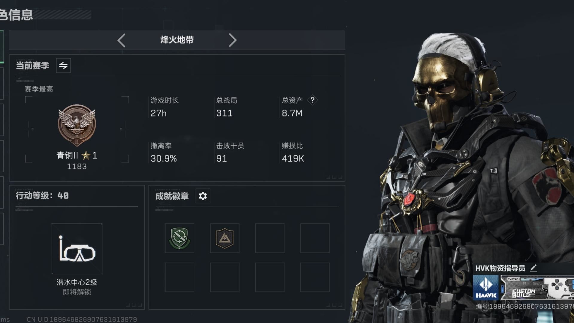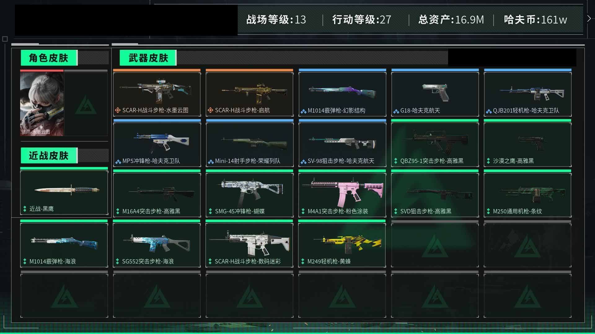 【云游堂】 惠3425897总资产16M,哈夫币161w,枪皮数量24,战场等级:13 列兵,行动等级:27 黄金,角色皮肤数量1,骇爪-水墨云图,近战-黑鹰,安全箱等【个人信息】战场等级:13 列兵,行动等级:27 黄金【哈夫币】161w【总资产】16M【货币】0三角币/0曼德尔币/80三角券【安全箱】基础安全箱2(1x2)【通行证】通行证免费版【特勤处】制药台Lv.2/工作台Lv.1/仓库Lv.5/防具台Lv.2/训练中心Lv.2/靶场Lv.2/技术中心Lv.2/指挥中心Lv.3/潜水中心Lv.0/收藏室Lv.0【角色皮肤】骇爪-水墨云图/【近战皮肤】近战-黑鹰/【步枪皮肤】SCAR-H战斗步枪-水墨云图/SCAR-H战斗步枪-启航/【冲锋枪皮肤】MP5冲锋枪-战术竞备/【挂饰】诡影狙击兵/诡影喷火兵/挂饰-维什戴尔/挂饰-启程/挂饰-水墨云图/阿萨拉霰弹兵/阿萨拉狙击兵/阿萨拉徽章/紧急会议/(典藏皮肤颜色请以典藏展示为准,安全箱等时效性道具请以游戏内数据为准)