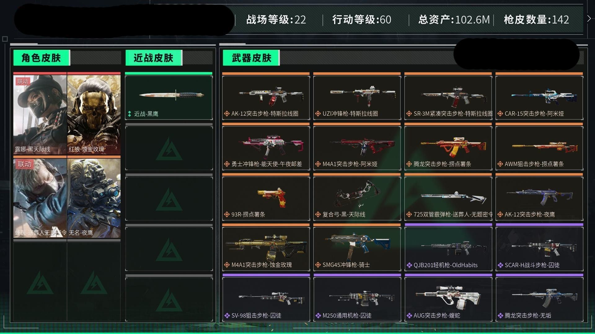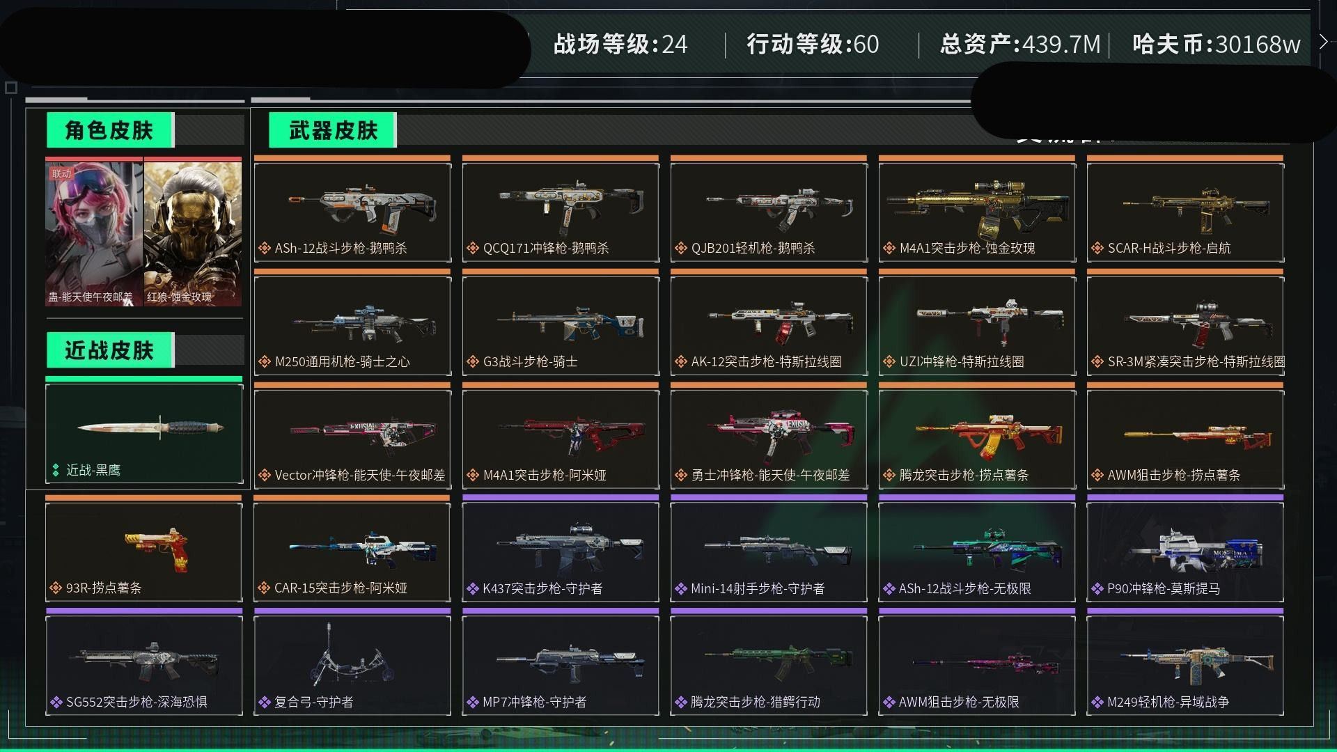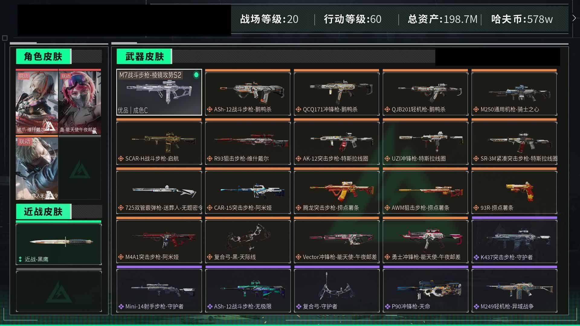【云游堂】 R43914 可二次QQ【行动等级42】【总资产59.8m】【战场等级19】【刀:黑鹰】【蛊能天使午夜邮差】【m4突击步枪阿米娅+scar战斗步枪启航+g3战斗步枪骑士+腾龙突击步枪捞点薯条+vector冲锋枪能天使+勇士冲锋枪能天使午夜邮差+R93狙击步枪维什戴尔+awm狙击步枪捞点薯条+93R捞点薯条】详情请看图片【卖号买号首选亿梦】