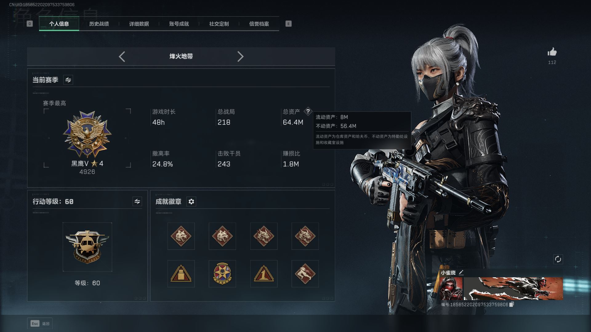 【云游堂】 惠3591320总资产112M,哈夫币3001w,枪皮数量51,战场等级:1 无军衔,行动等级:56 黑鹰,角色皮肤数量1,骇爪-维什戴尔,近战-黑鹰,安全箱等【个人信息】战场等级:1 无军衔,行动等级:56 _黑鹰【哈夫币】3001w【总资产】112M【货币】0三角币/0曼德尔币/105三角券【安全箱】基础安全箱2(1x2)【通行证】通行证免费版【特勤处】制药台Lv.3/工作台Lv.3/仓库Lv.6/防具台Lv.3/训练中心Lv.6/靶场Lv.6/技术中心Lv.3/指挥中心Lv.4/潜水中心Lv.0/收藏室Lv.0【角色皮肤】骇爪-维什戴尔/【已拥有捆绑包】捞点薯条捆绑包/【近战皮肤】近战-黑鹰/【步枪皮肤】SCAR-H战斗步枪-囚徒/M16A4突击步枪-竞赛选手/M4A1突击步枪-阿米娅/腾龙突击步枪-捞点薯条/腾龙突击步枪-猎鳄行动/SCAR-H战斗步枪-启航/SR-3M紧凑突击步枪-战术竞备/【冲锋枪皮肤】勇士冲锋枪-能天使-午夜邮差/勇士冲锋枪-工业狂潮/MP5冲锋枪-战术竞备/【狙击步枪皮肤】SVD狙击步枪-阿萨拉工艺/R93狙击步枪-维什戴尔/SV-98狙击步枪-林中猎手/AWM狙击步枪-捞点薯条/【手枪皮肤】93R-捞点薯条/【挂饰】诡影喷火兵/挂饰-维什戴尔/挂饰-启程/阿萨拉霰弹兵/挂饰-阿米娅/挂饰-来点薯条/阿萨拉徽章/紧急会议/(典藏皮肤颜色请以典藏展示为准,安全箱等时效性道具请以游戏内数据为准)